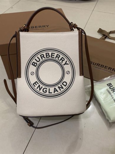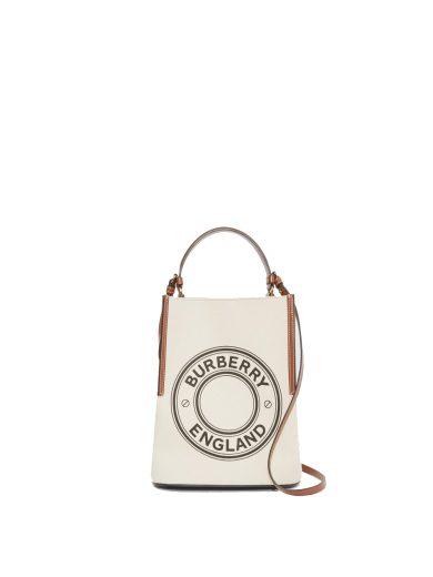 BURBERRY SMALL LOGO GRAPHIC COTTON CANVAS PEGGY BUCKET BAG IN NATURAL/TAN 80268241