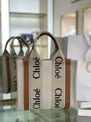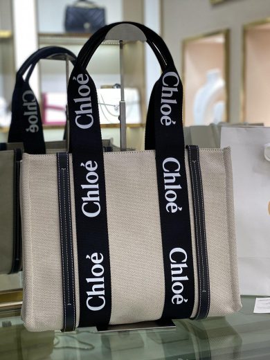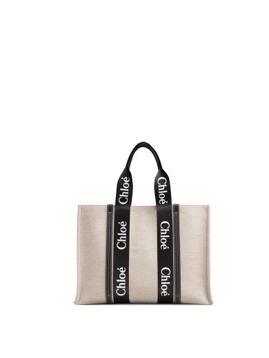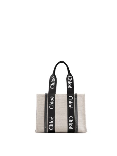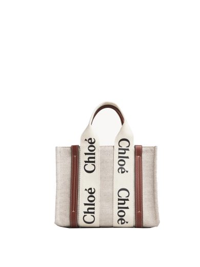CHLOE SMALL WOODY TOTE BAG IN COTTON CANVAS & SHINY CALFSKIN WITH WOODY RIBBON CHC21US385E6690U