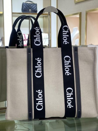 CHLOE MEDIUM WOODY TOTE BAG IN COTTON CANVAS & SHINY CALFSKIN WITH WOODY RIBBON BLACK & BLUE CHC21US383E66925