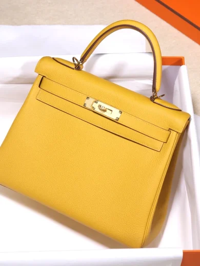 HERMES KELLY 32 TOGO RETOURNE LEATHER GOLD HARDWARE AMBRE