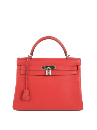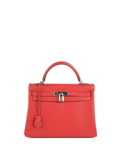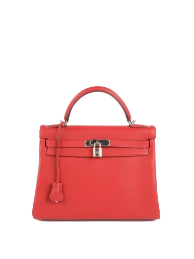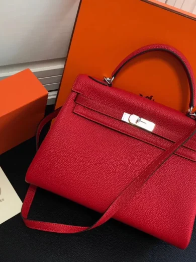 HERMES KELLY 32 TOGO RETOURNE LEATHER SILVER HARDWARE ROUGE CASAQUE