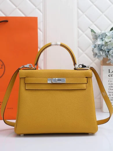 HERMES KELLY 25 TOGO RETOURNE LEATHER SILVER HARDWARE AMBRE