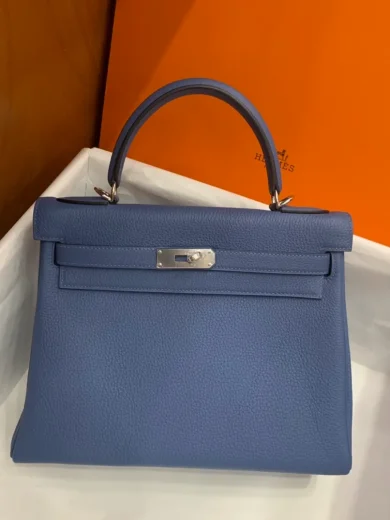 HERMES KELLY 32 TOGO RETOURNE LEATHER SILVER HARDWARE BLUE AGATE