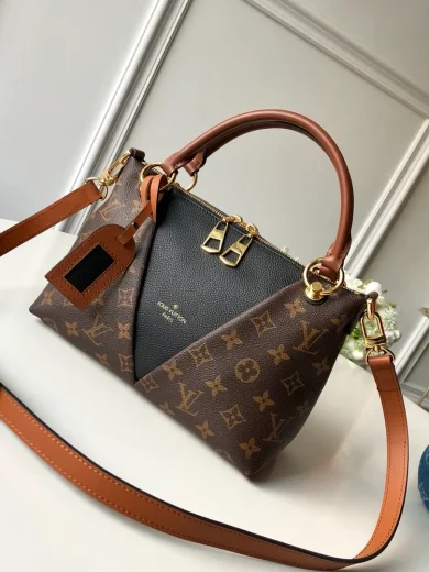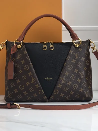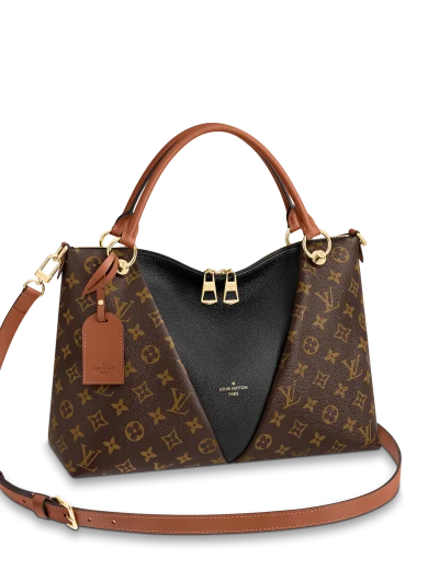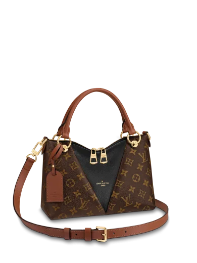 LOUIS VUITTON V TOTE HANDBAG MONOGRAM CANVAS CALFSKIN BLACK CARAMEL M43976