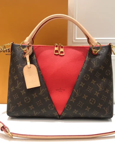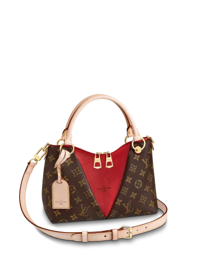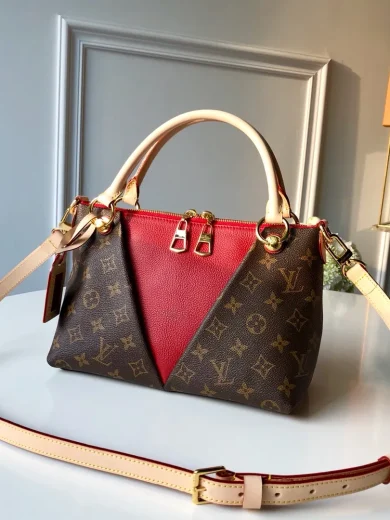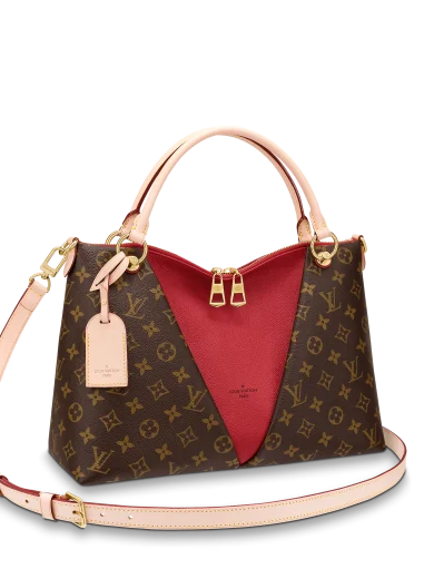 LOUIS VUITTON V TOTE HANDBAG MONOGRAM CANVAS CALFSKIN CERISE RED M43966