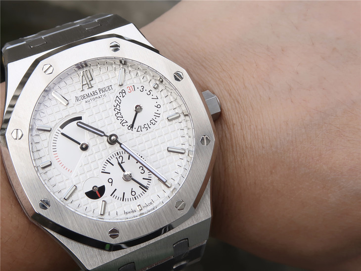 The Royal Oak Dual Time has a 39mm octagonal case with a solid case back, which hides the self-winding caliber AP 2329 with module 2846.