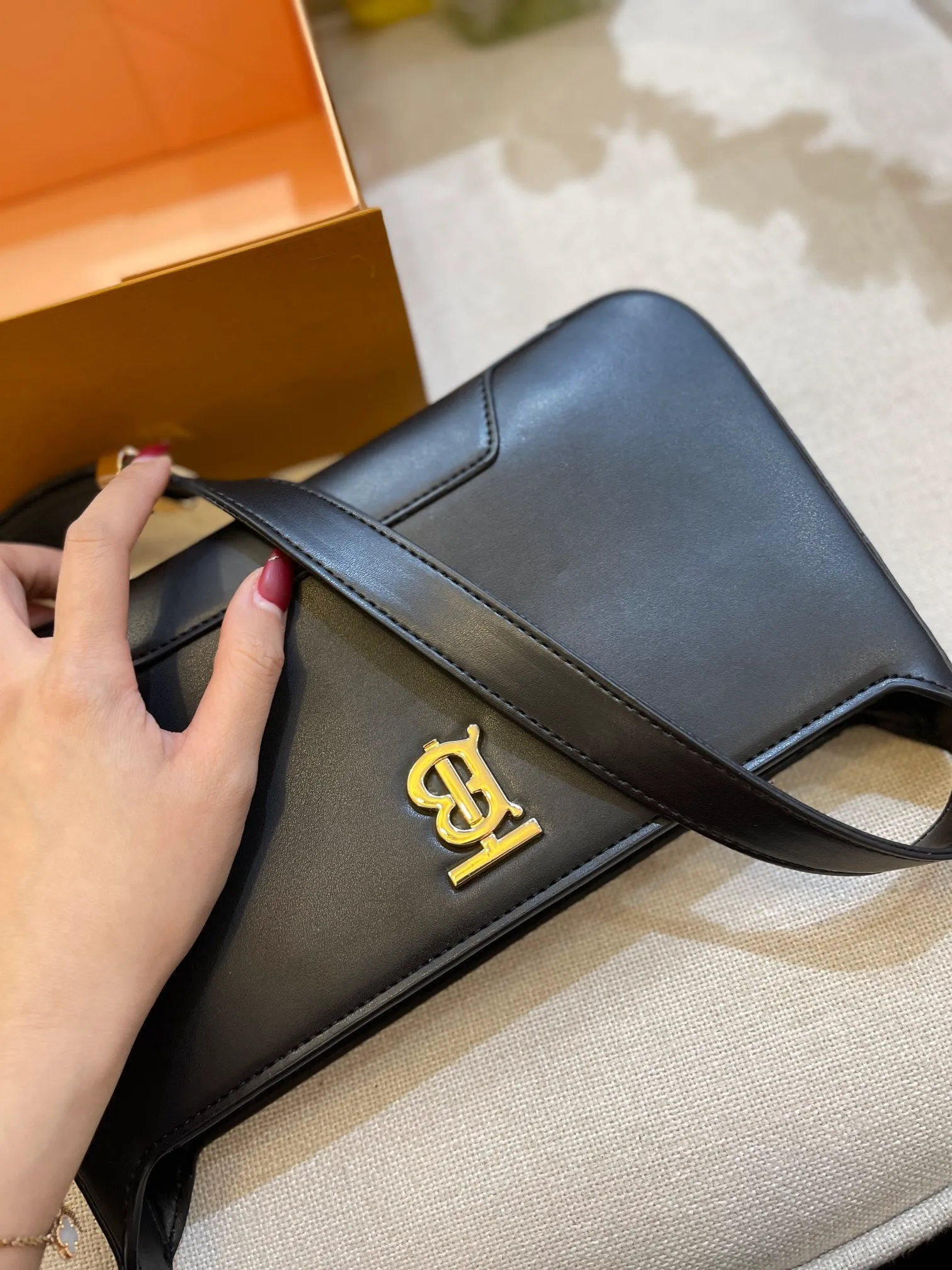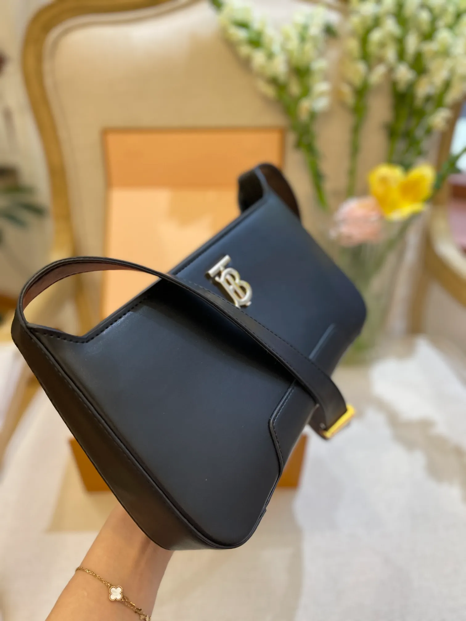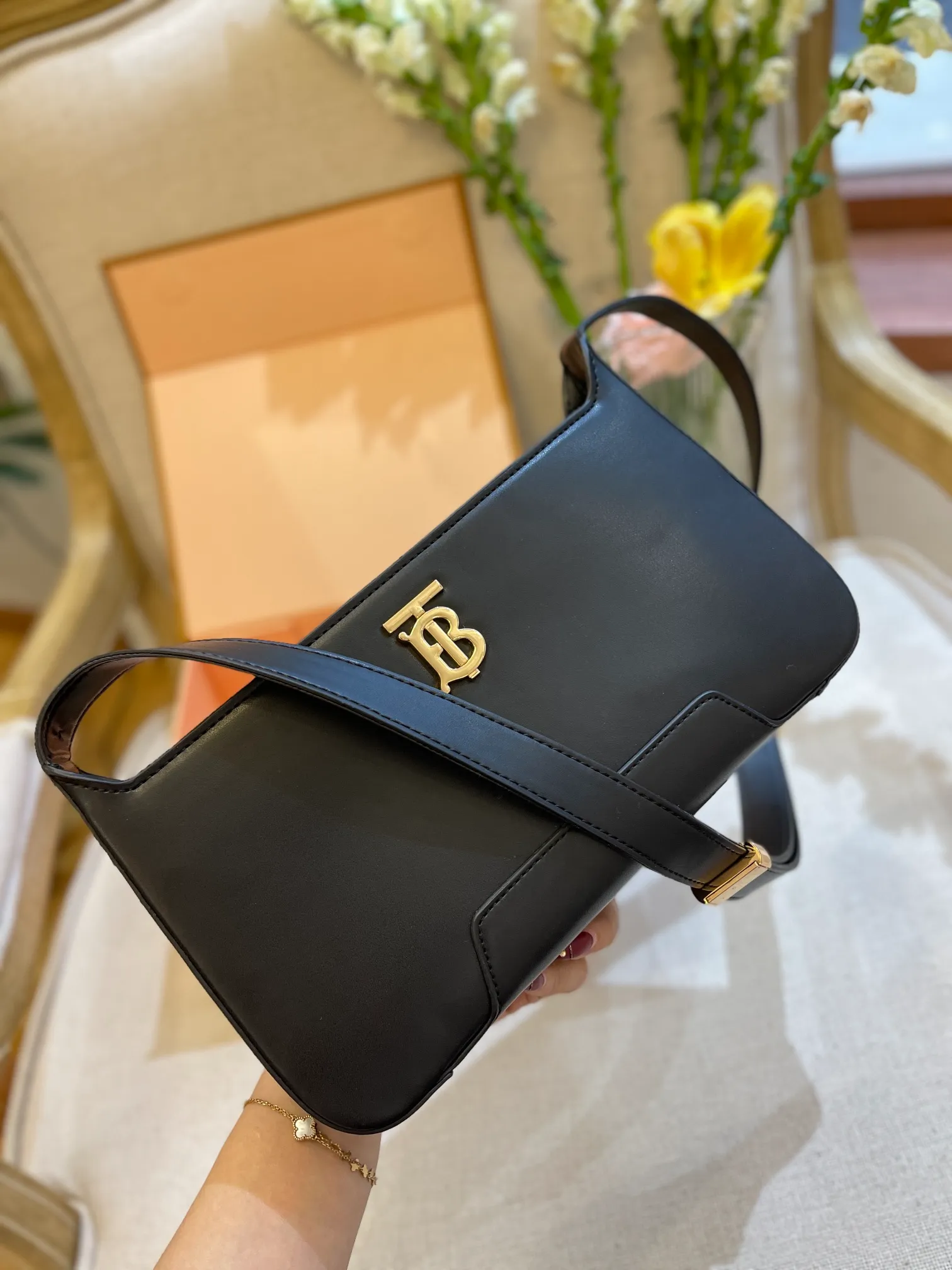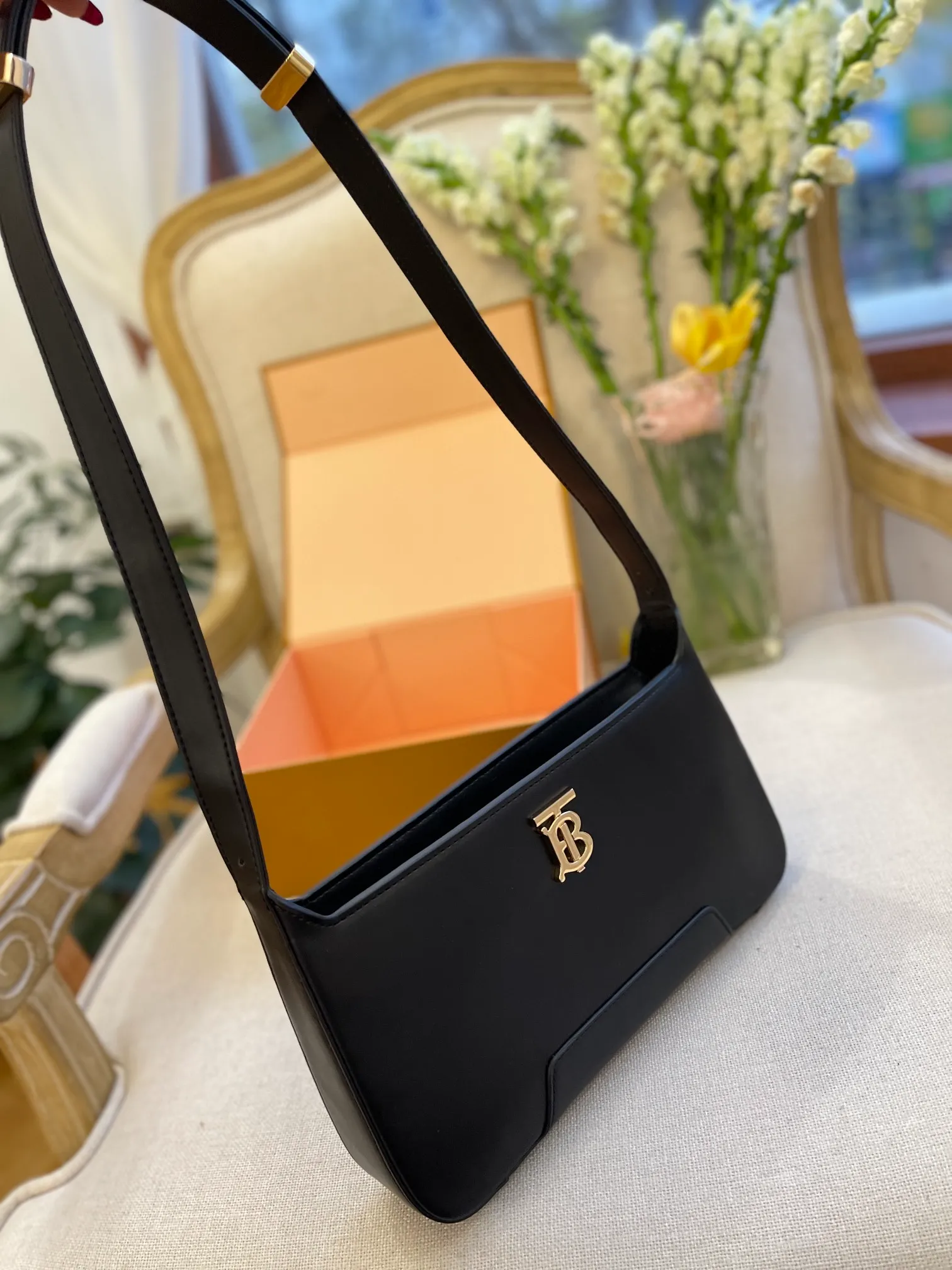 A structured shoulder bag in smooth leather, accented with our Thomas Burberry Monogram. The versatile design features an adjustable shoulder strap.