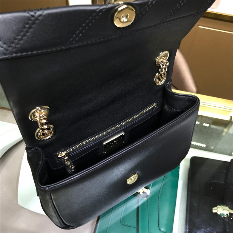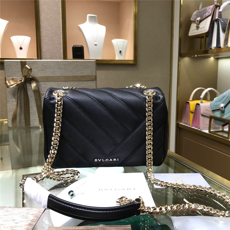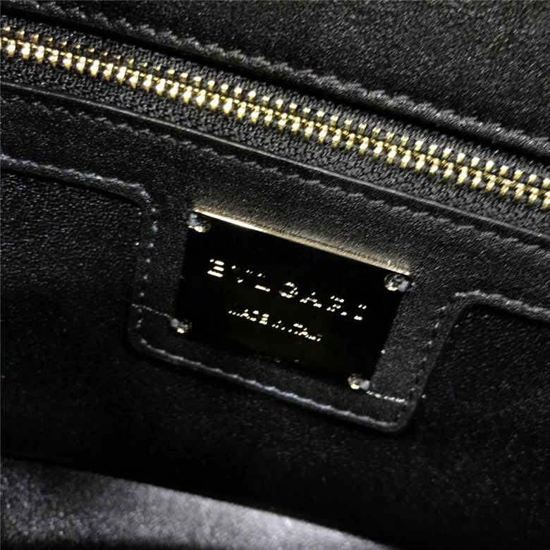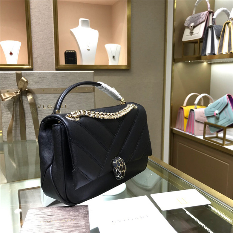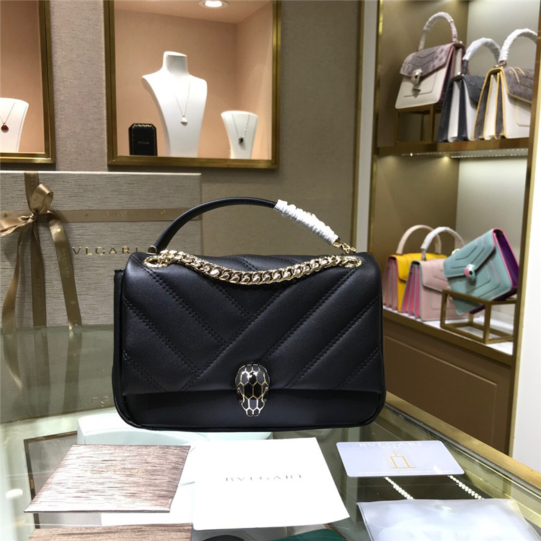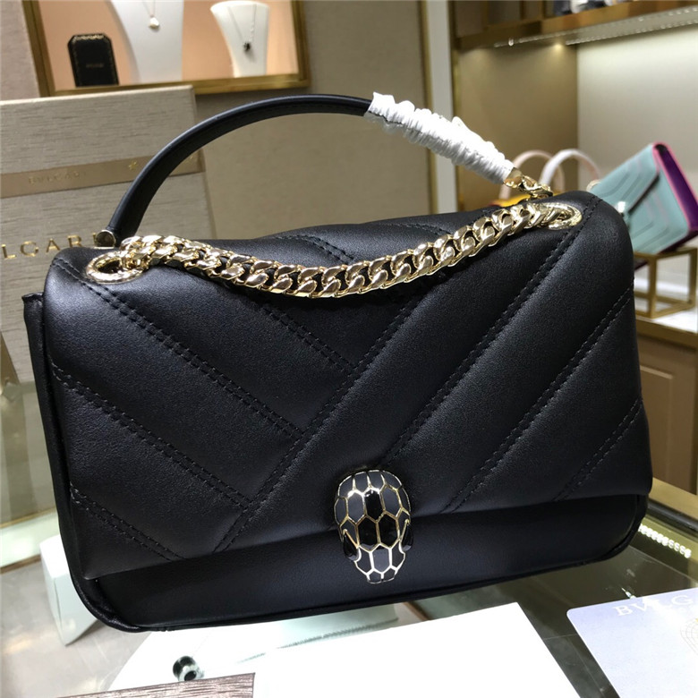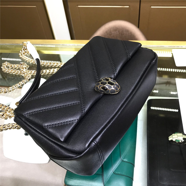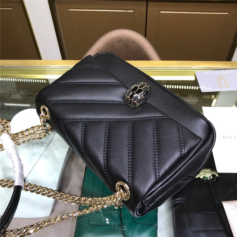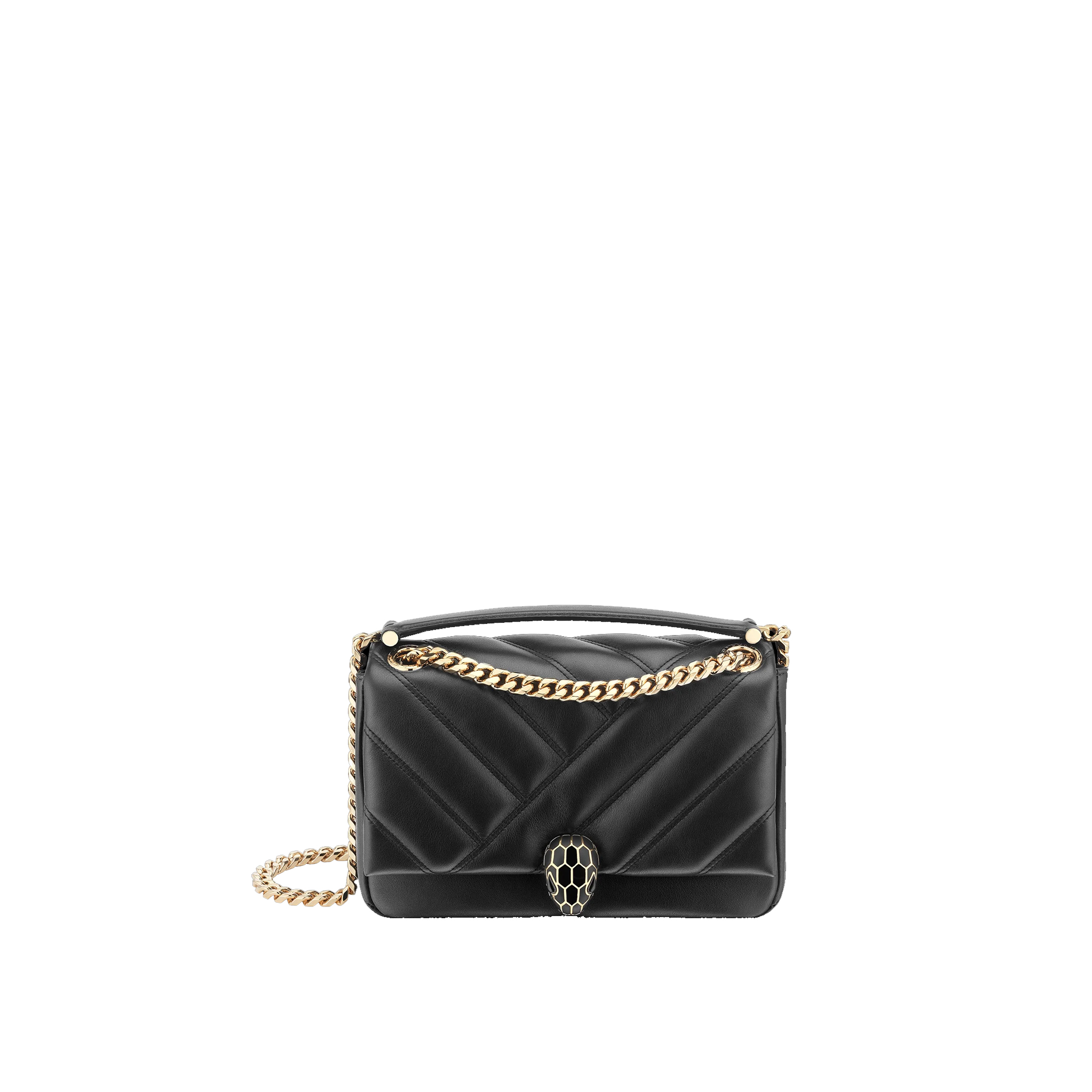 Embodying the perfect balance between jewelery sophistication, casual charm and innate glamor, the Serpenti Cabochon shoulder bag stands out with its soft and exquisite lines evoking the smooth surface of Bvlgari’s iconic cabochon cut. The lovely quilted pattern in soft black nappa leather brings a three-dimensional effect, while the iconic Serpenti clasp in rose gold-plated brass fascinates with its matte and shiny black enamel scales with onyx eyes. The perfect accessory for a sophisticated daytime look, the bag features a chunky chain and two comfortable leather shoulder straps for added versatility. Small model with a gusseted compartment, a zipped pocket inside, an open pocket and a metal plaque with the Bvlgari logo inside. Dimensions: 22.5 x 15 x 10 cm.