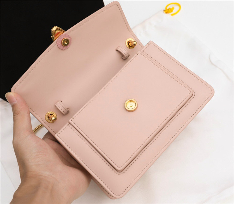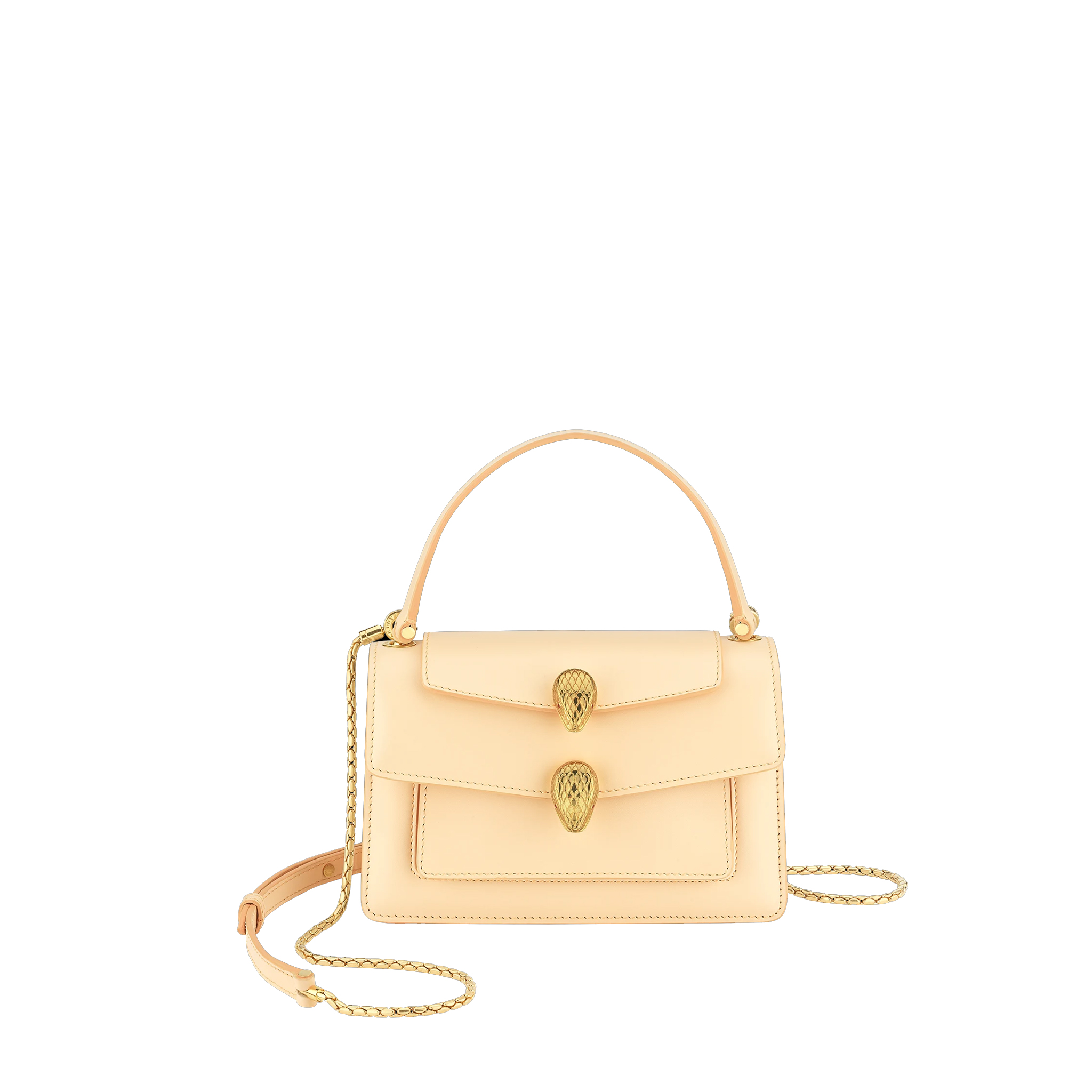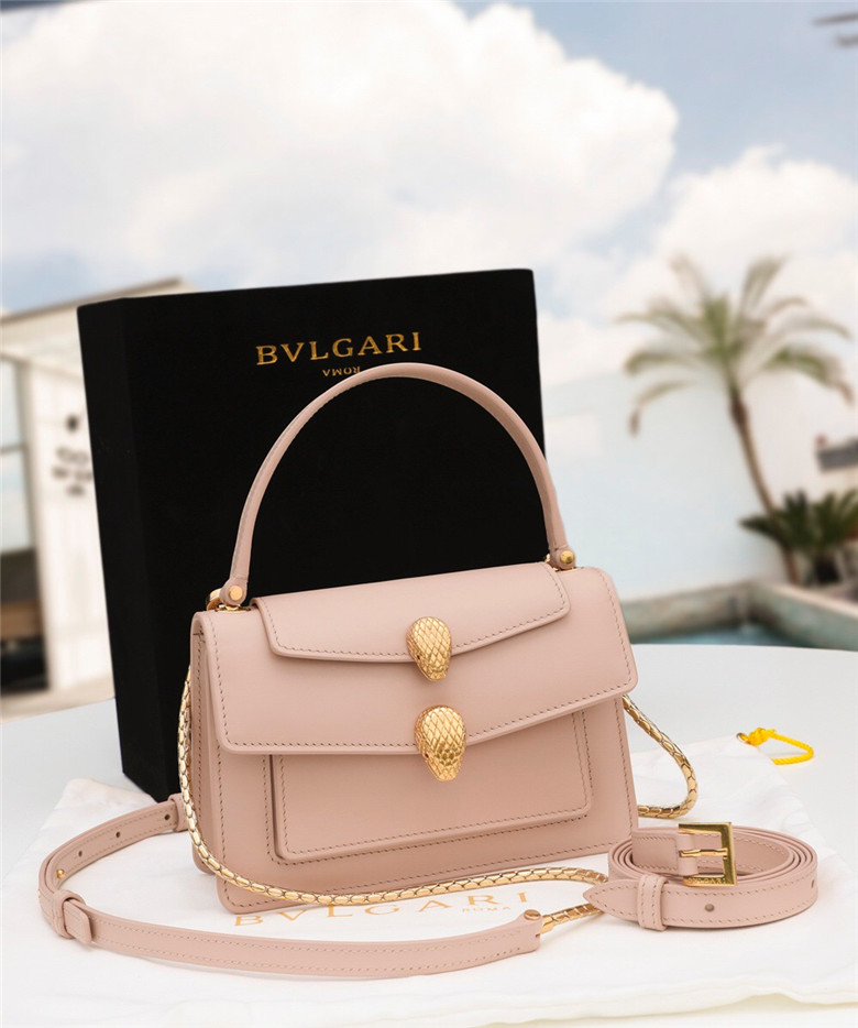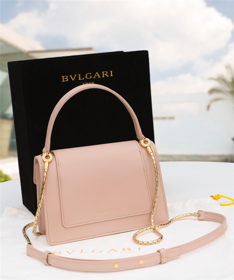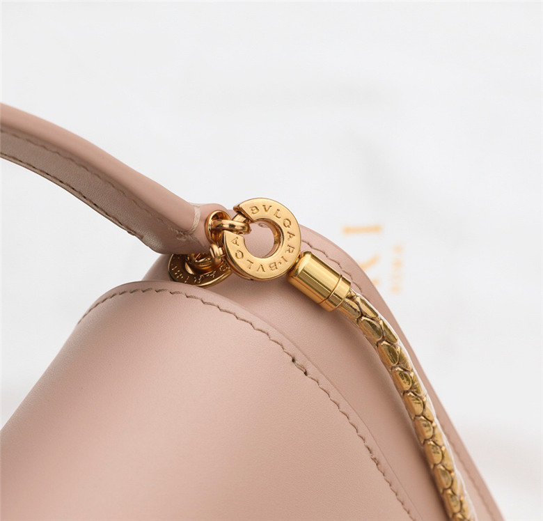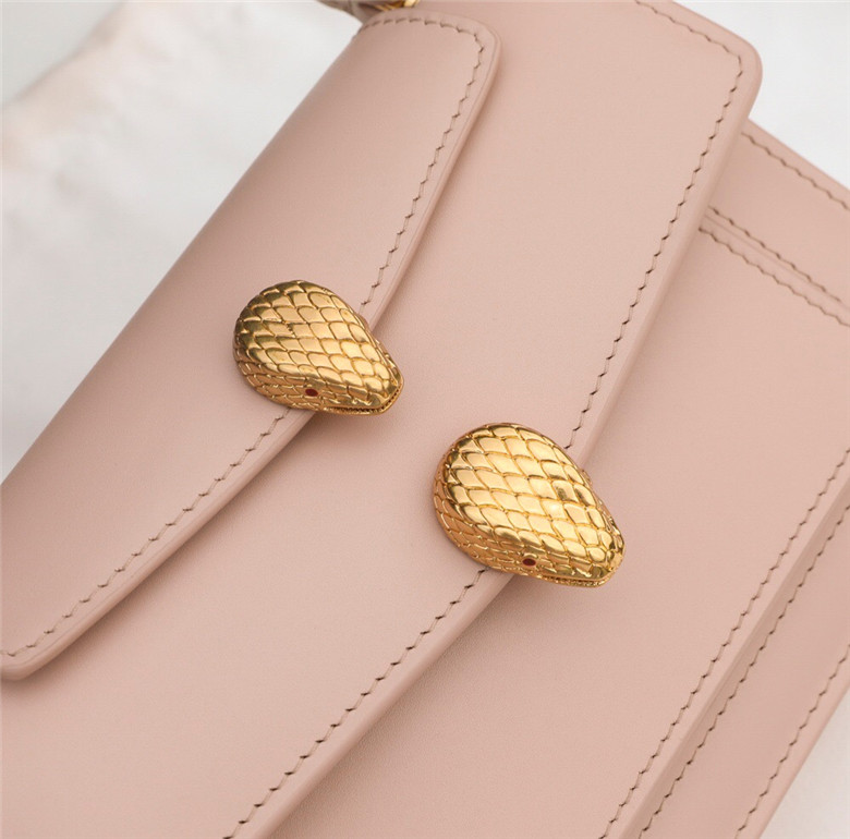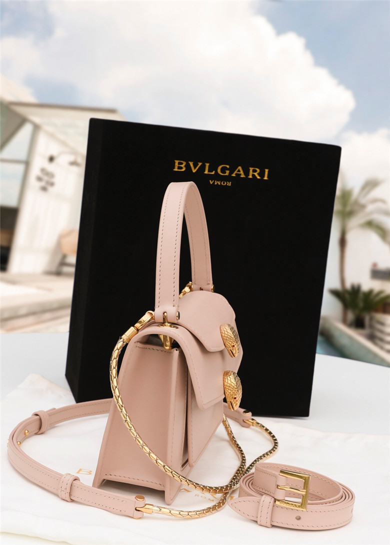For the “Serpenti Through the Eyes of…” series, Alexander Wang reimagines the iconic Serpenti motif to create an edgy capsule collection. Crafted in smooth peach calf leather, the belt bag is the perfect combination of functionality and a cool and trendy attitude. Taking inspiration from a Bvlgari heritage watch from the 1960s, Alexander Wang designed this model with two new Serpenti head closures in antique gold-plated brass with tempting red enamel eyes. This bag features a detachable handle, belt, chain and leather strap, for versatile wearability as a top handle and a crossbody. A single gusset, two open pockets and a hot stamped “Alexander Wang BVLGARI” logo complete this model. Small size. 19 x 13 x 6.5 cm – 7.5 x 5.1 x 2.6″
