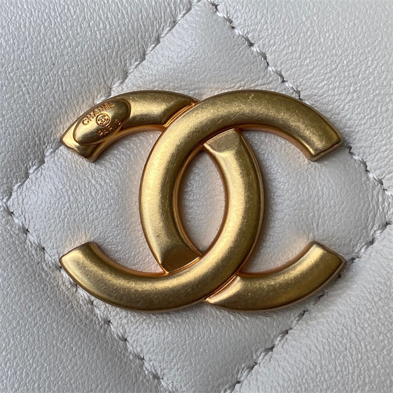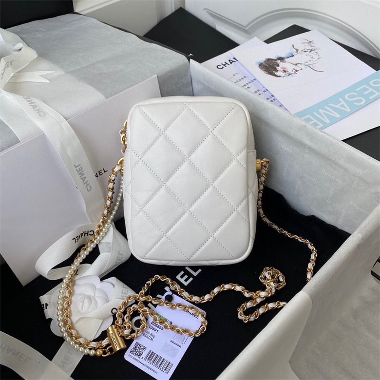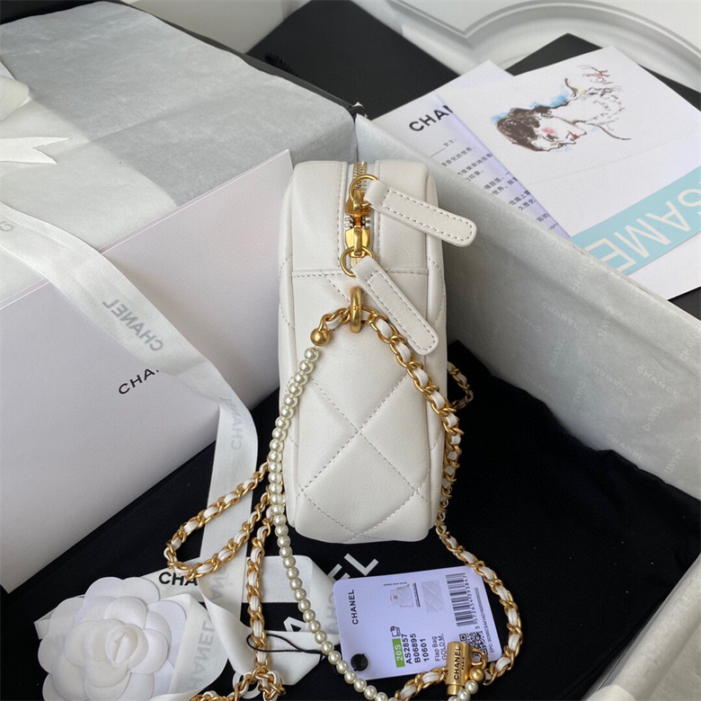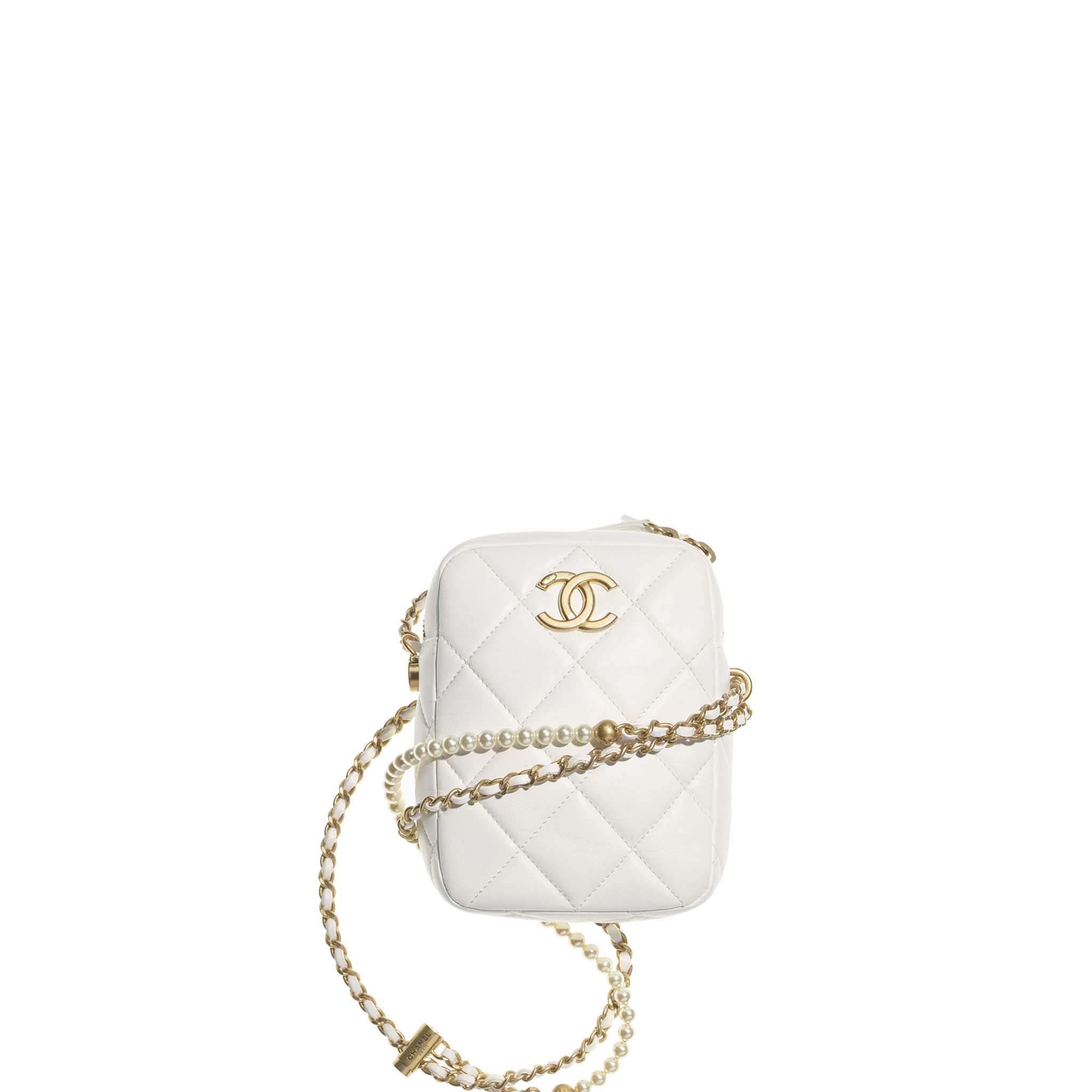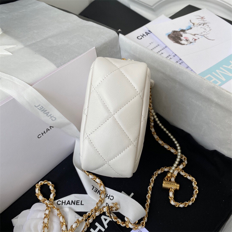 CHANEL MINI CAMERA CASE LAMBSKIN IMITATION PEARLS & GOLD METAL WHITE AS2857 B06895 10601