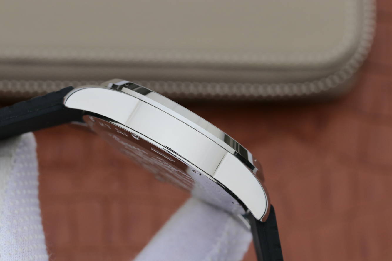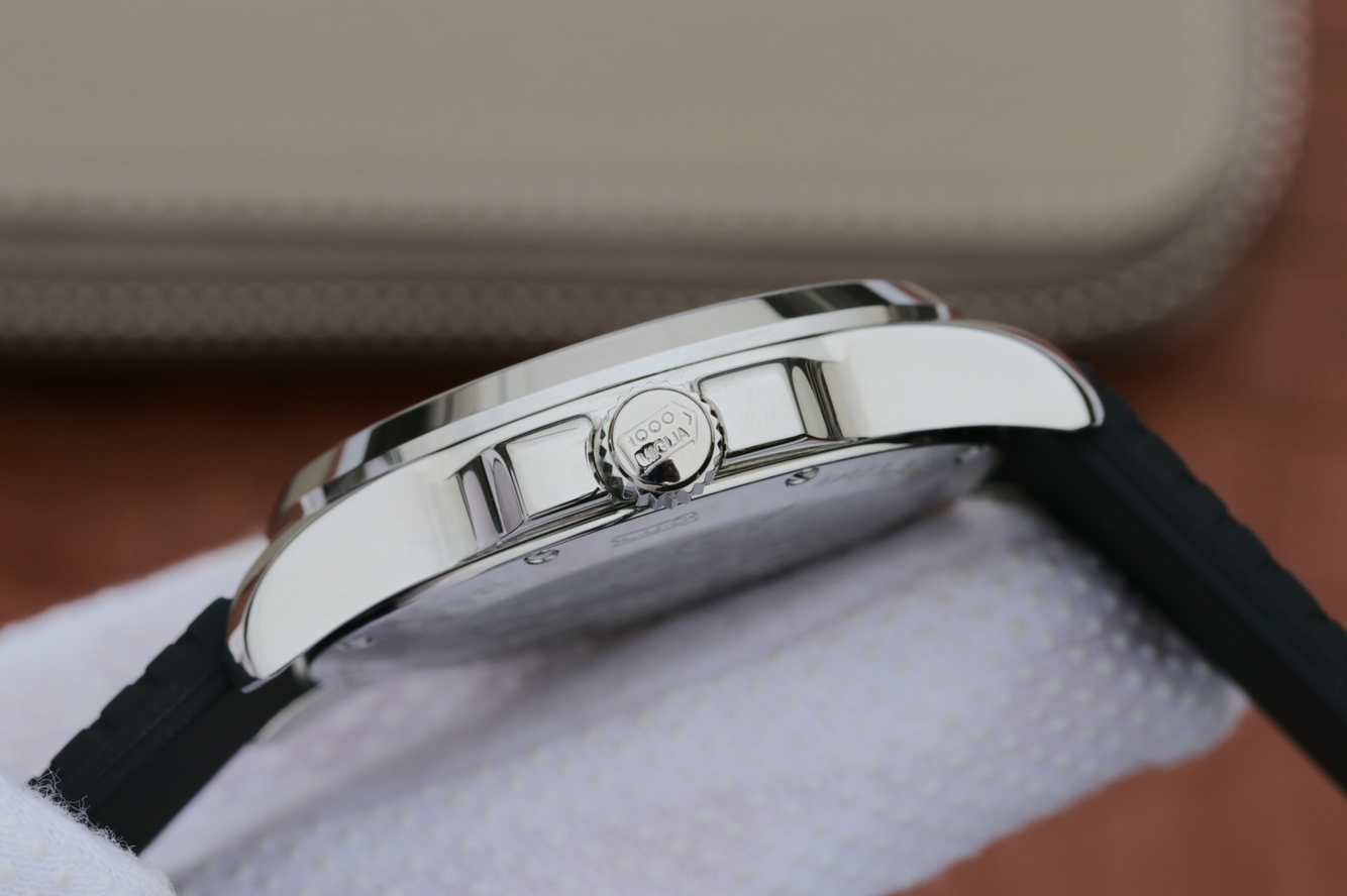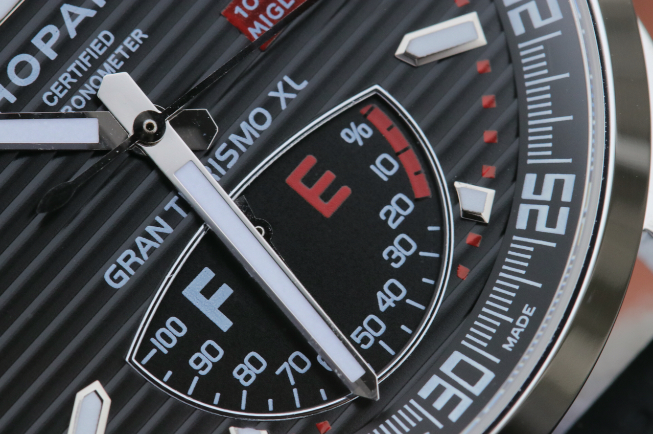 The Mille Miglia GT XL Power Control watch in stainless steel displays a remarkable blend of symmetry and simplicity. Opposite the oversized white 12 numeral on the black dial, a power reserve indicator designed like a petrol gauge on the dashboard of a vintage car is a stylish nod to automotive design. Its style is matched by mechanical prowess, with precision guaranteed by the chronometer certification.