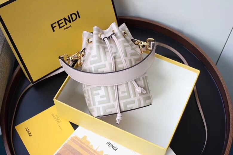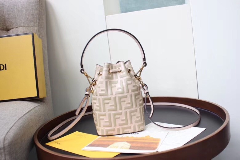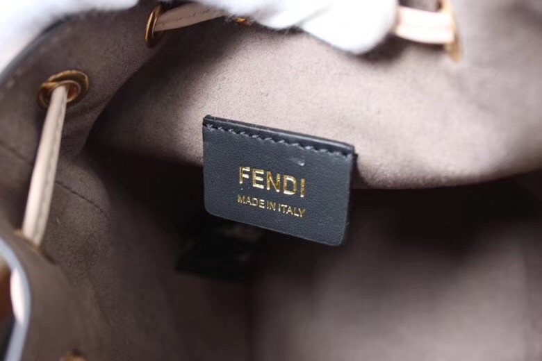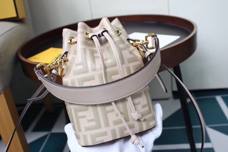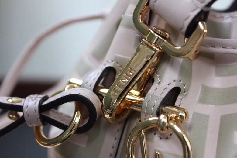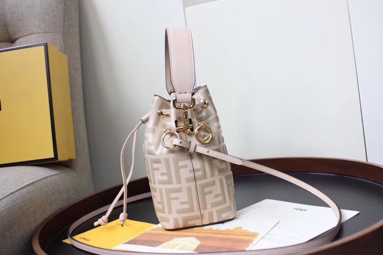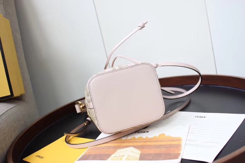 Small Mon Tresor bucket bag with drawstring fastening and metal decorations in the Fendi logo shape. Two detachable shoulder straps, one long and one short, to wear the bag over the shoulder or cross-body. Made of beige leather. Finished with embossed FF motif print and hand painted in pink. Gold-finish metalware.