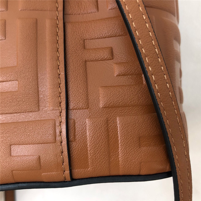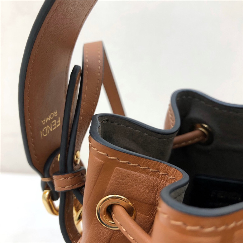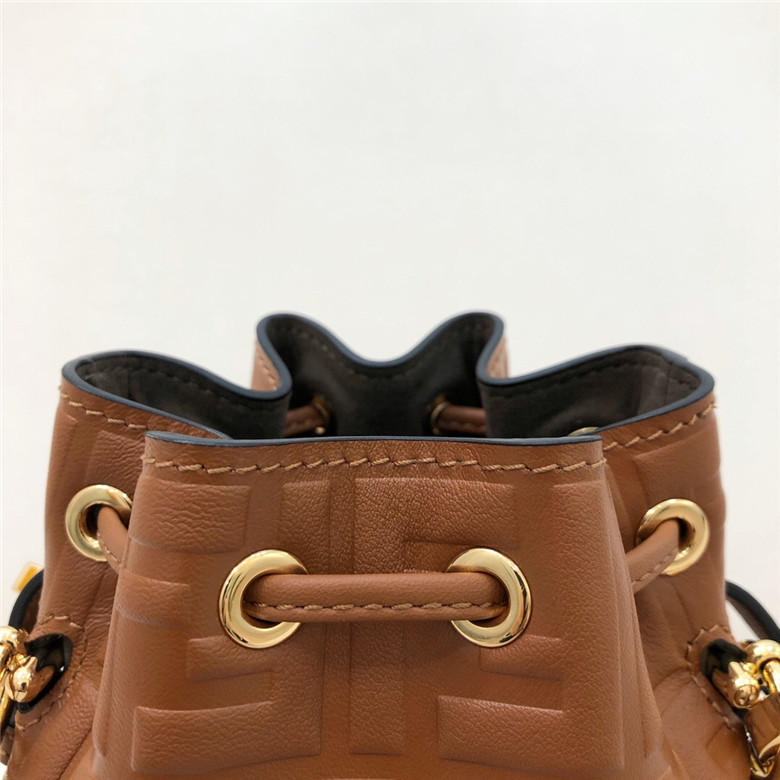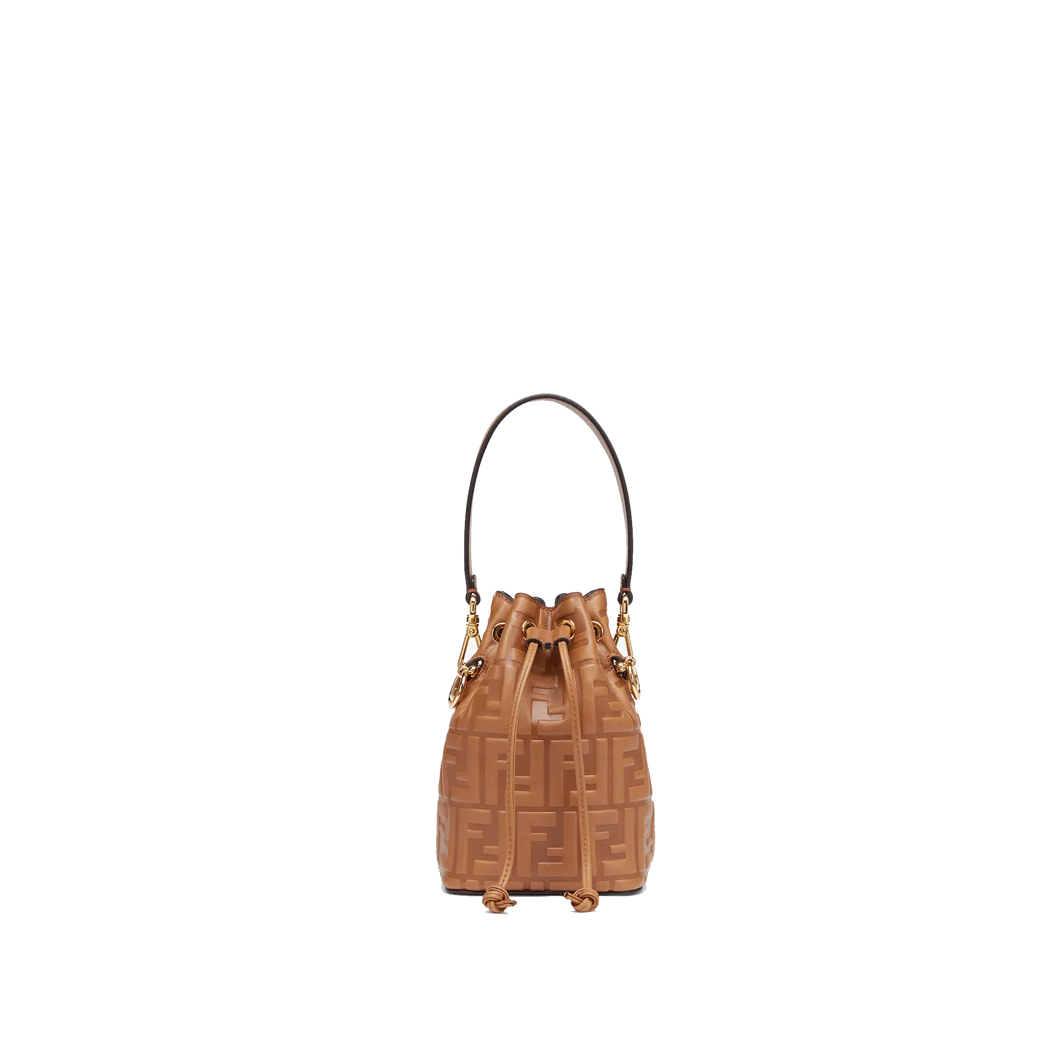 Small Mon Tresor bucket bag with drawstring fastening and metal decorations in the Fendi logo shape. Two detachable shoulder straps, one long and one short, to wear the bag over the shoulder or cross-body. Made of natural-colour leather. Finished with embossed FF motif. Gold-finish metalware.