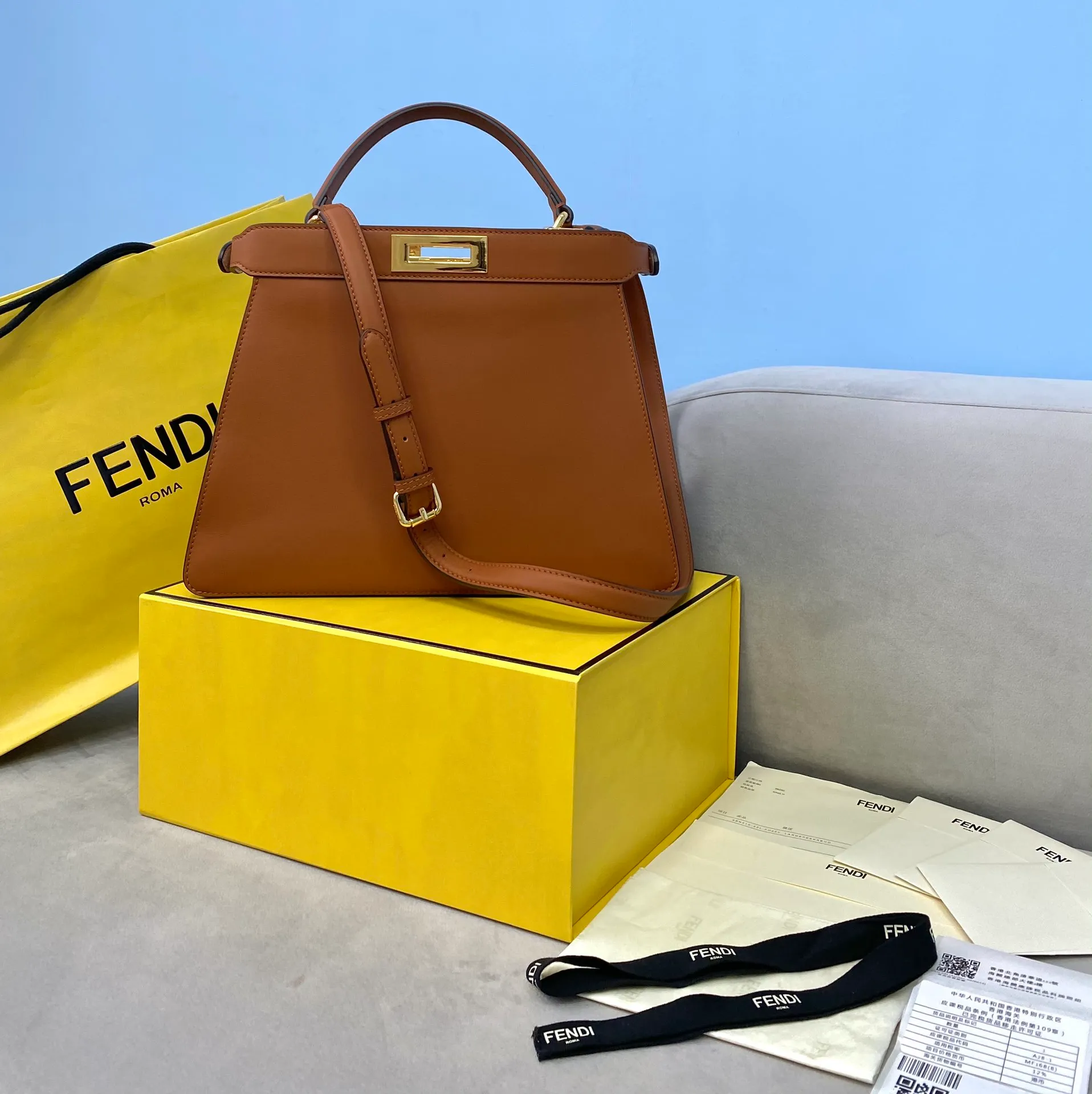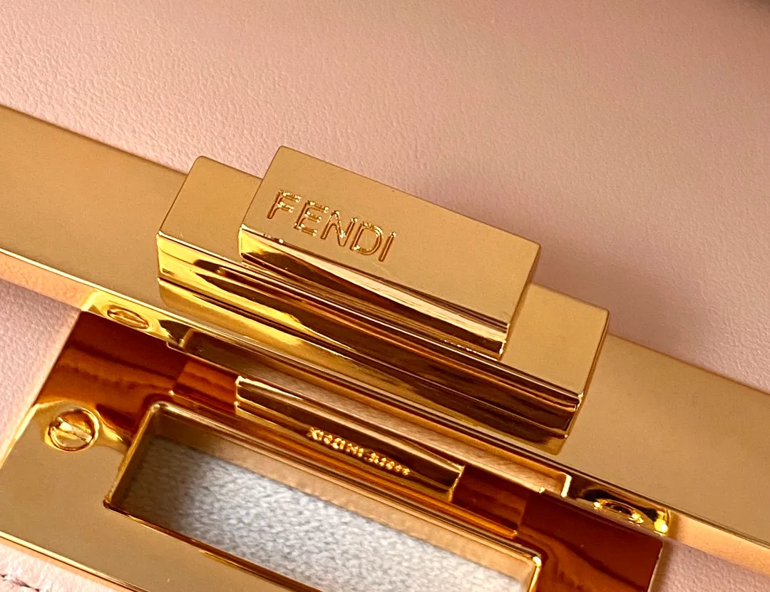Iconic Peekaboo ISeeU bag, medium size, made of brown leather and embellished with the classic twist lock on both sides. Featuring a soft pink nappa leather lining visible from the outside, two compartments separated by a stiff partition, a removable and customisable inner pocket, gold-finish metalware. Can be carried by hand or on the shoulder thanks to its handle and the adjustable, detachable shoulder strap.