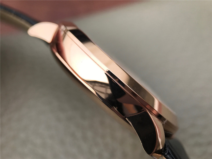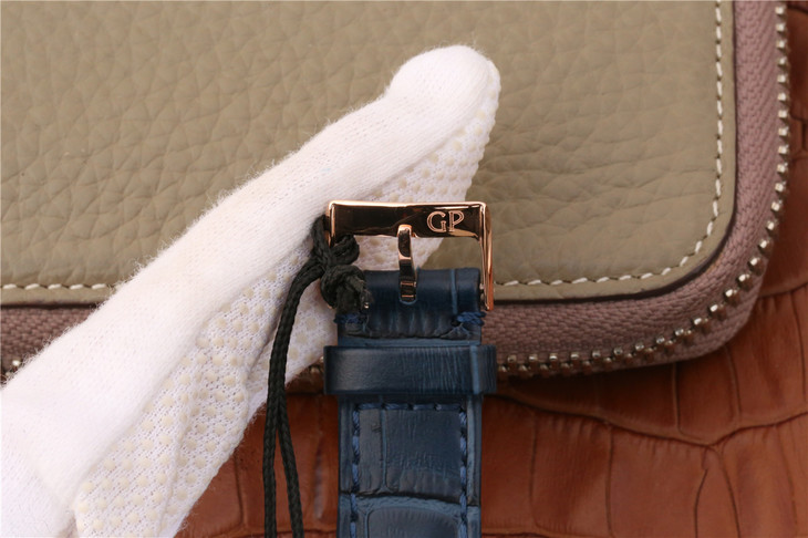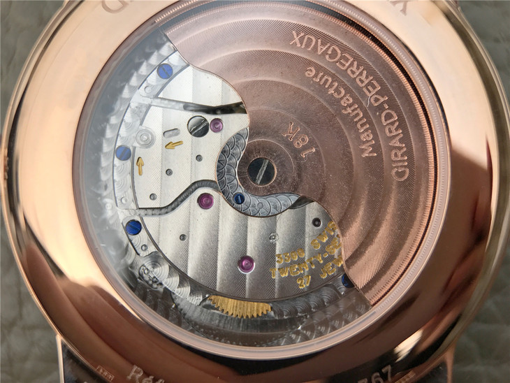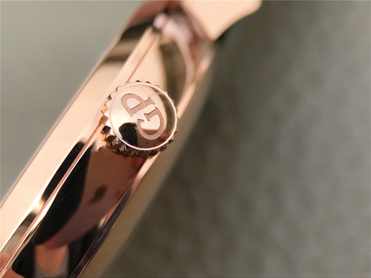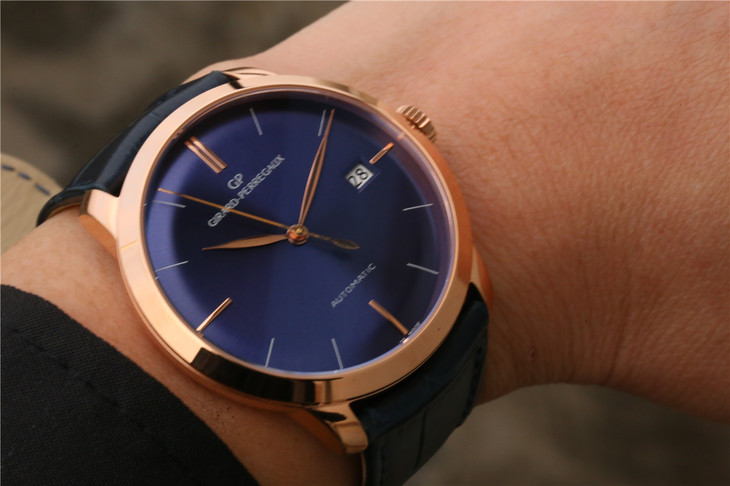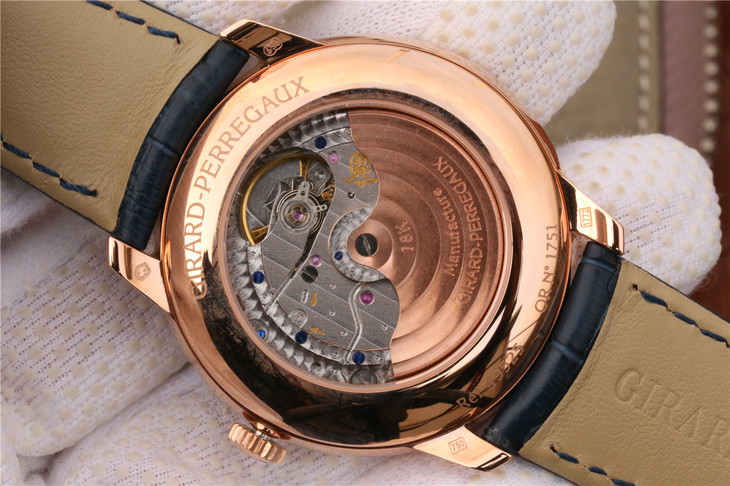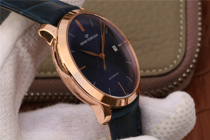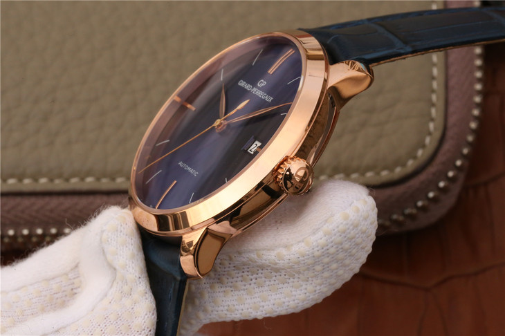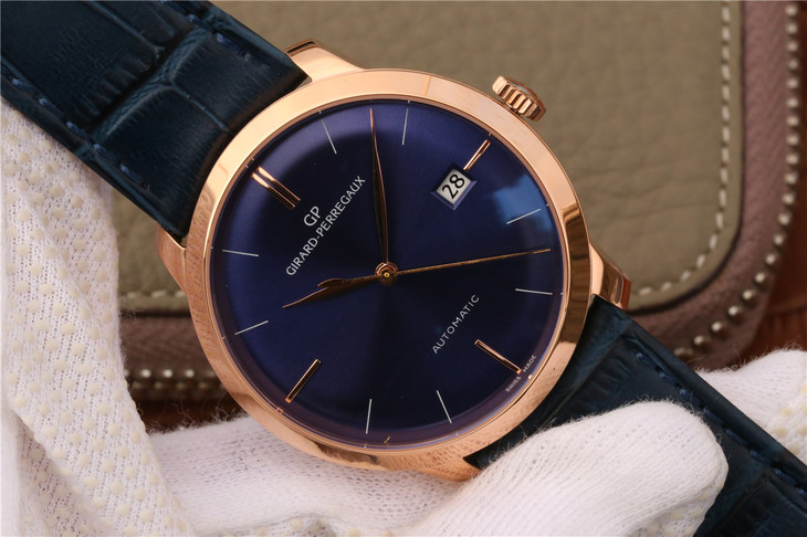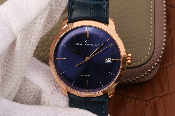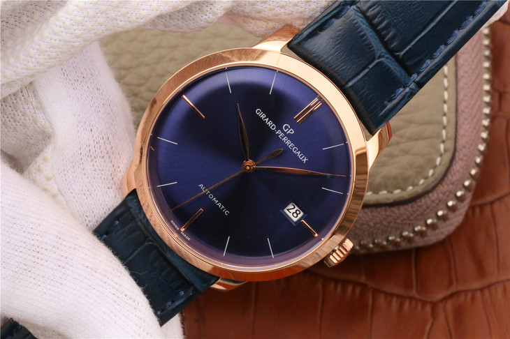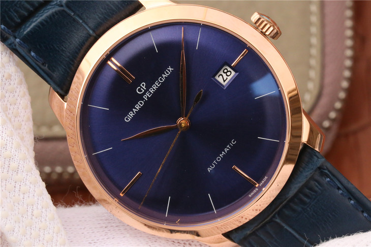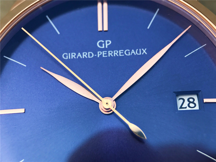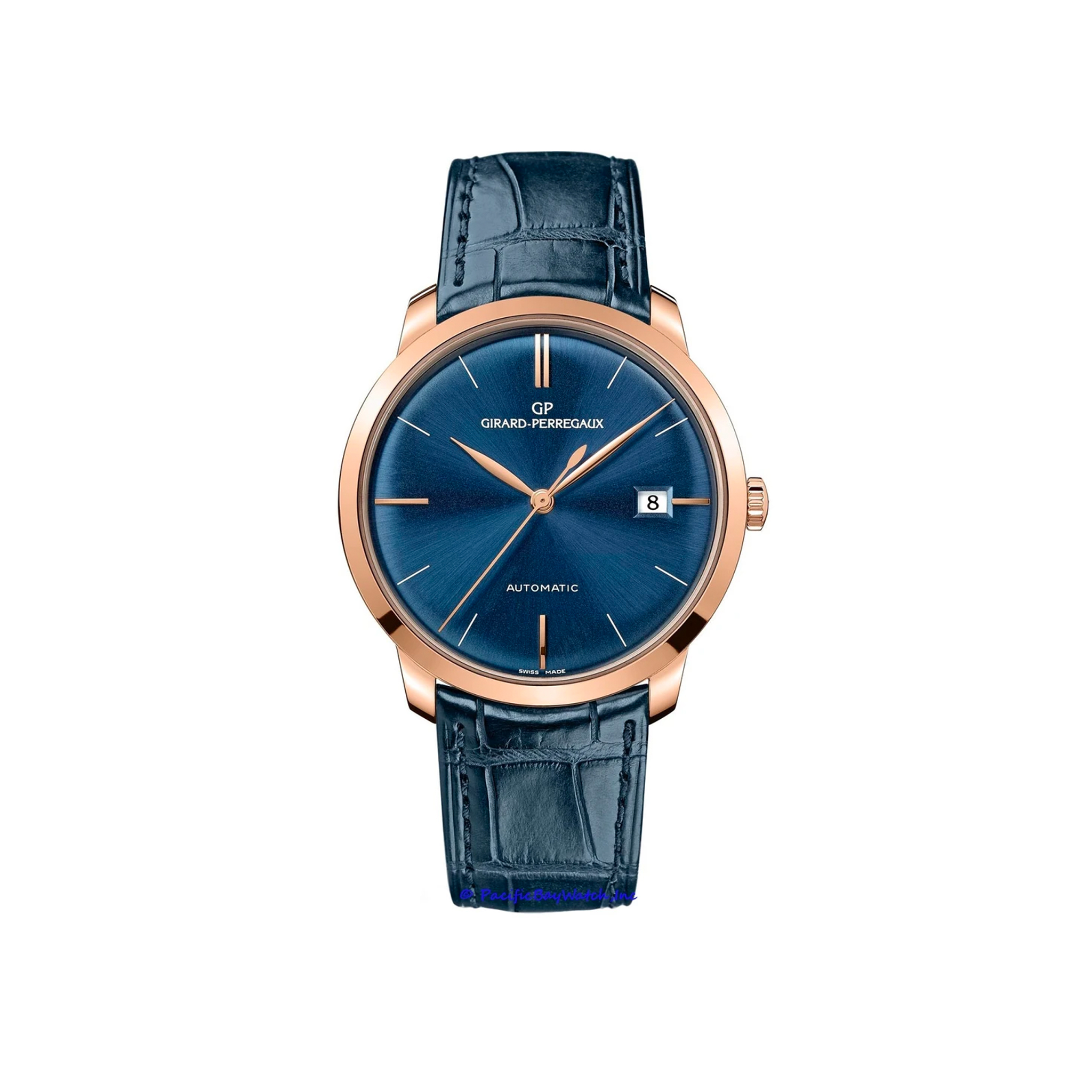 Size-wise slightly reduced version of Girard Perregaux’ classic 1966 model, with 38mm pink gold case. In this version it is fitted with a blue, sunburst dial.. The markers at 3, 6, 9 and 12 o’clock are applied. Automatic movement caliber 3300 displays the hours, minutes, central seconds and date. A ladies version of 30mm is also available.