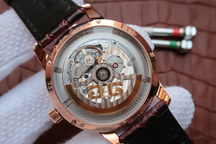 A specially formed sapphire crystal case back, which the Saxon Manufactory first presented in the Sixties collection, is a feature of the models as well, permitting enhanced, broader views of the Calibre 39-52, which powers the Sixties.