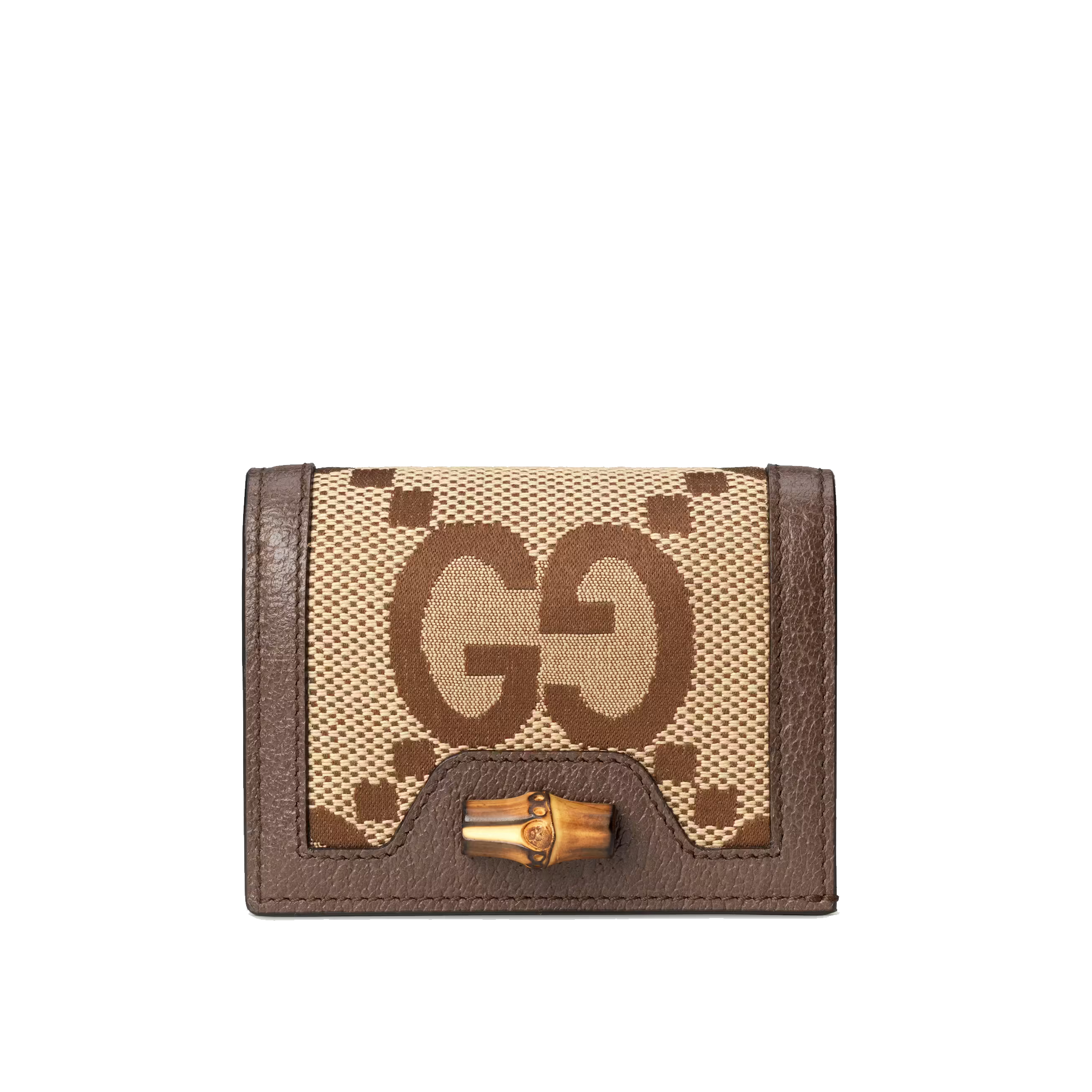 Paying homage to a material at the heart of Gucci’s heritage, this card case wallet is defined by its bamboo closure. Crafted from camel and ebony jumbo GG canvas, the accessory adds a contemporary twist to the design by playing with dimensions and is completed by Guccio Gucci’s monogram hardware.