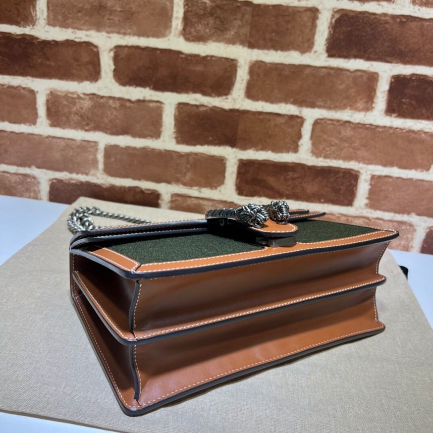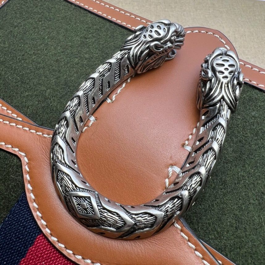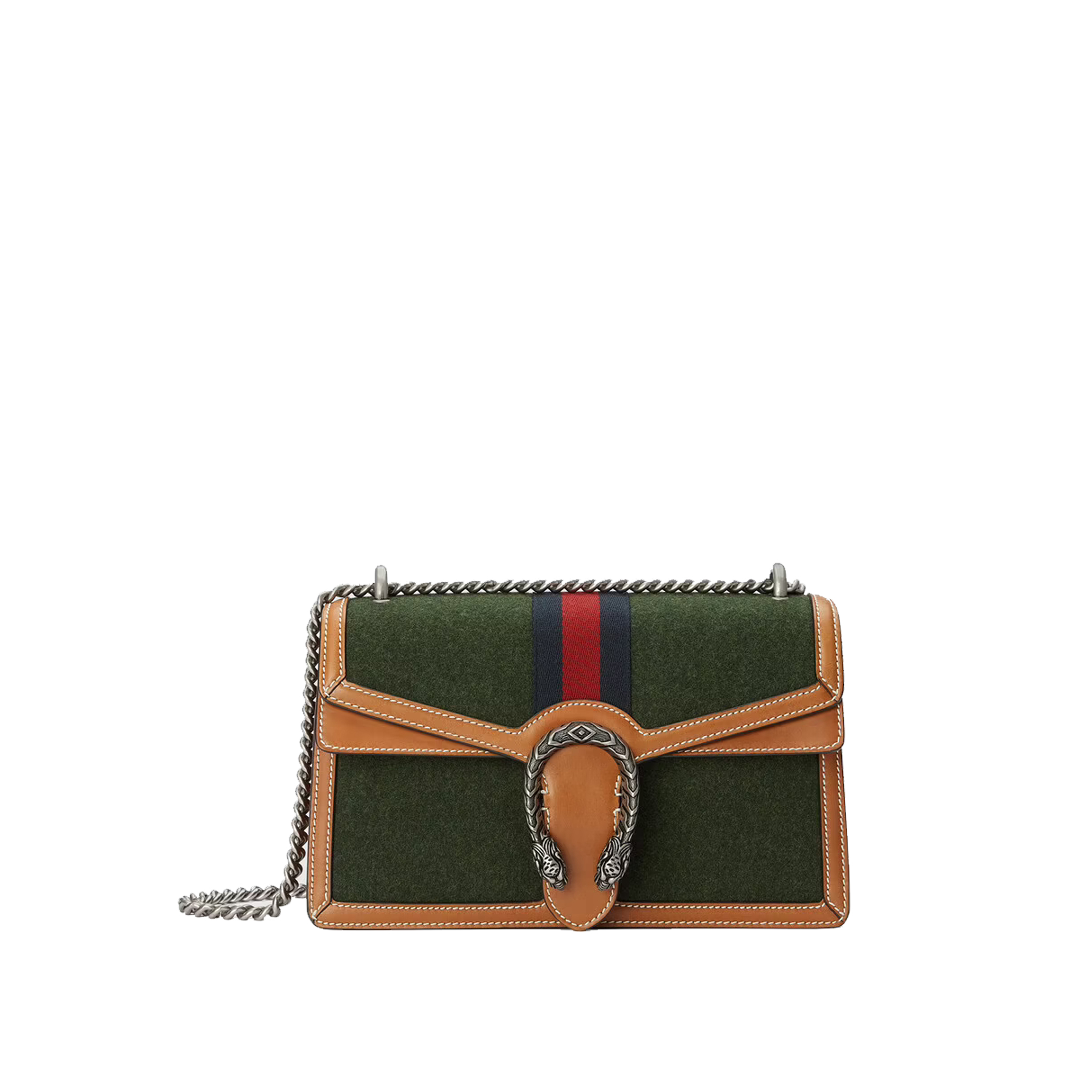 A member of the Beloved family, the Dionysus tells a part of the House’s story. The shoulder bag was introduced in Alessandro Michele’s first collection in Fall Winter 2015. Since then the style has enriched each collection, its signature hardware paired with new colors and materials. Here, the design is presented in green wool with brown leather accents.