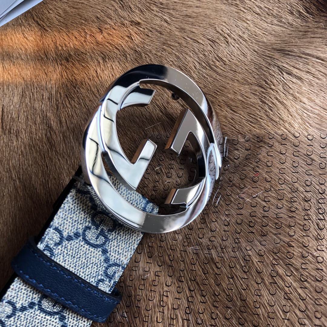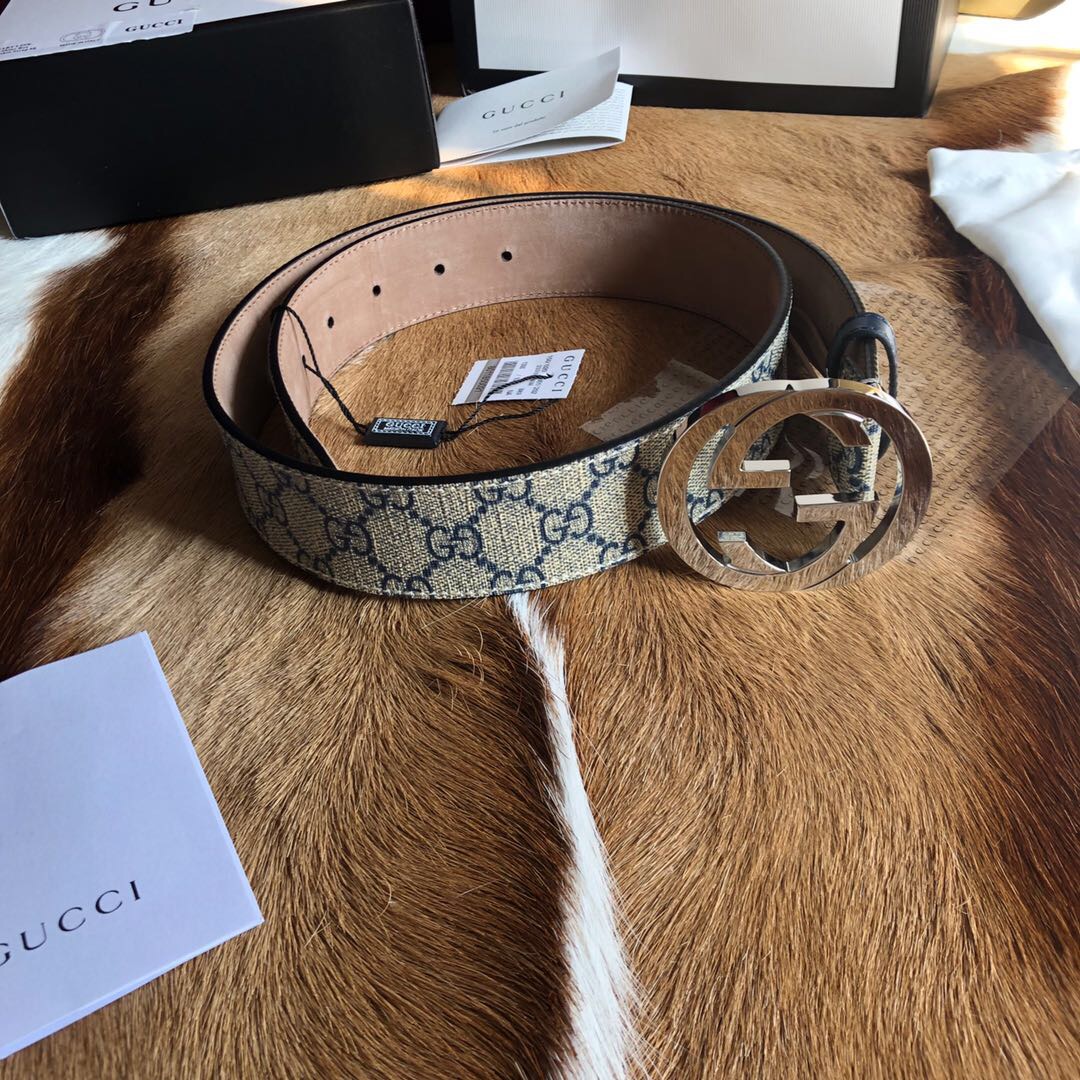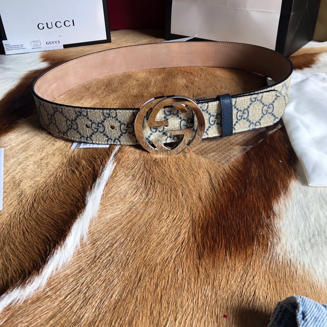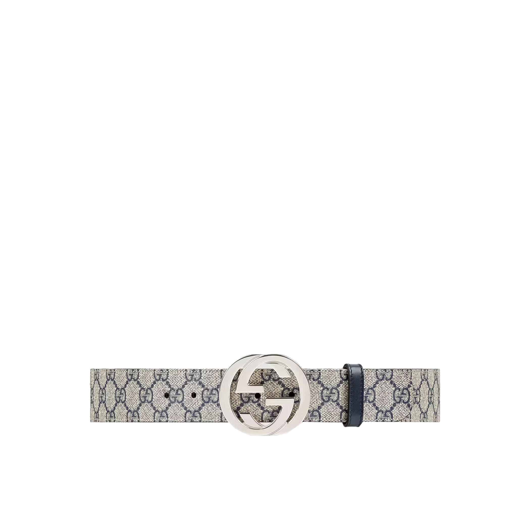 Our GG Supreme canvas is offered in a beige and blue combination, finished with an interlocking G buckle.