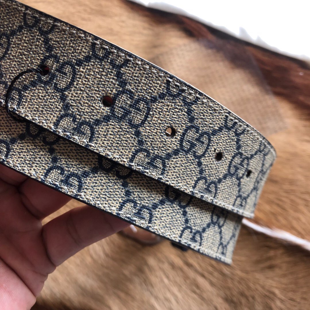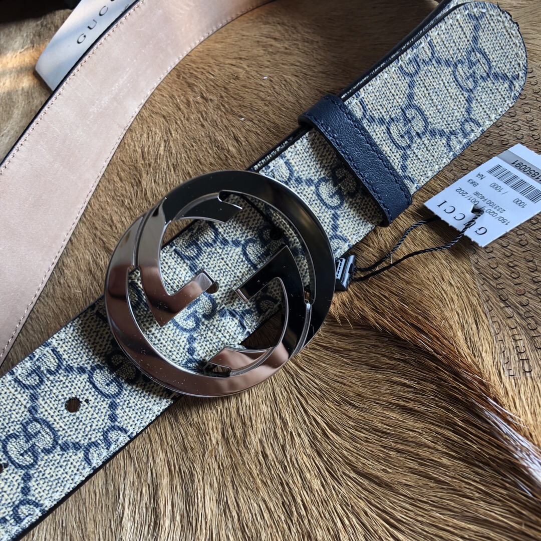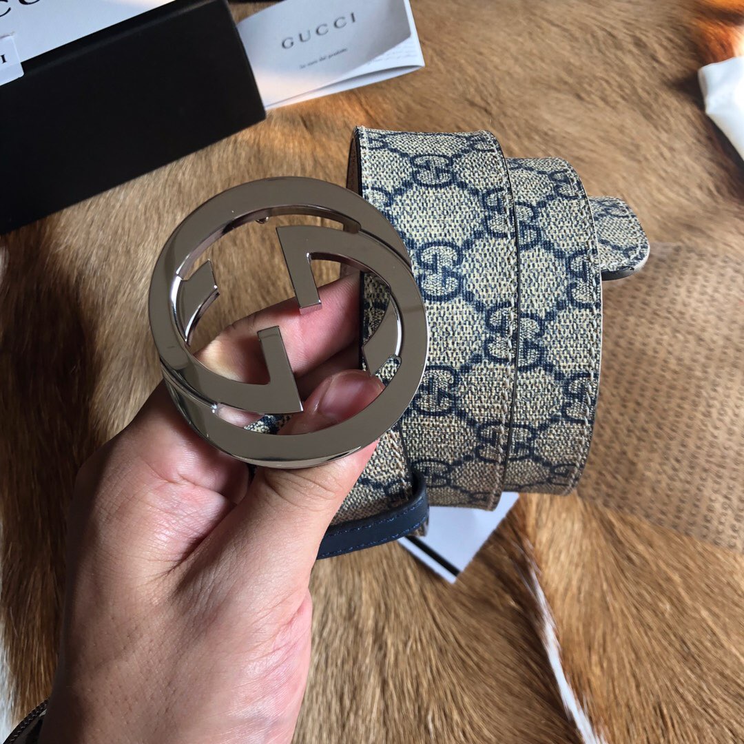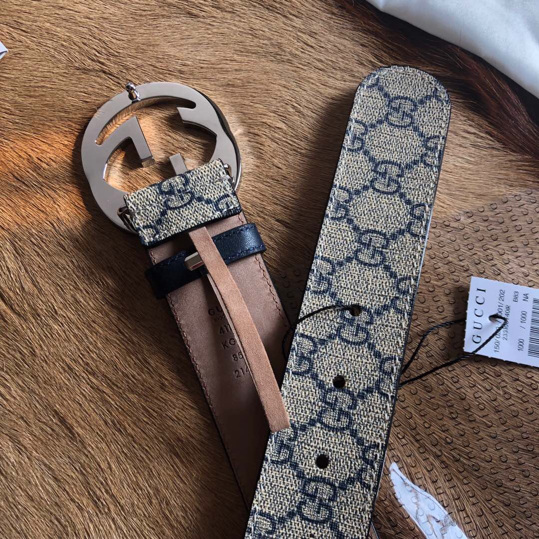 Our GG Supreme canvas is offered in a beige and blue combination, finished with an interlocking G buckle.