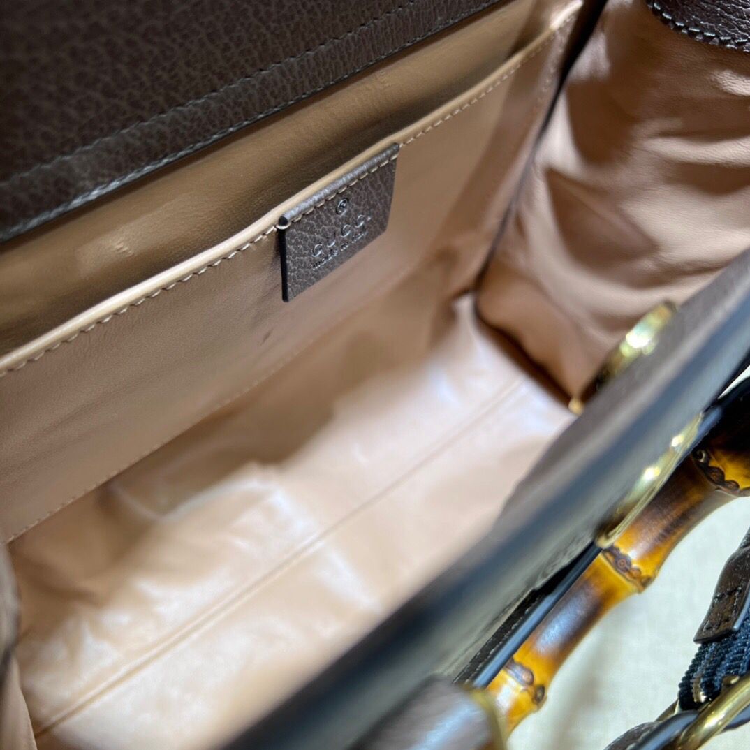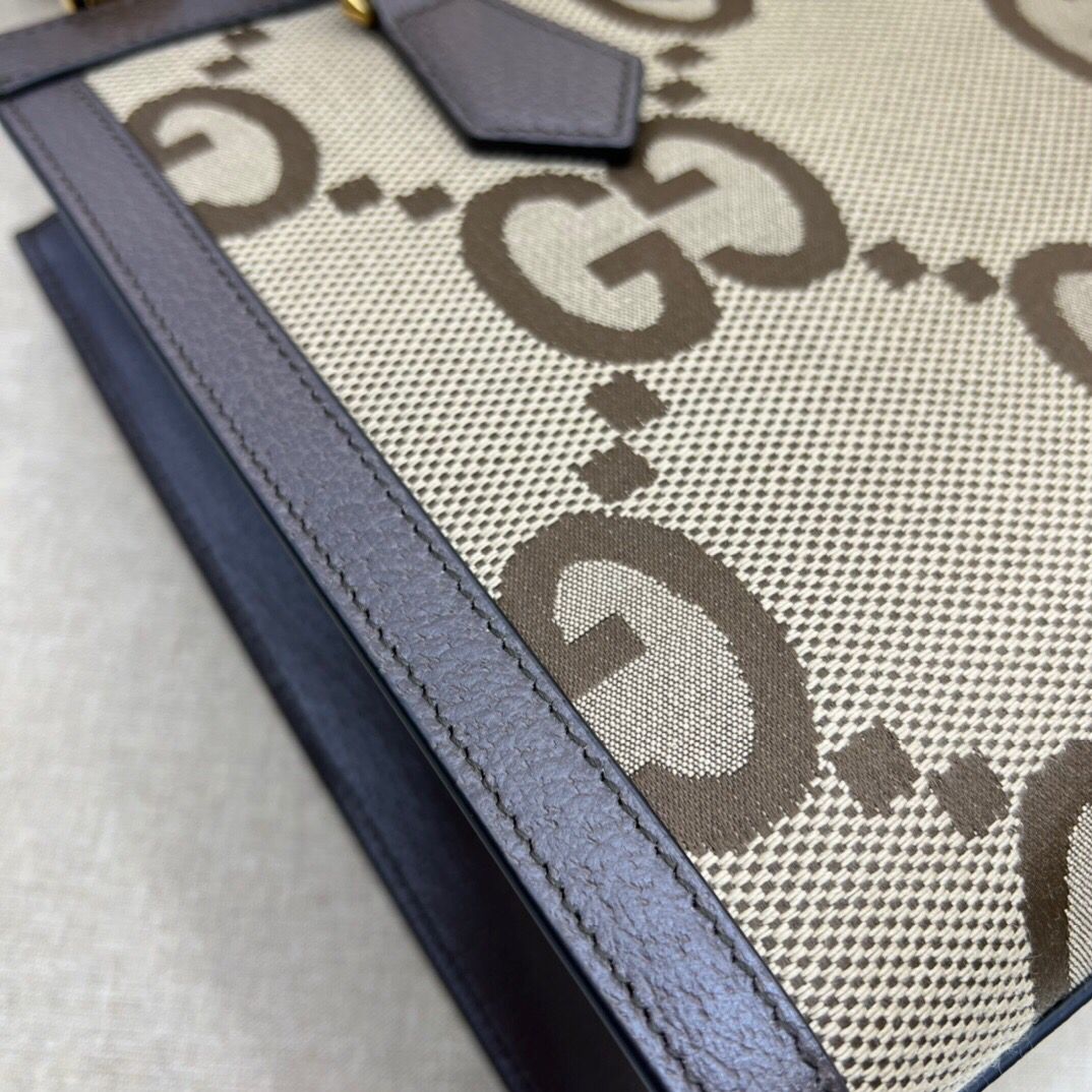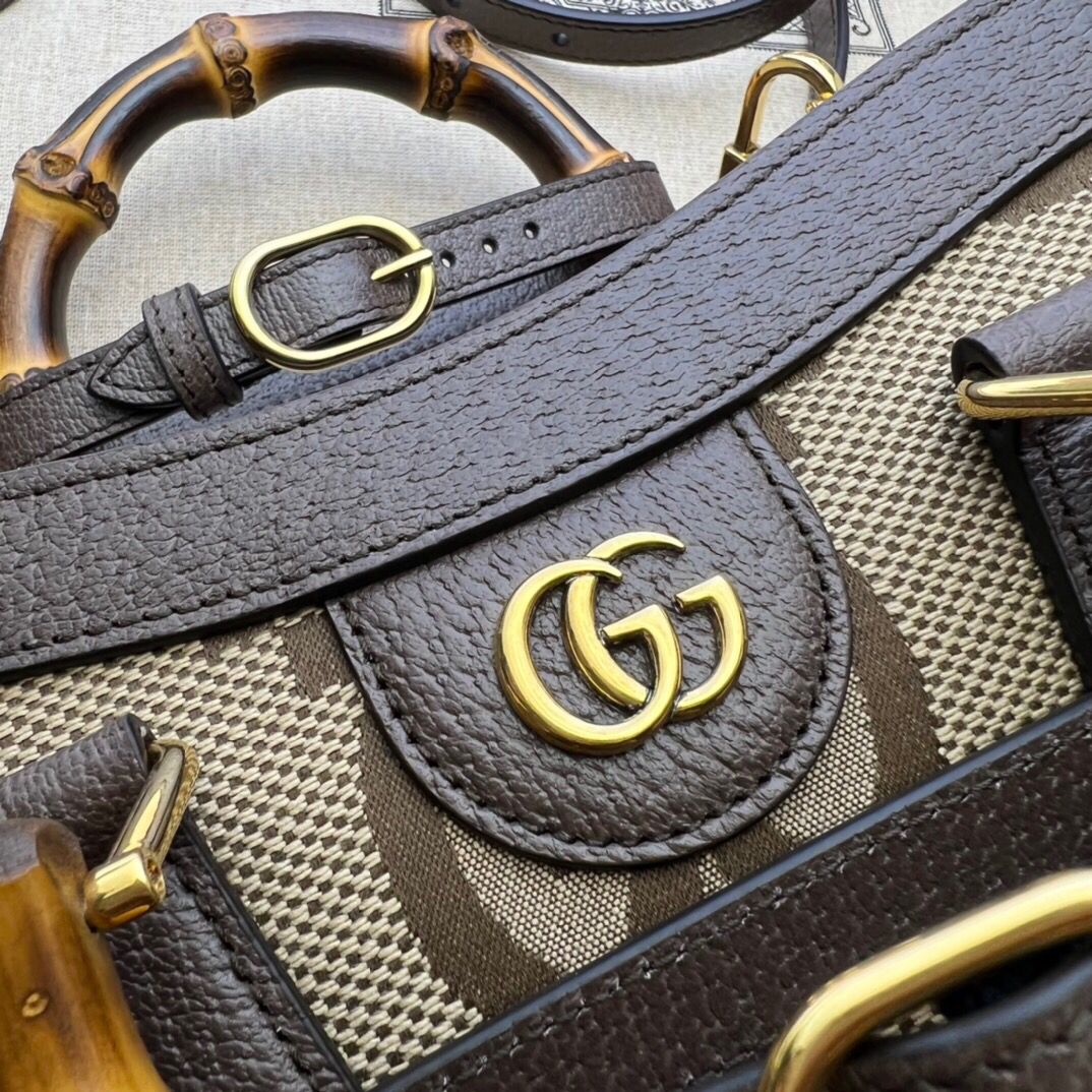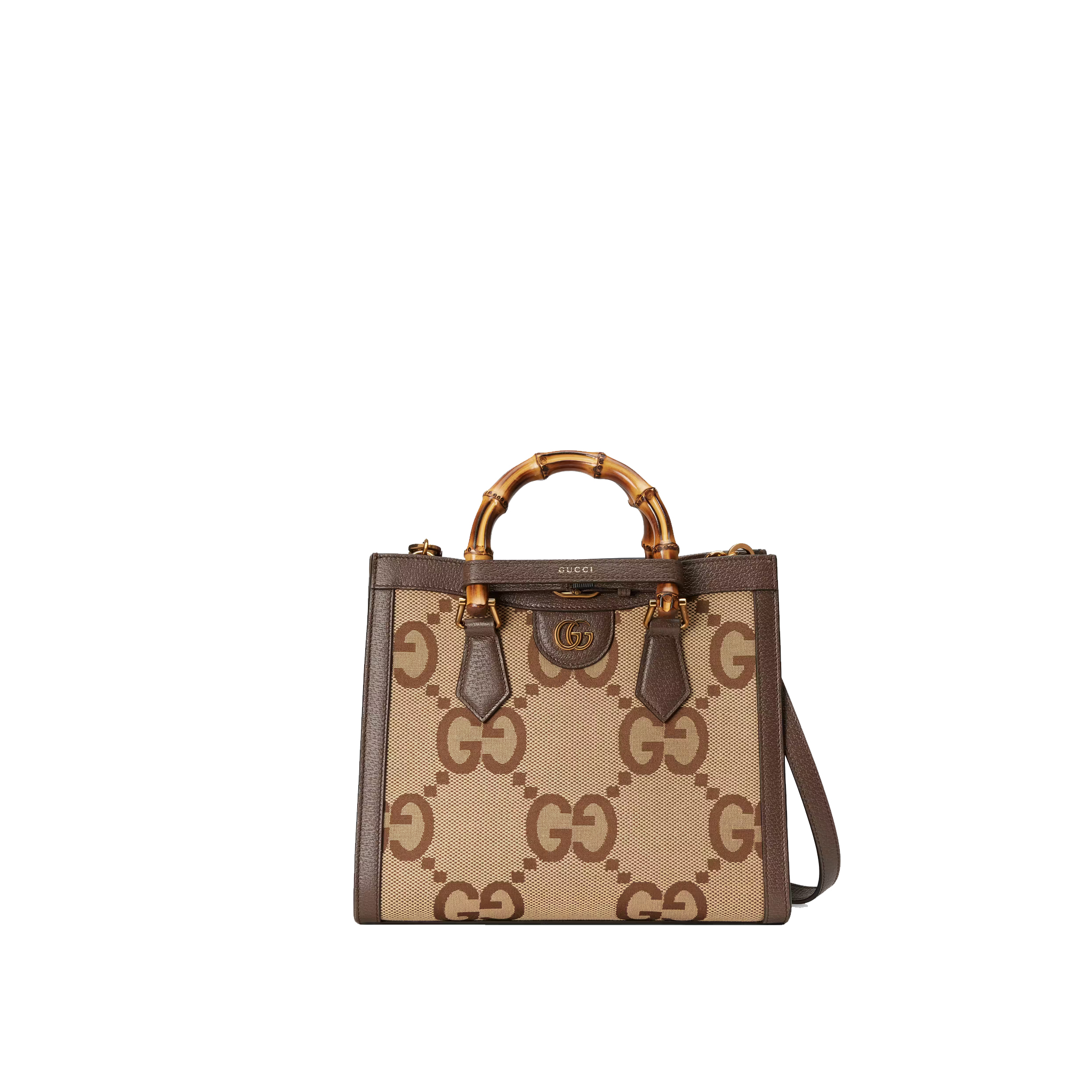 Instantly recognizable emblems of the brand, logos enrich designs in new and unexpected ways. Behind every logo lies the tradition and value of the House, an everlasting medium one can wear again and again. Following the idea of constant change and experimentation, different iterations of the logo have been presented each collection. The jumbo GG, a new, maximalist version of the historic monogram, animates a selection of ready-to-wear and accessories for the Aria collection. This small Gucci Diana tote is completed by a brown leather trim.