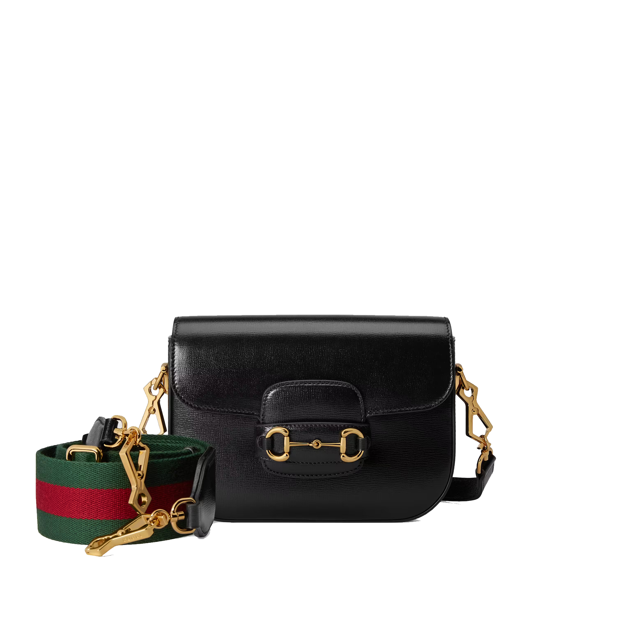 Petite versions of the Gucci Horsebit 1955 add a hybrid twist to the vintage inspired line. Enriched with two different shoulder straps, the white leather mini bag’s character transforms from understated elegance with a tonal leather strap to a strong logo feel thanks to a red and green Web option.