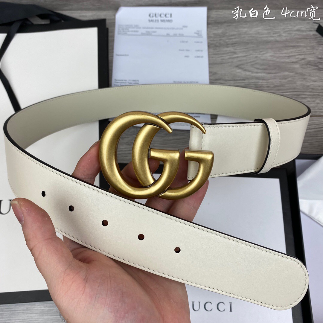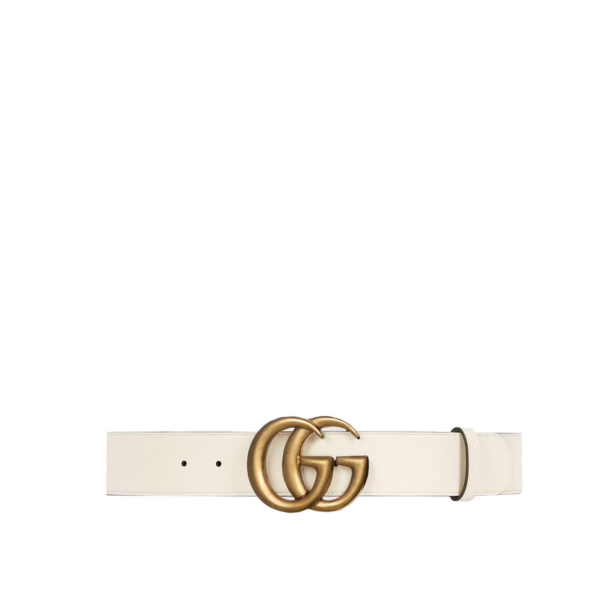 Inspired by an archival design, the Double G emblem is crafted from brass hardware with an antiqued finish. Placed on a smooth white leather belt.