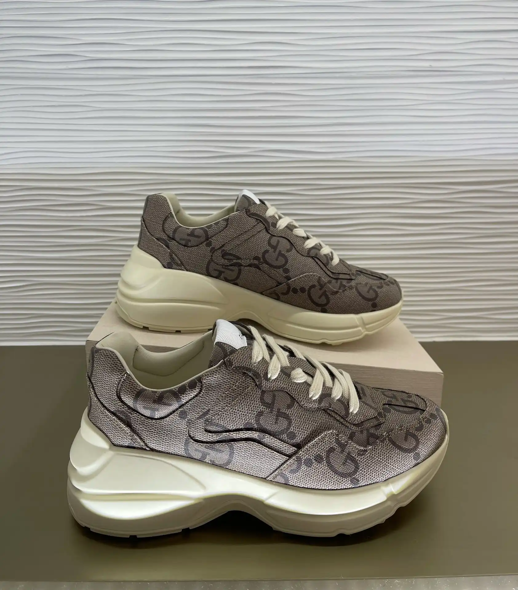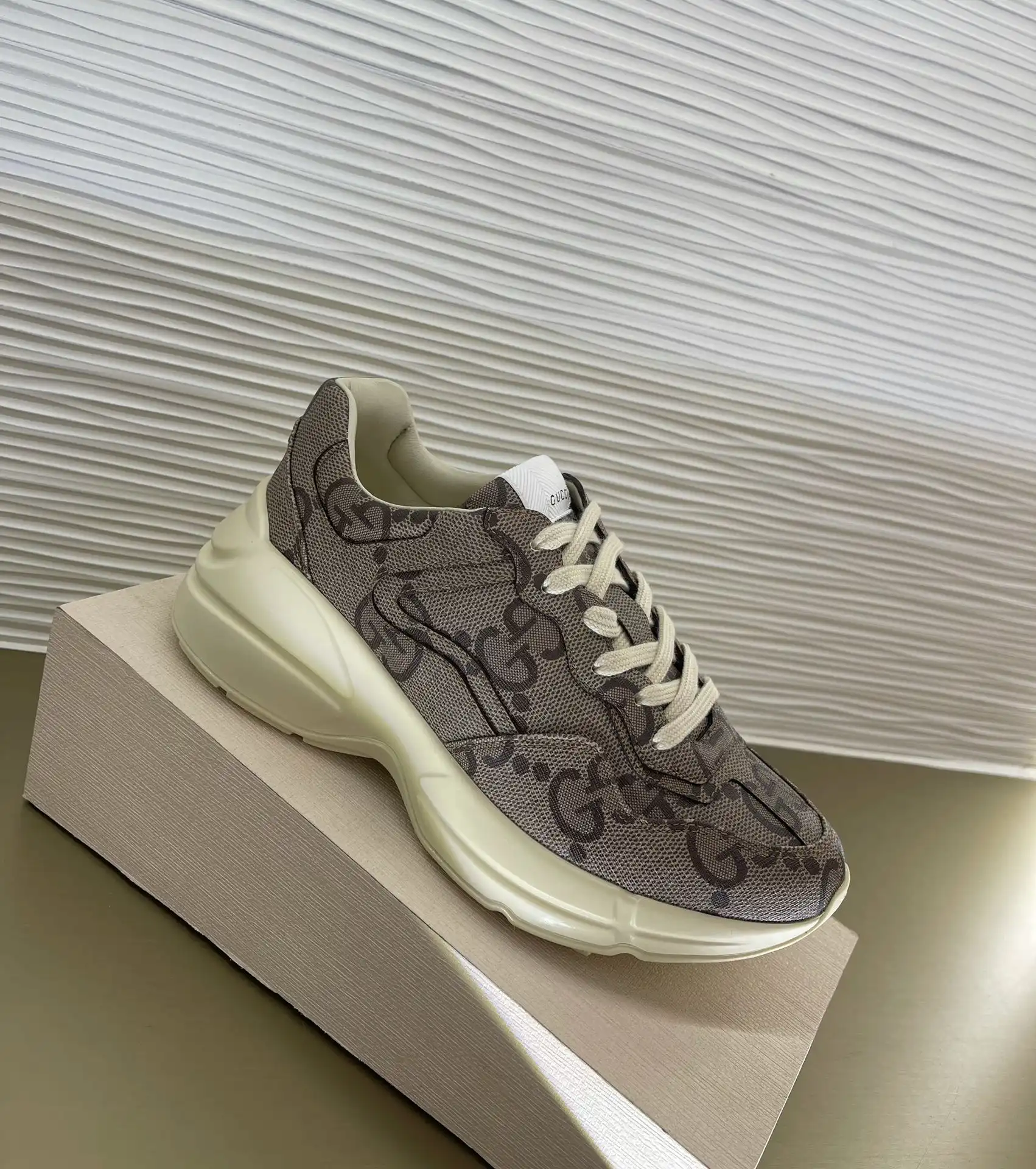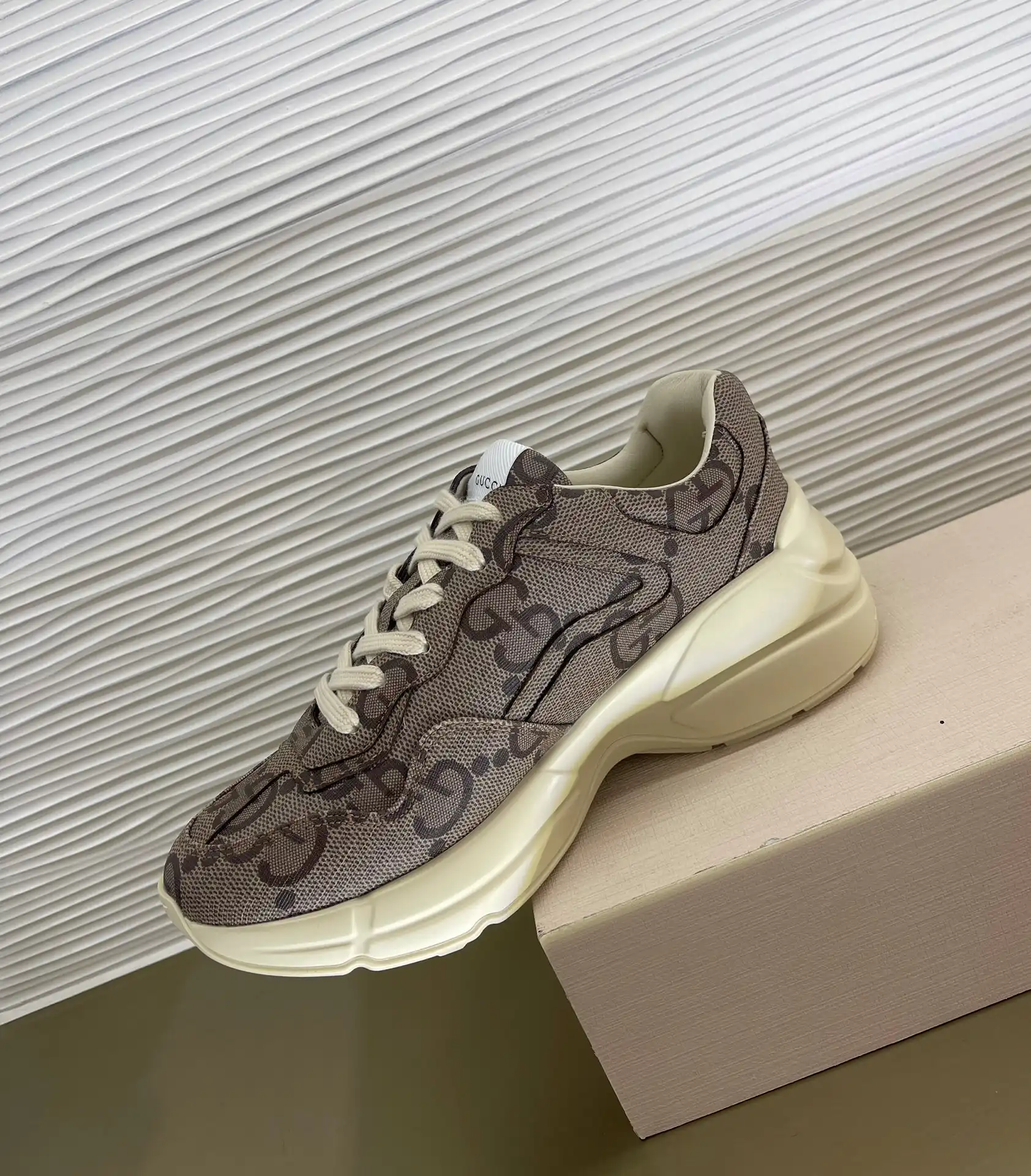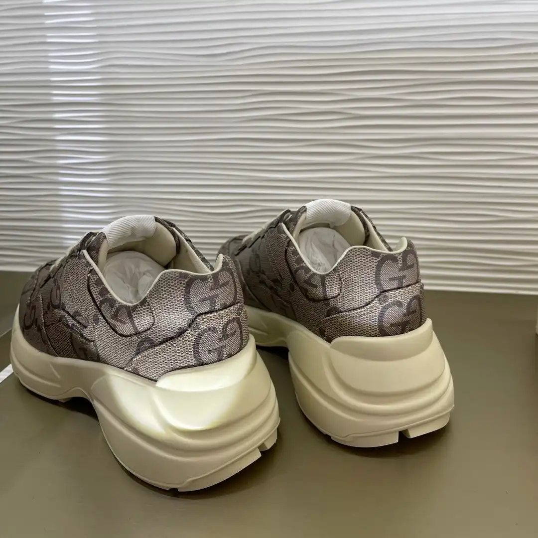 In honor of the Gucci’s Centennial, this Rhyton sneaker plays with the House’s monogram, reimagining it as a maxi motif. The Gucci Aria collection explores the archives, adding contemporary touches to vintage styles as a tribute to both the brand’s past, present and future.