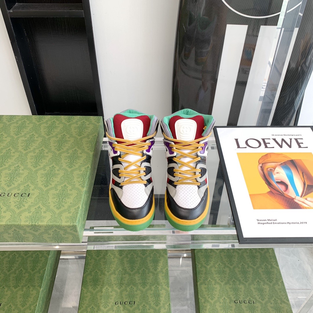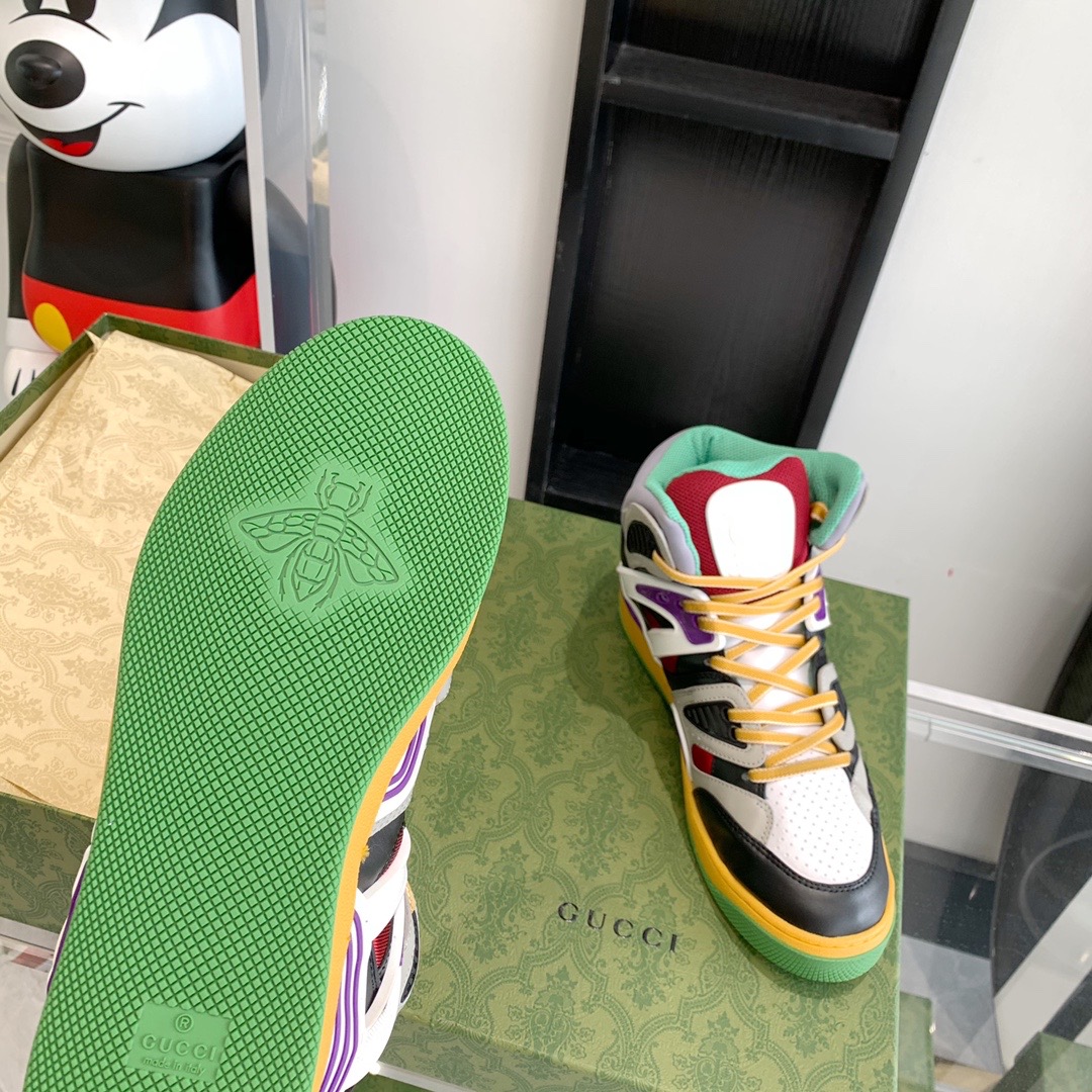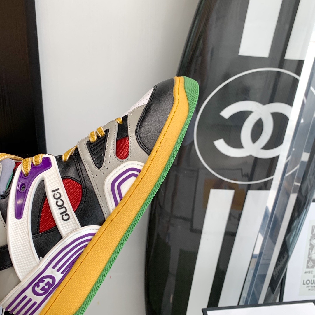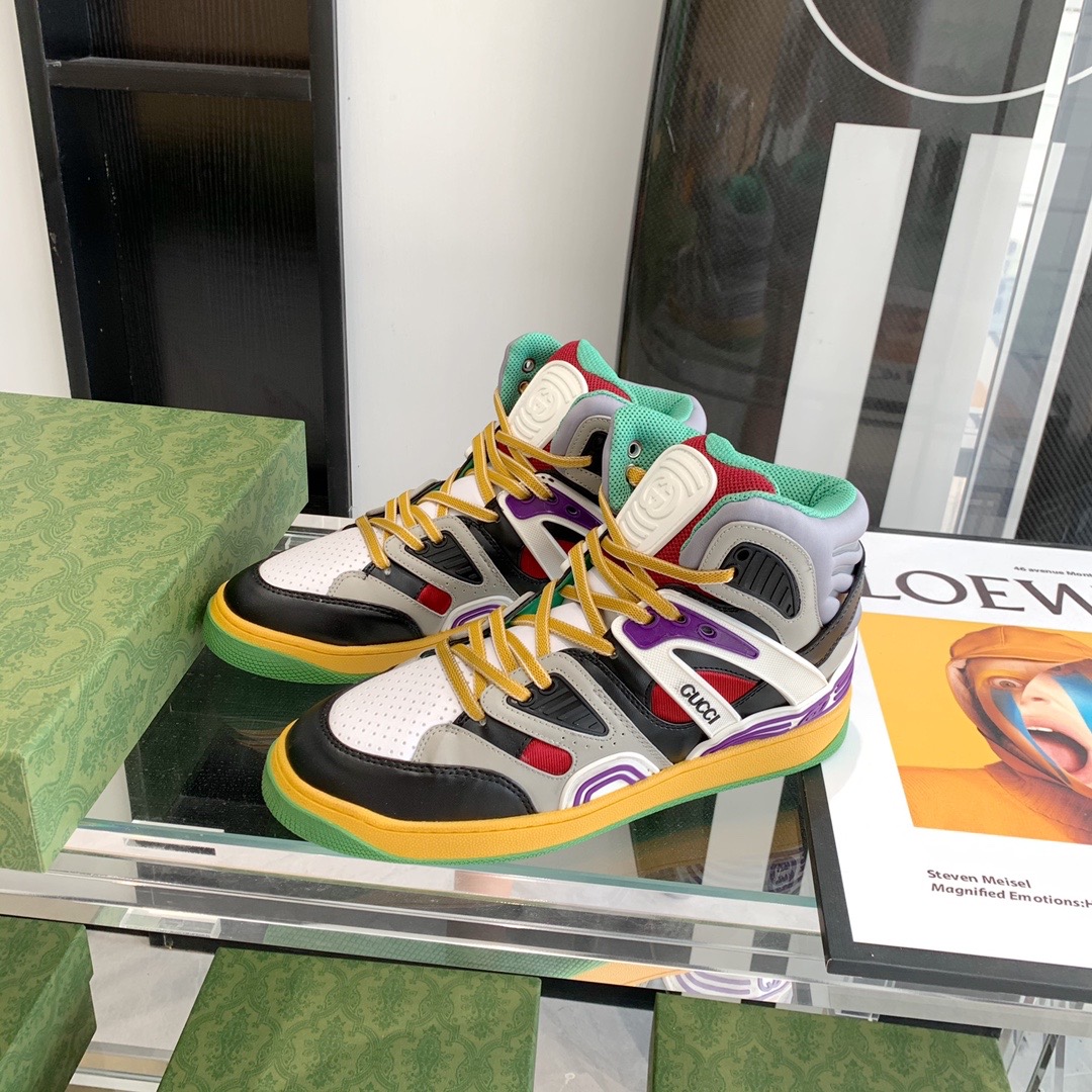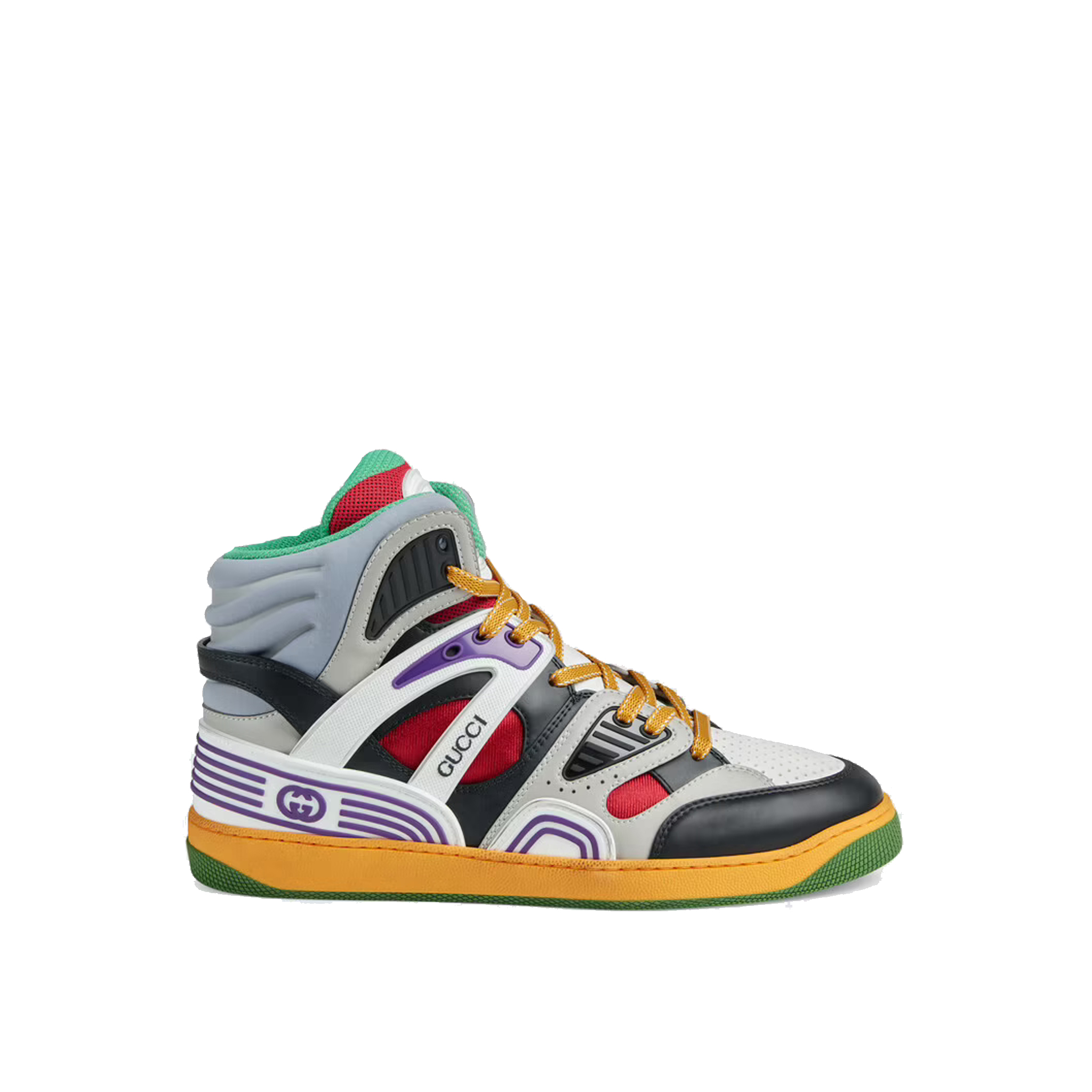 Sporting a look synonymous with basketball sneakers from the ‘90s, the House introduces the newest rendition of the lace-up sneaker—Gucci Basket. This high-top style emulates the self-expression of on-court aesthetic with distinctive features and detailing. Offered in a mix of brightly colored fabrics and finished with a lightly distressed effect, each pair is crafted primarily from Demetra. Created with the same processes used for tanning, the new material offers pliable and resilient performance with a supple finish. The eco-friendly material combines animal-free raw materials primarily from sustainable, renewable, and bio-based sources.