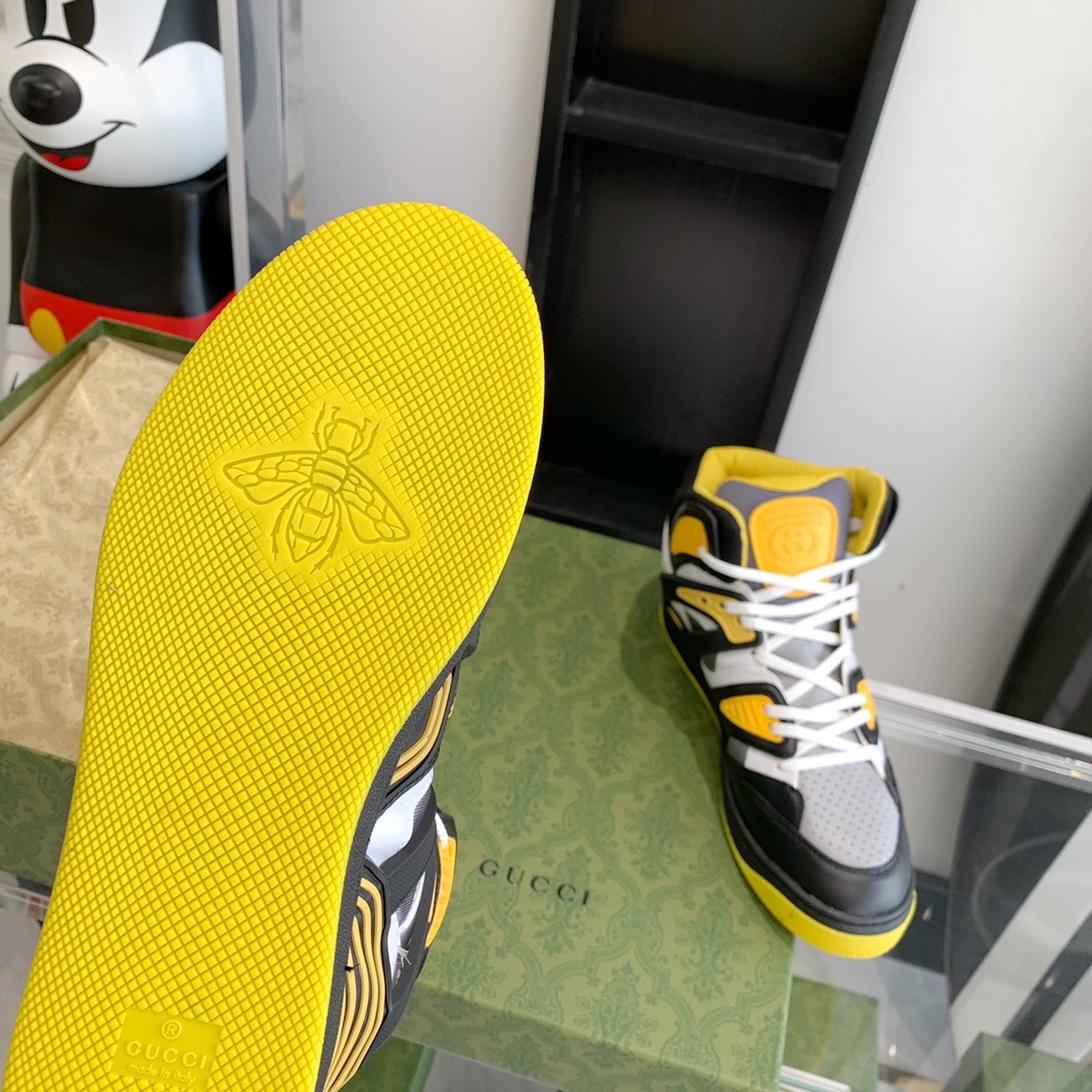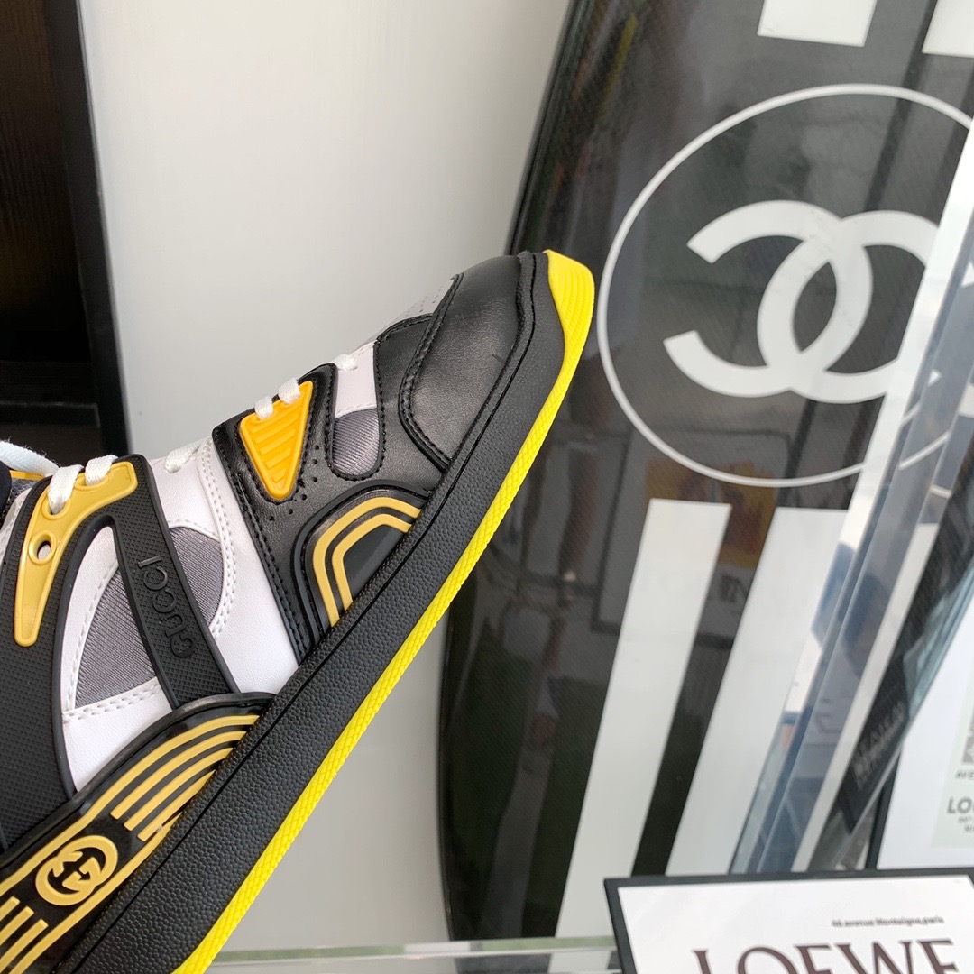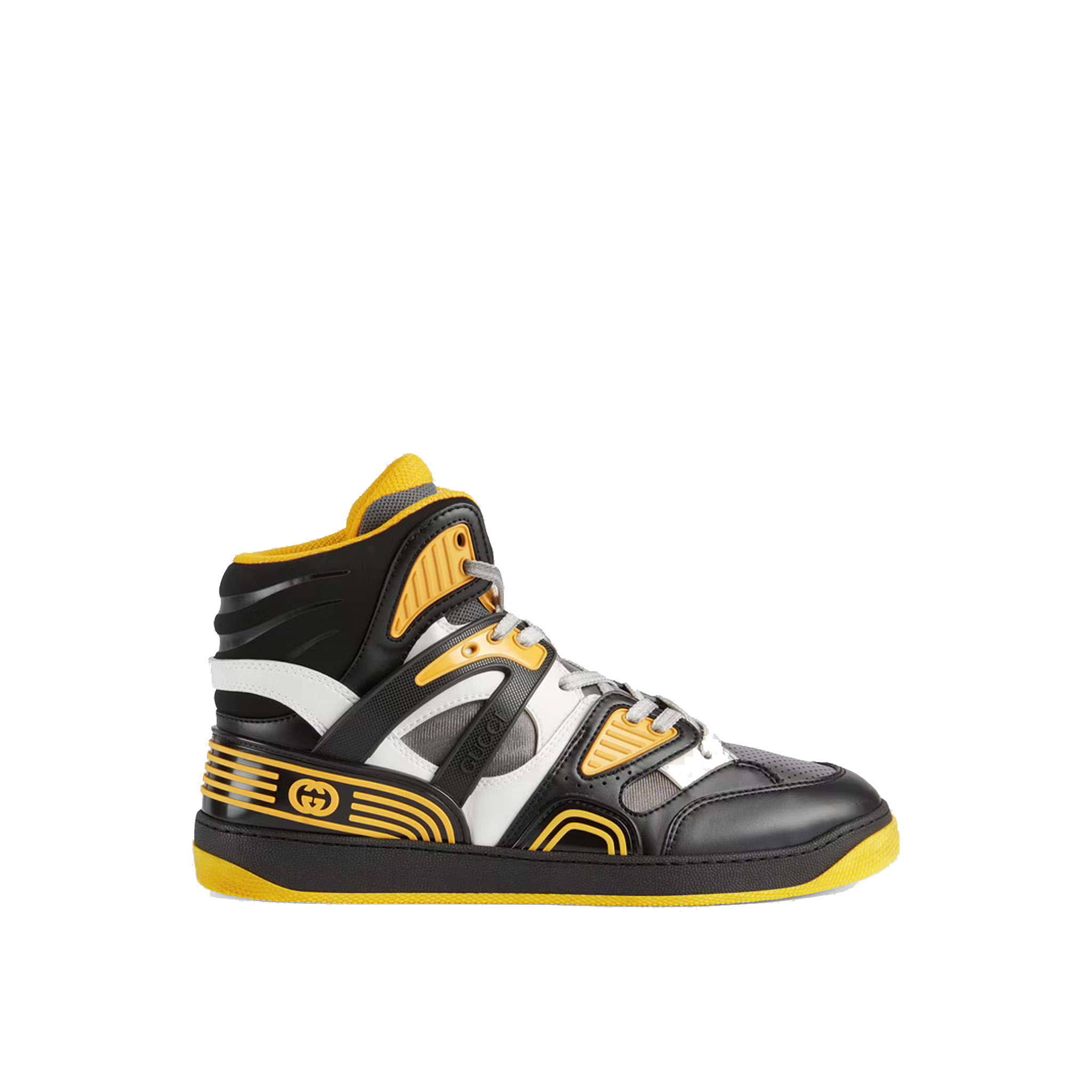 Sporting a look synonymous with basketball sneakers from the ‘90s, the House introduces the newest rendition of the lace-up sneaker—Gucci Basket. This high-top style emulates the self-expression of on-court aesthetic with distinctive features and detailing. Offered in a mix of brightly colored fabrics and finished with a lightly distressed effect, each pair is crafted primarily from Demetra. Created with the same processes used for tanning, the new material offers pliable and resilient performance with a supple finish. The eco-friendly material combines animal-free raw materials primarily from sustainable, renewable, and bio-based sources.