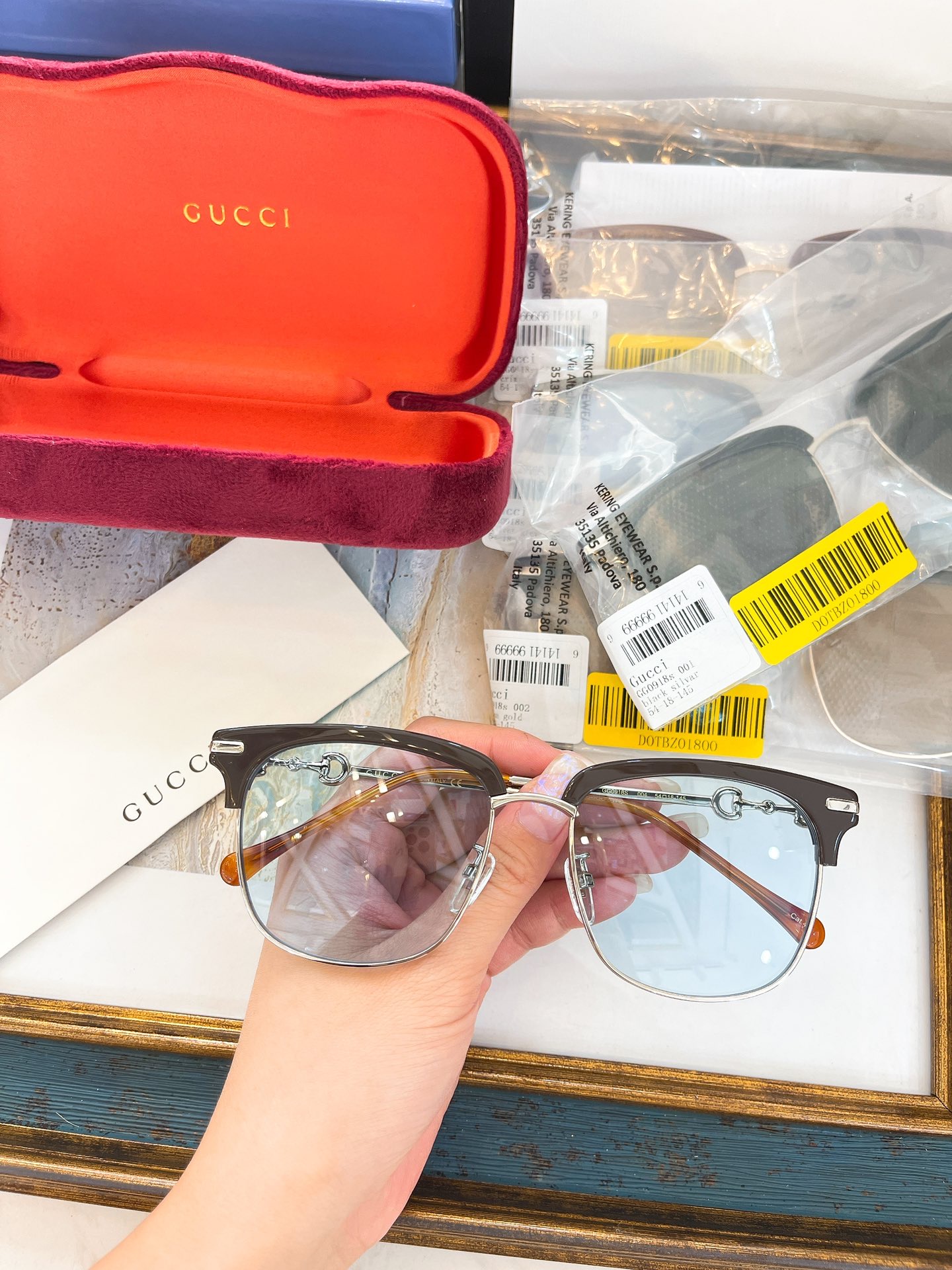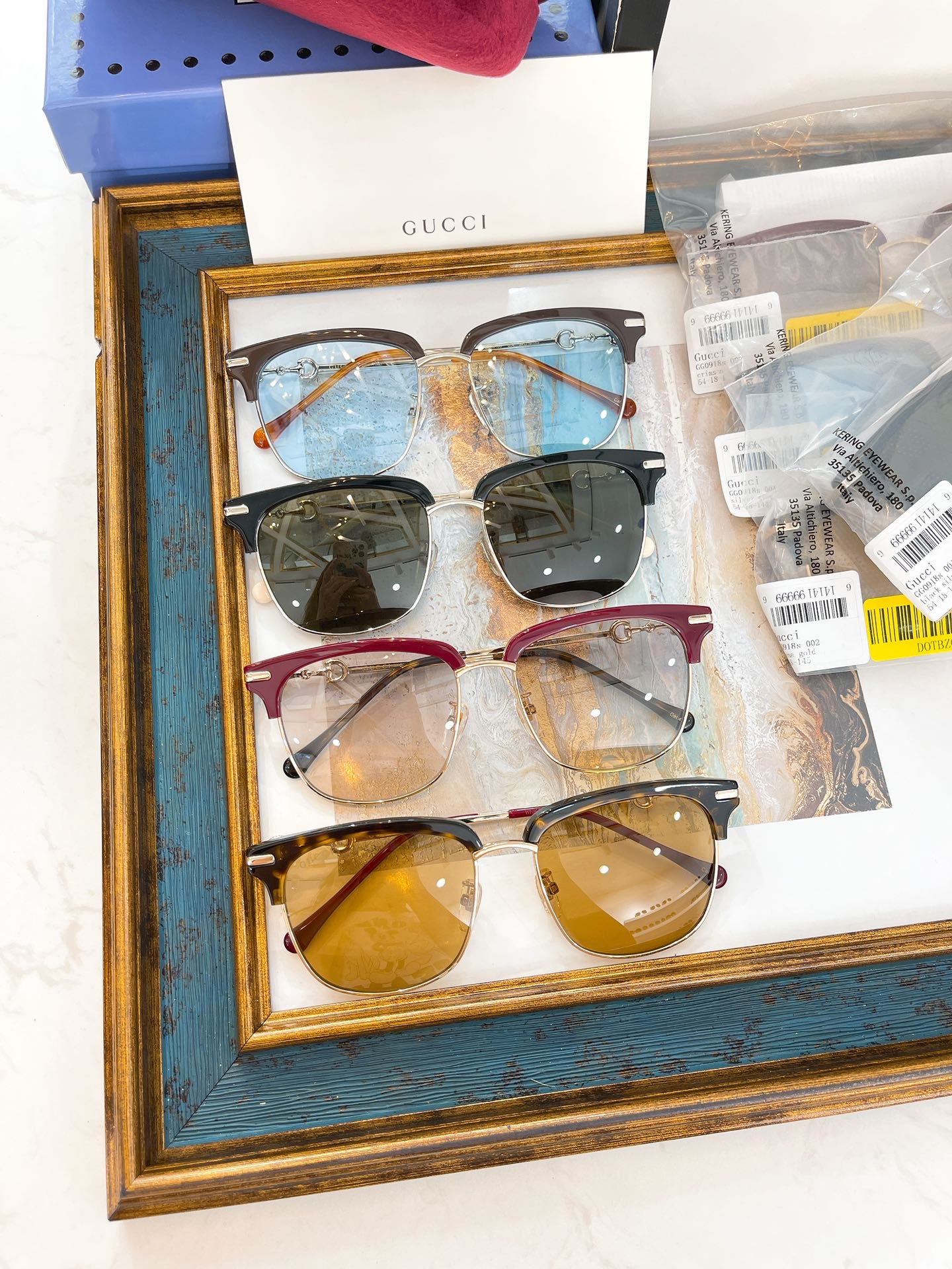 - Gold metal temples with Horsebit detail with burgundy acetate tip