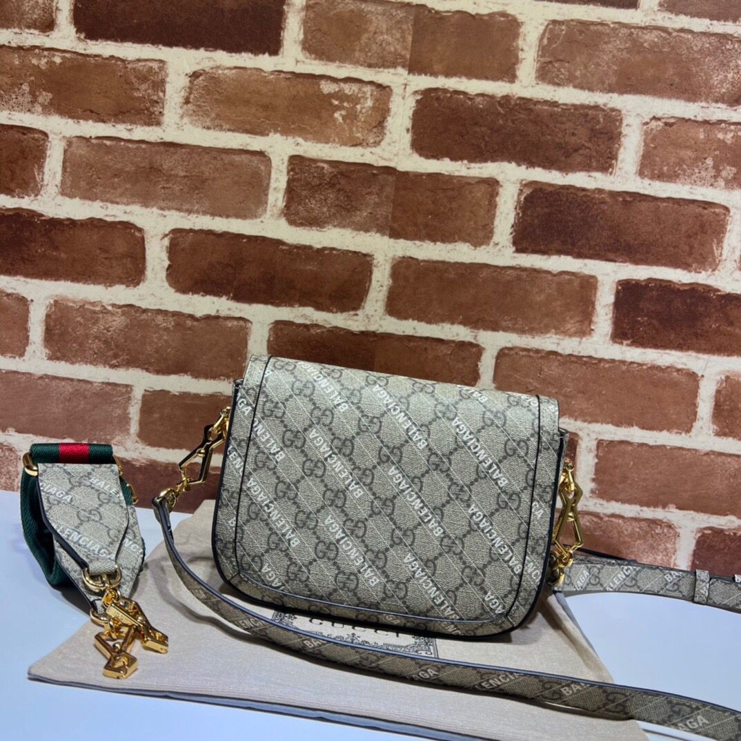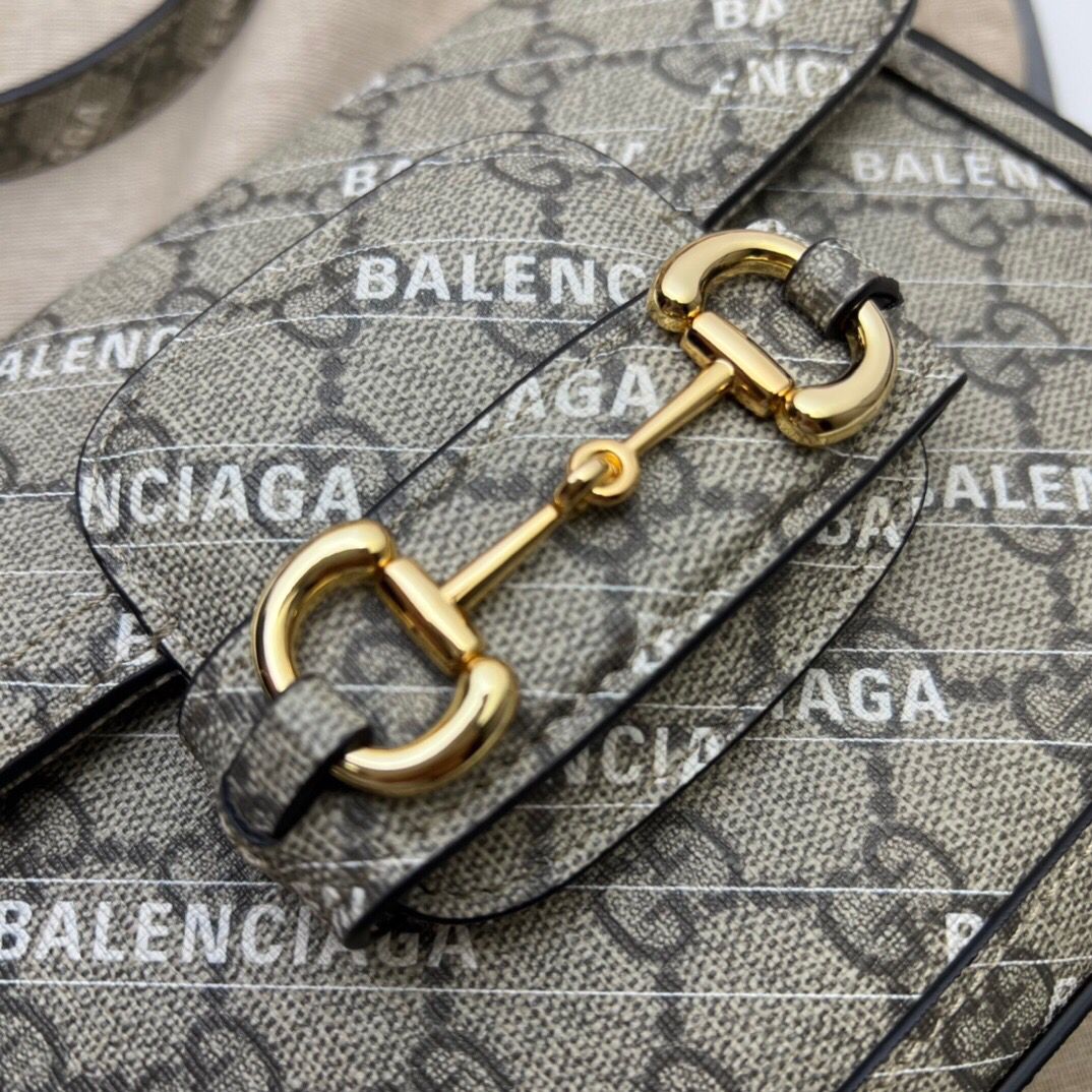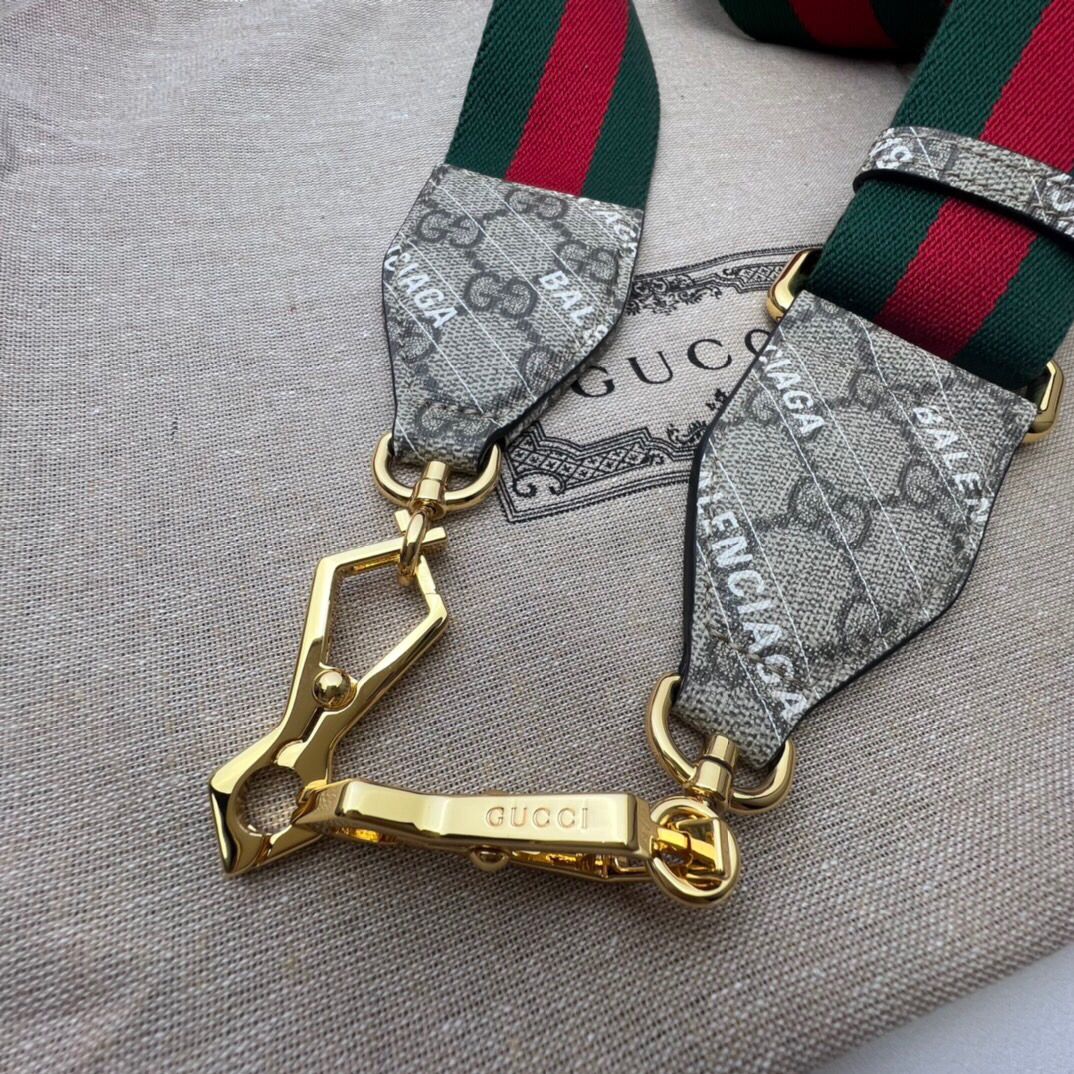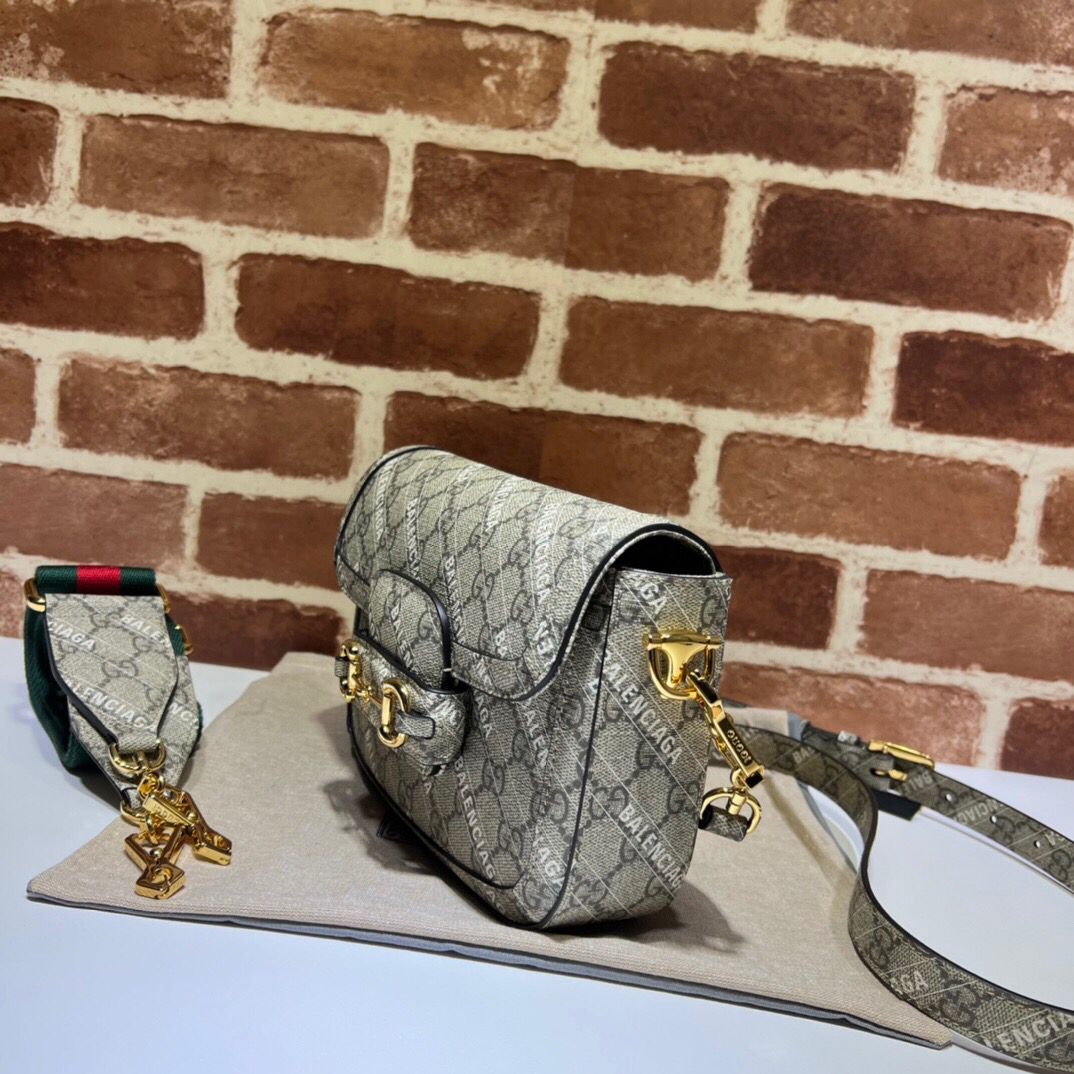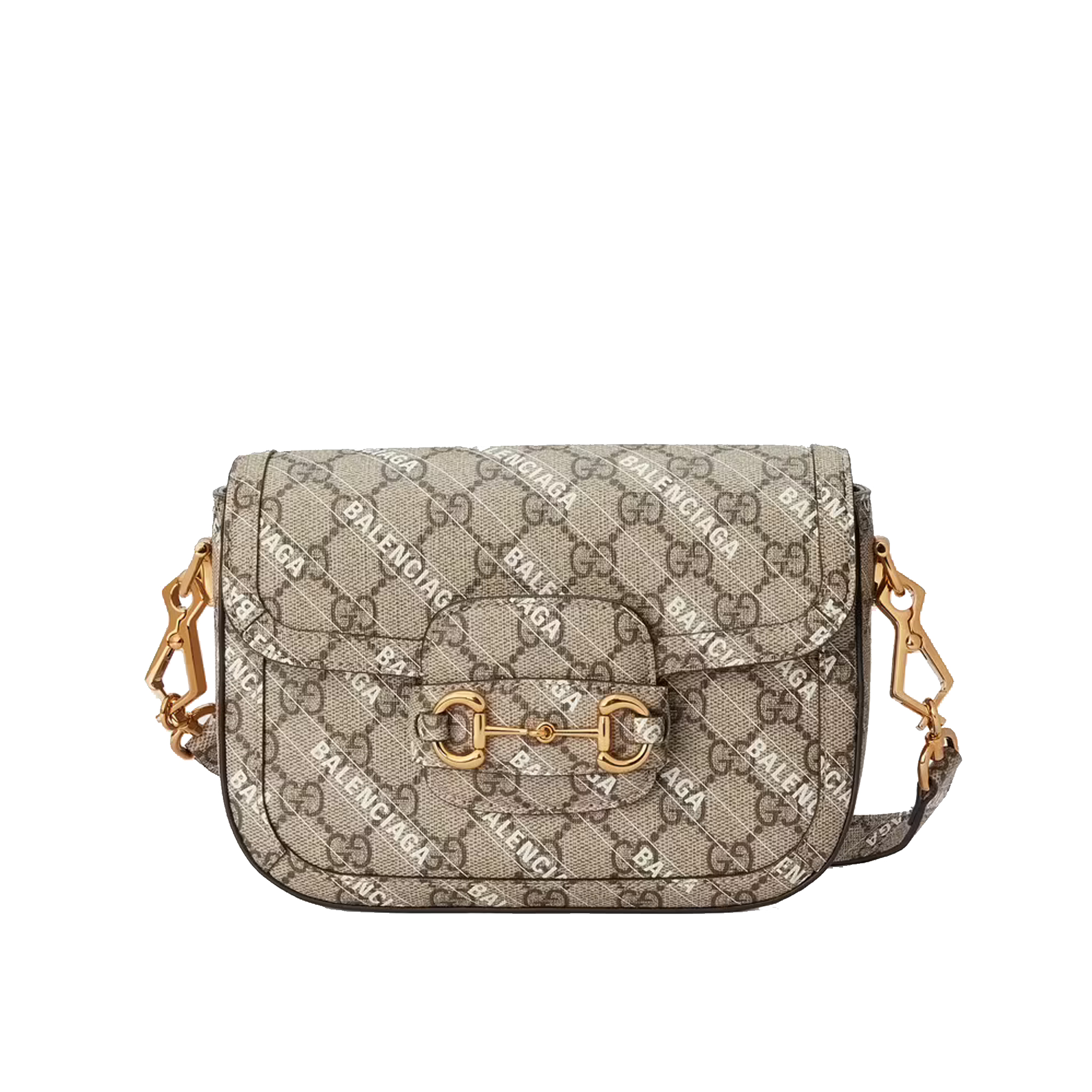 Exploring ideas of authenticity and appropriation within the fashion industry, Gucci Aria unveils The Hacker Project. In his latest collection, Alessandro Michele—in expressions of homage—infuses iconic Balenciaga silhouettes with Gucci codes in unique creations. Presented as a part of the selection, the Gucci Horsebit 1955 shoulder bag is reimagined in Balenciaga print GG Supreme canvas.