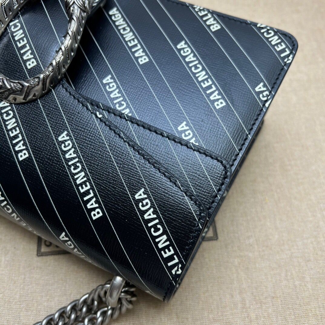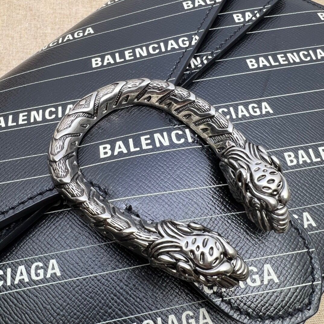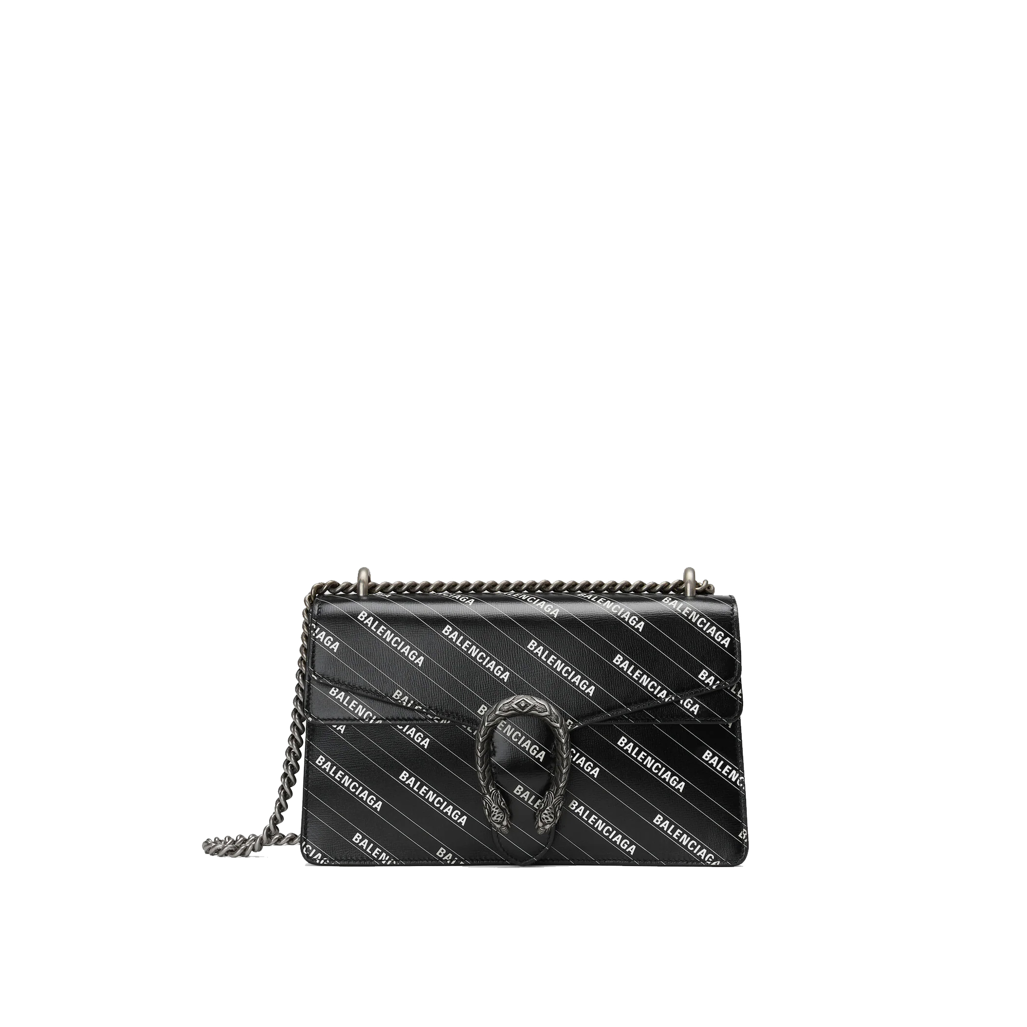 Exploring ideas of authenticity and appropriation within the fashion industry, Gucci Aria unveils The Hacker Project. In his latest collection, Alessandro Michele—in expressions of homage—infuses iconic Balenciaga silhouettes with Gucci codes in unique creations. Presented as a part of the selection, the Dionysus shoulder bag is reimagined in Balenciaga print black leather.