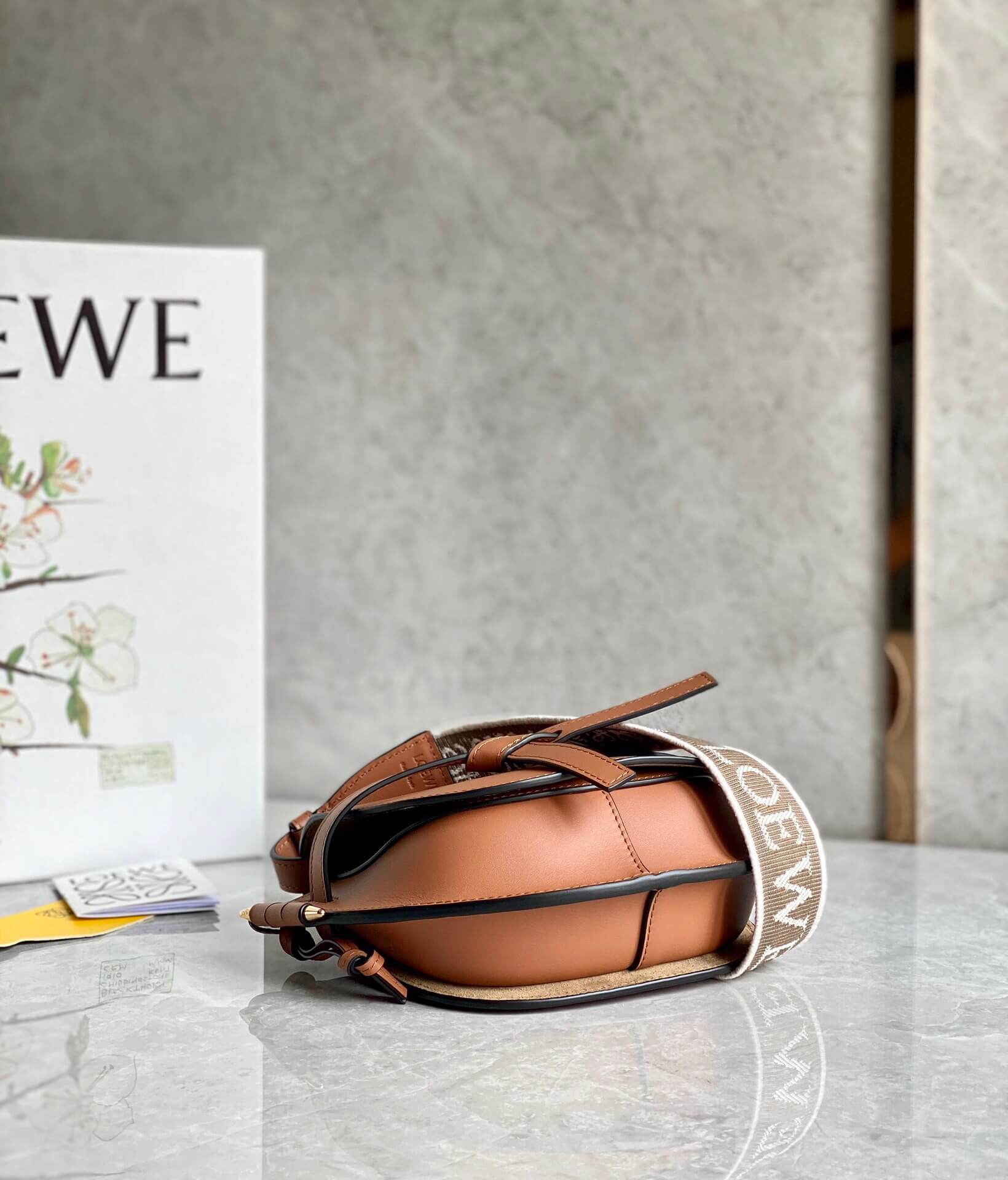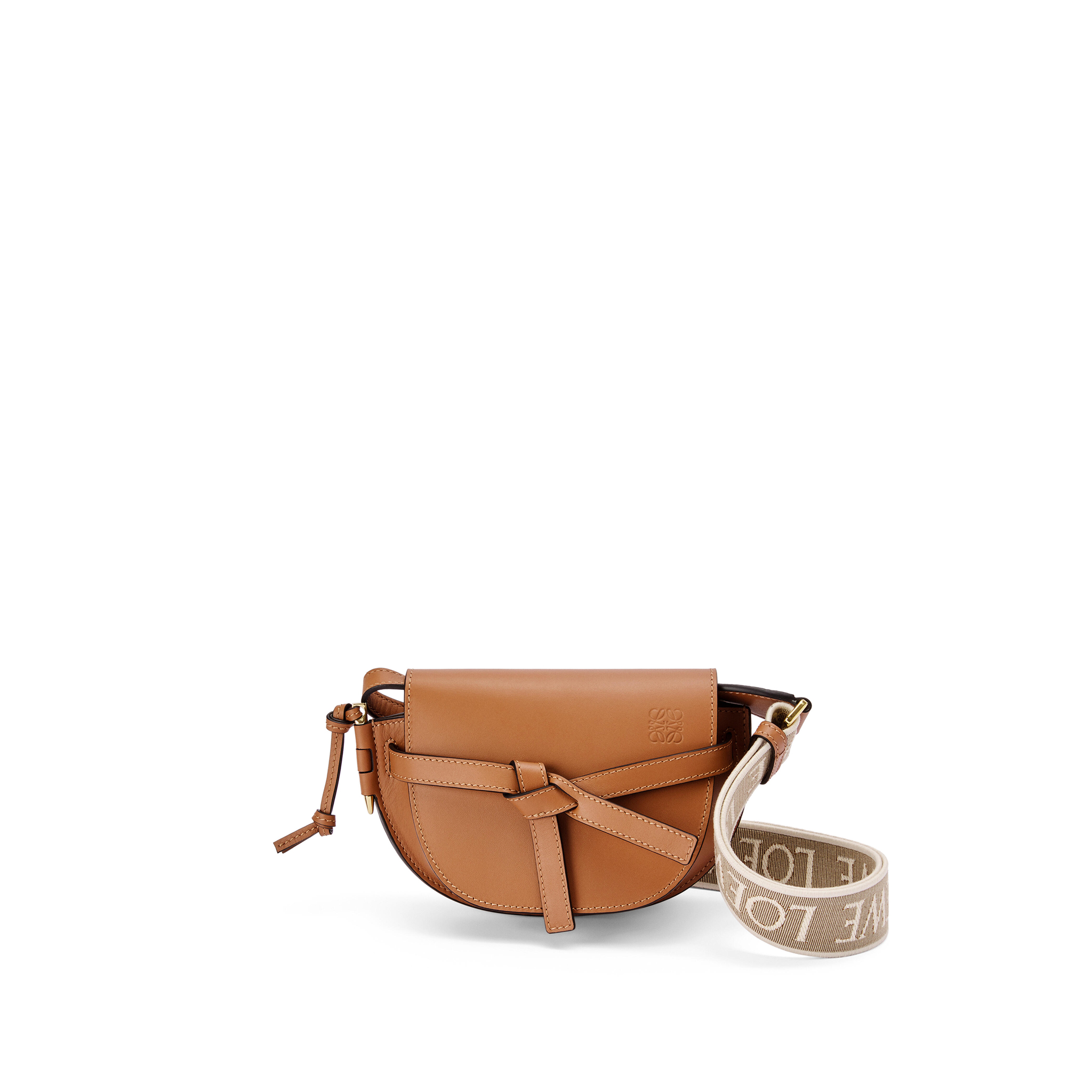 Meticulously crafted in soft calfskin, the Mini Gate Dual displays LOEWE´s unrivalled leather craftsmanship with a saddle-stitched knotted leather strap and a side-latched metal pin that gives the bag its name. This mini version has a removable shoulder strap in calfskin and jacquard with a repeat LOEWE pattern.