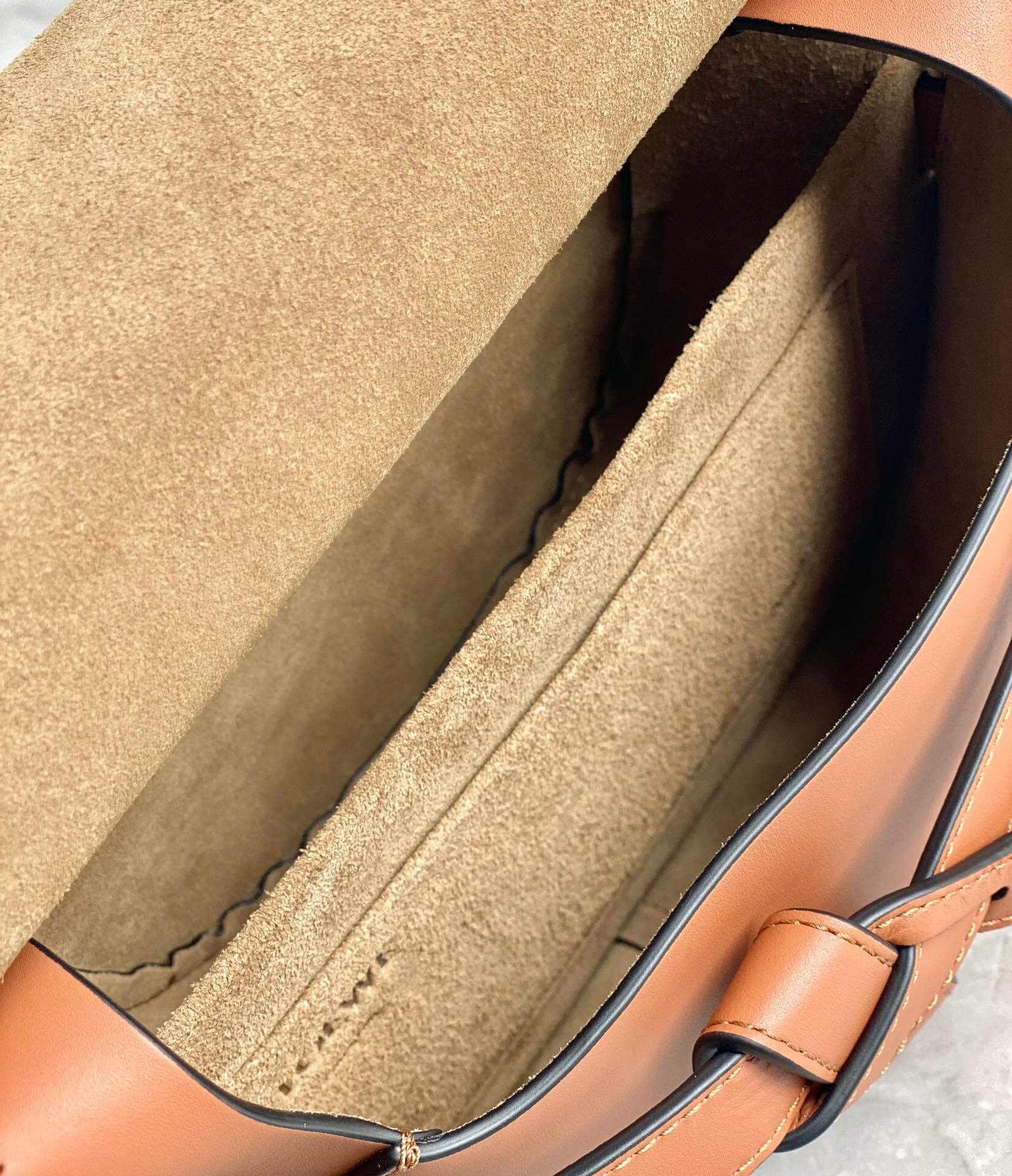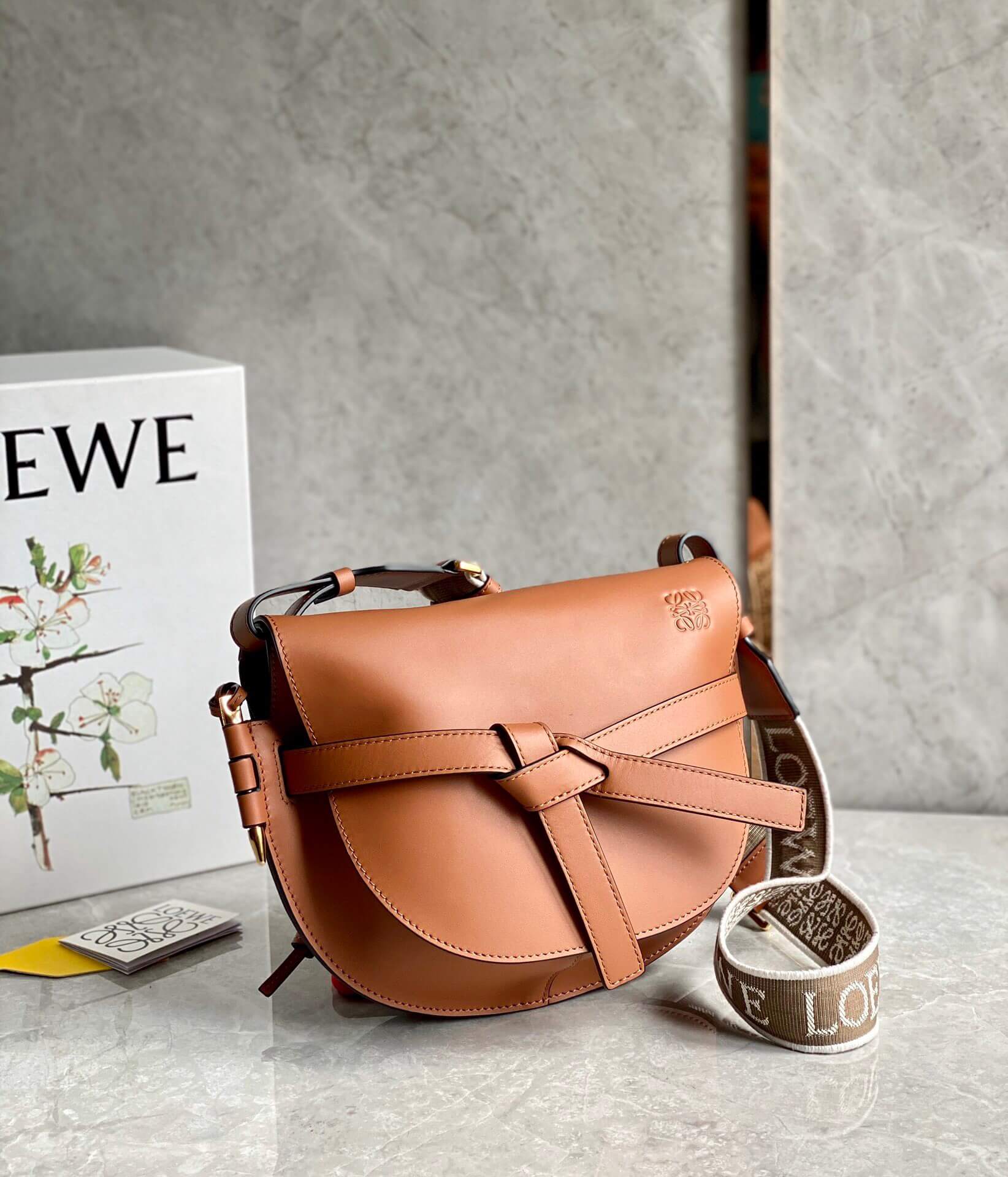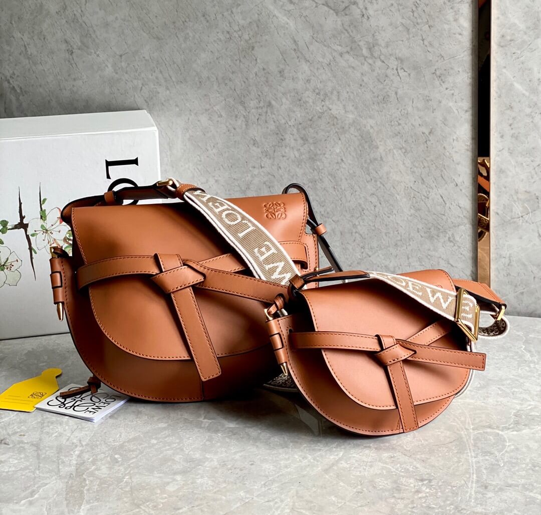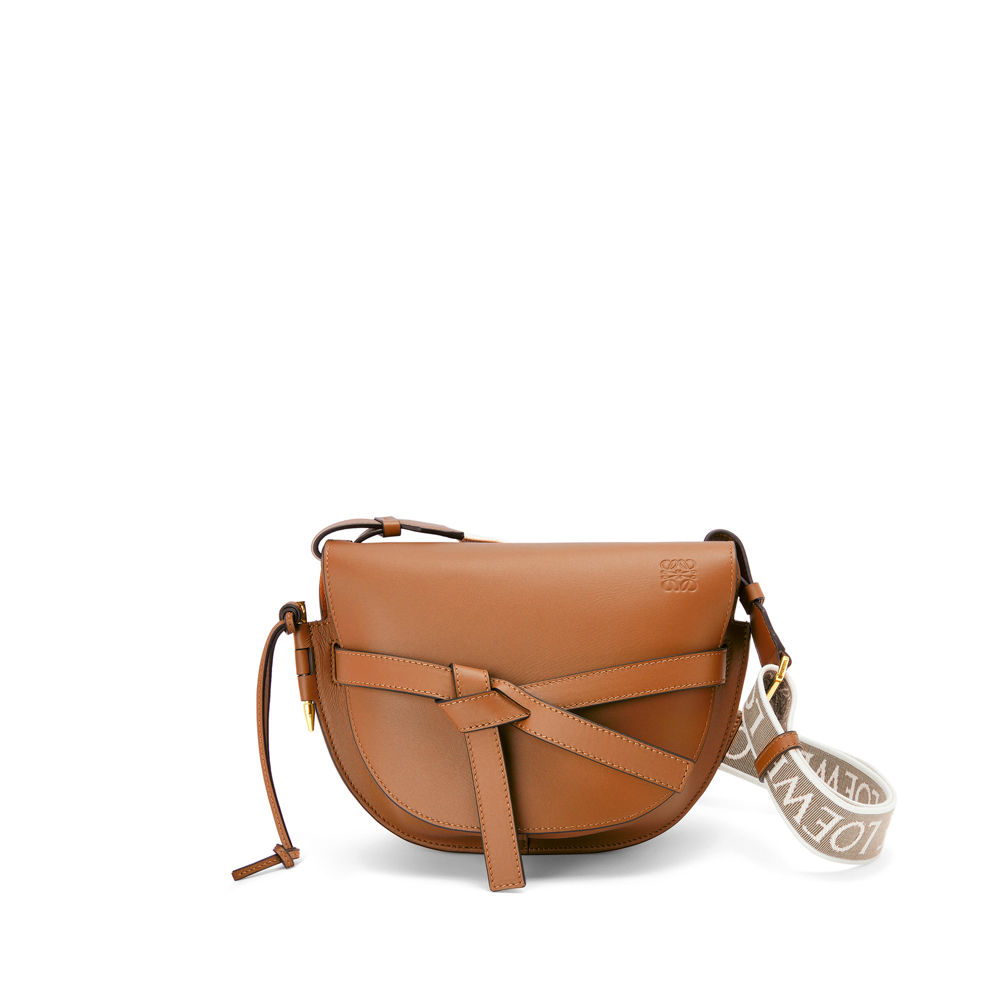 Meticulously crafted in soft calfskin, the Gate Dual displays LOEWE´s unrivalled leather craftsmanship with a saddle-stitched knotted leather strap and a side-latched metal pin that gives the bag its name. This small version has a removable shoulder strap in calfskin and jacquard with a repeat LOEWE pattern.