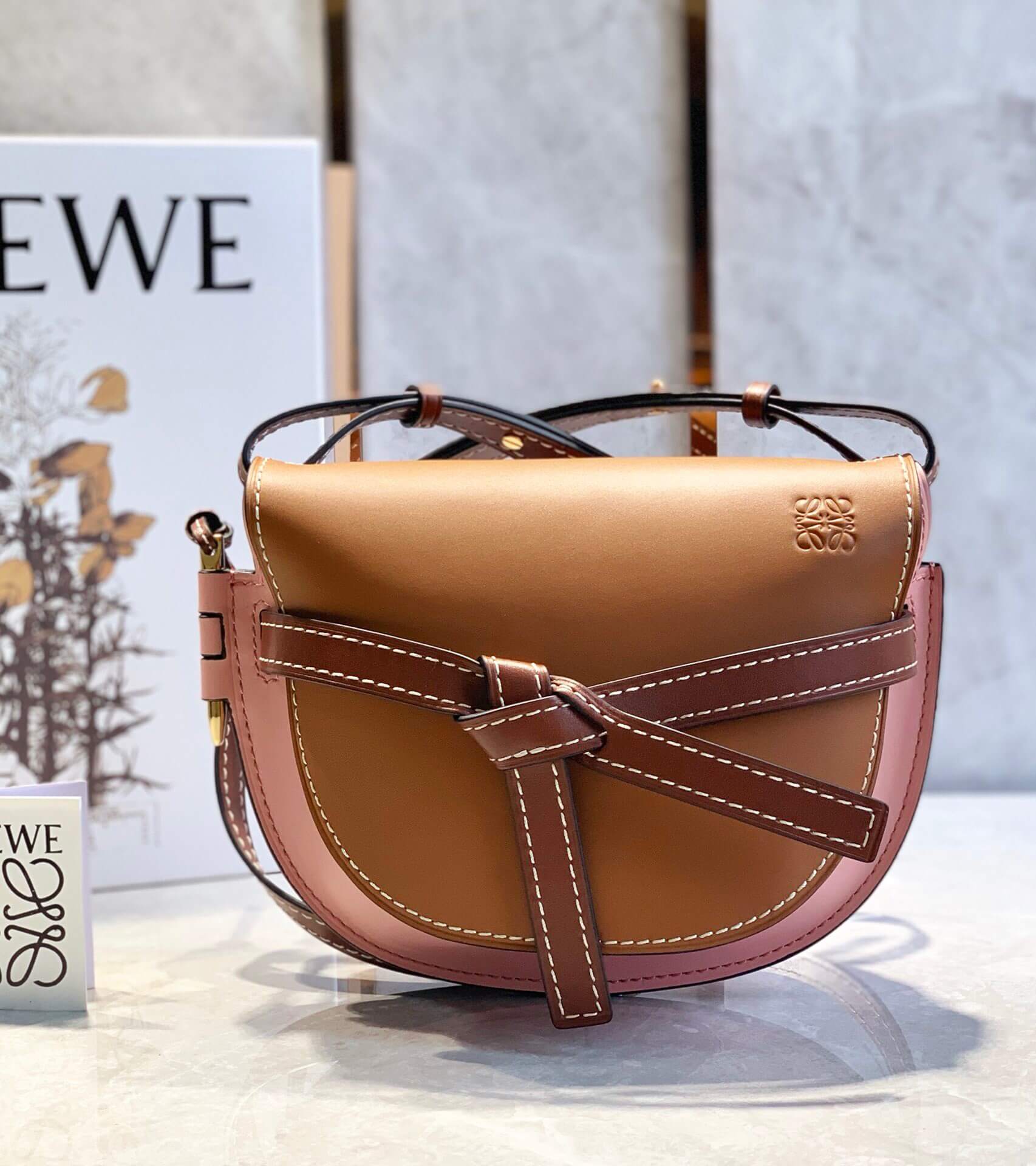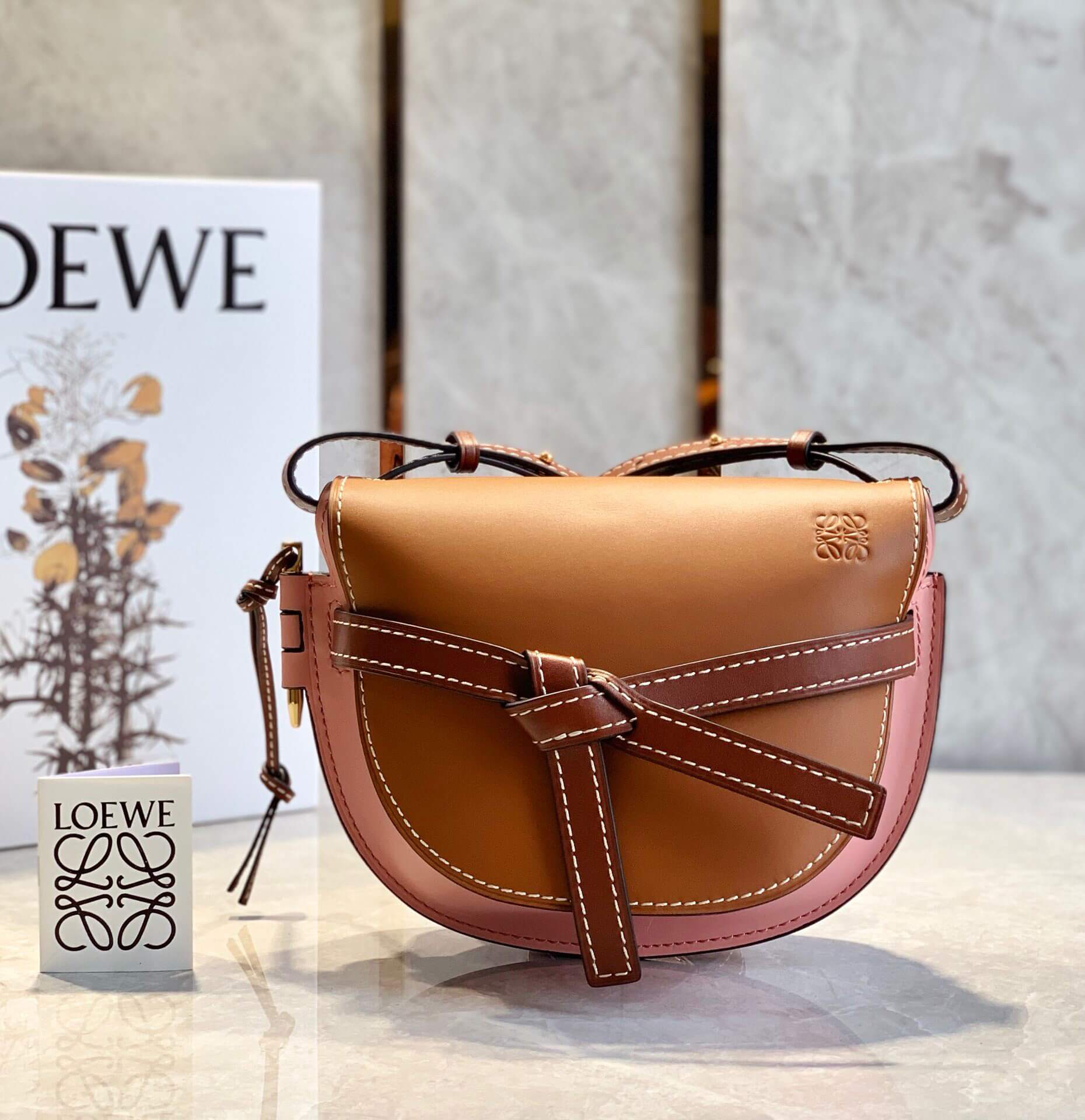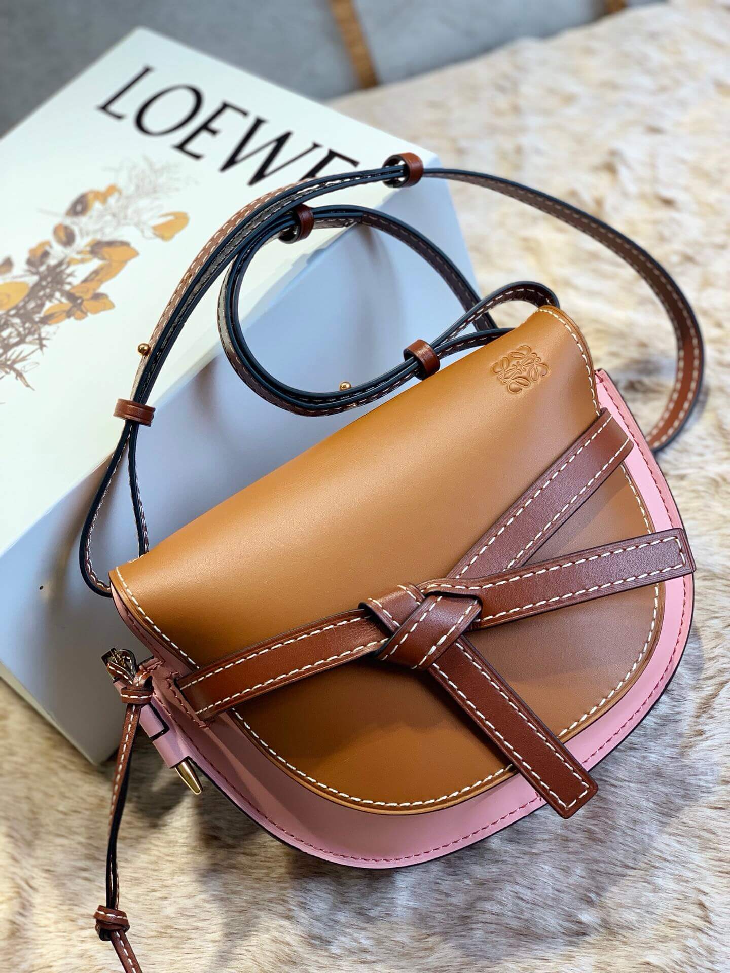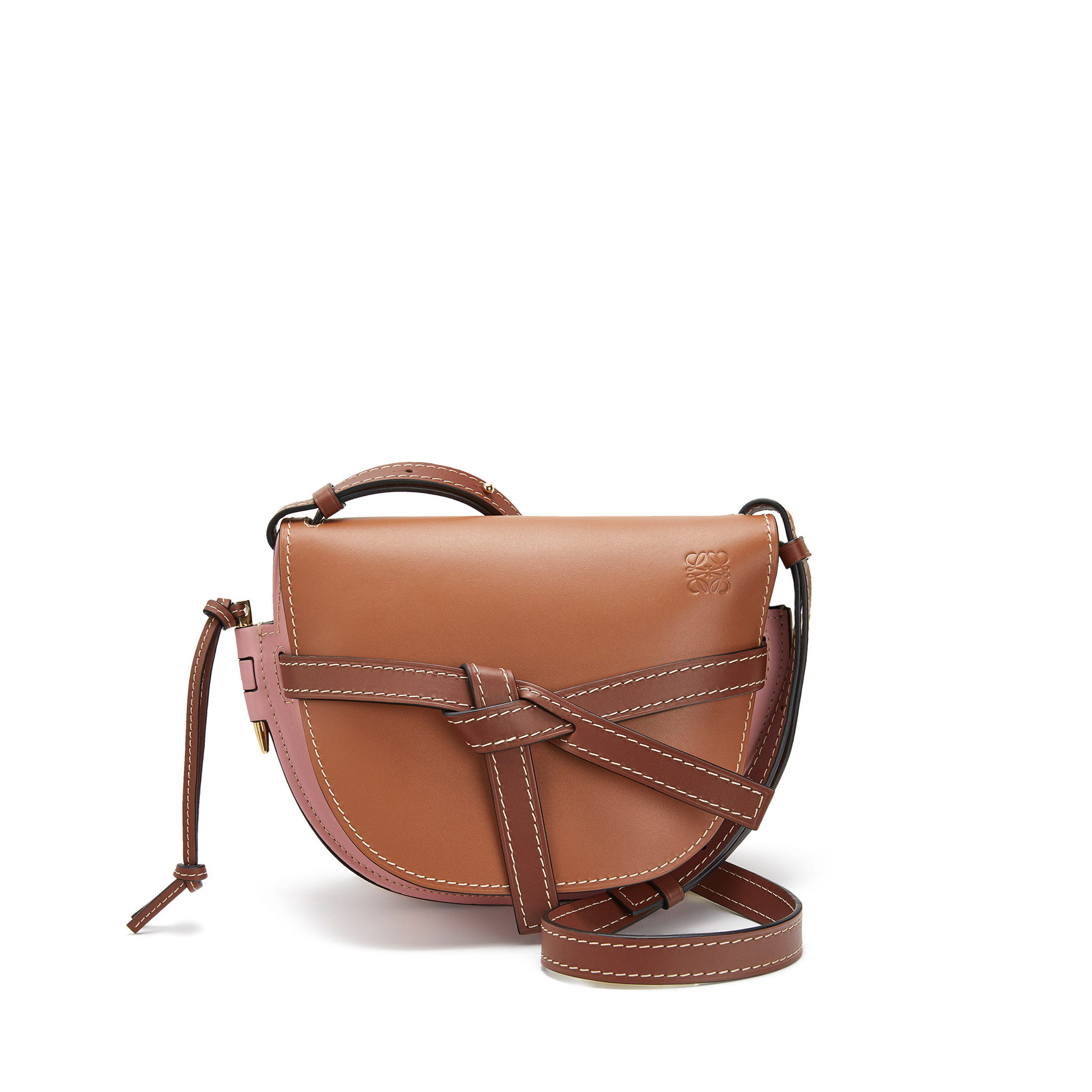 Meticulously crafted in soft calfskin, the Gate Dual displays LOEWE´s unrivalled leather craftsmanship with a saddle-stitched knotted leather strap and a side-latched metal pin that gives the bag its name. This small version has a adjustable shoulder strap in calfskin and jacquard with a repeat LOEWE pattern.
