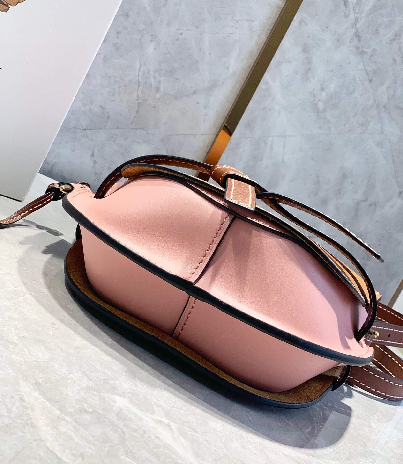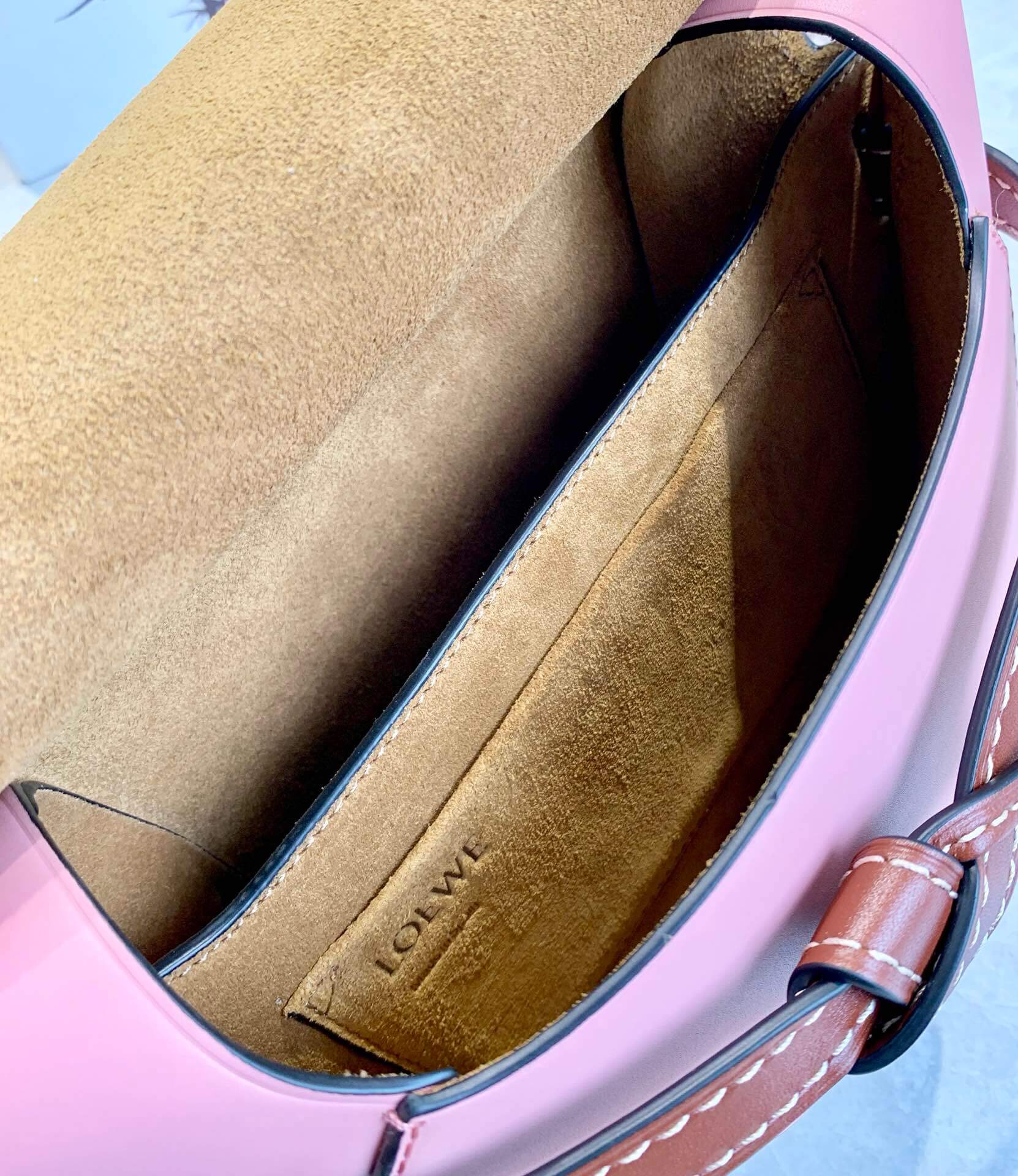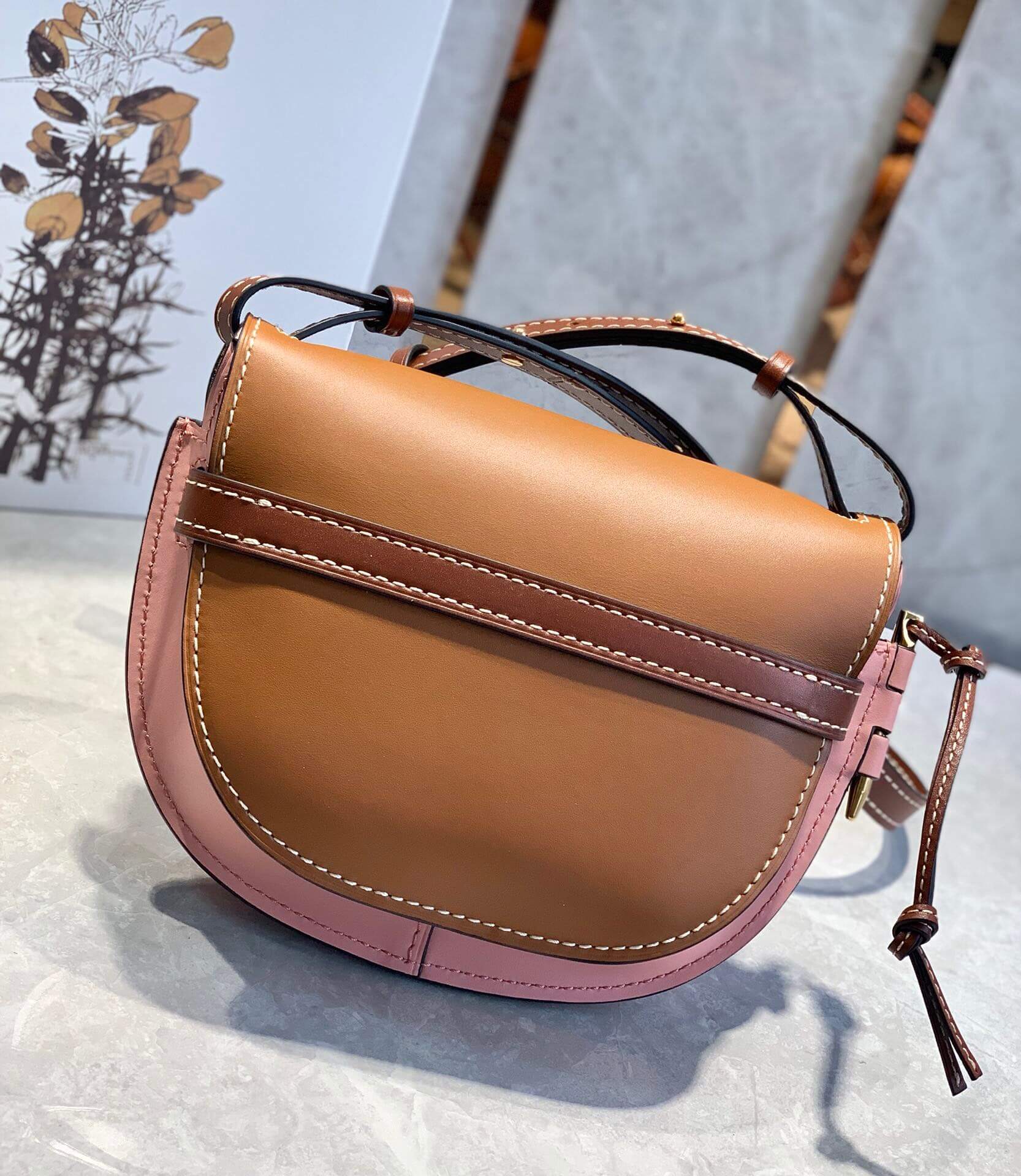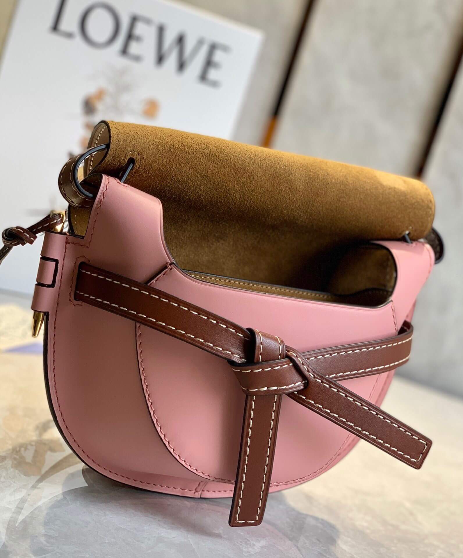 Meticulously crafted in soft calfskin, the Gate Dual displays LOEWE´s unrivalled leather craftsmanship with a saddle-stitched knotted leather strap and a side-latched metal pin that gives the bag its name. This small version has a adjustable shoulder strap in calfskin and jacquard with a repeat LOEWE pattern.