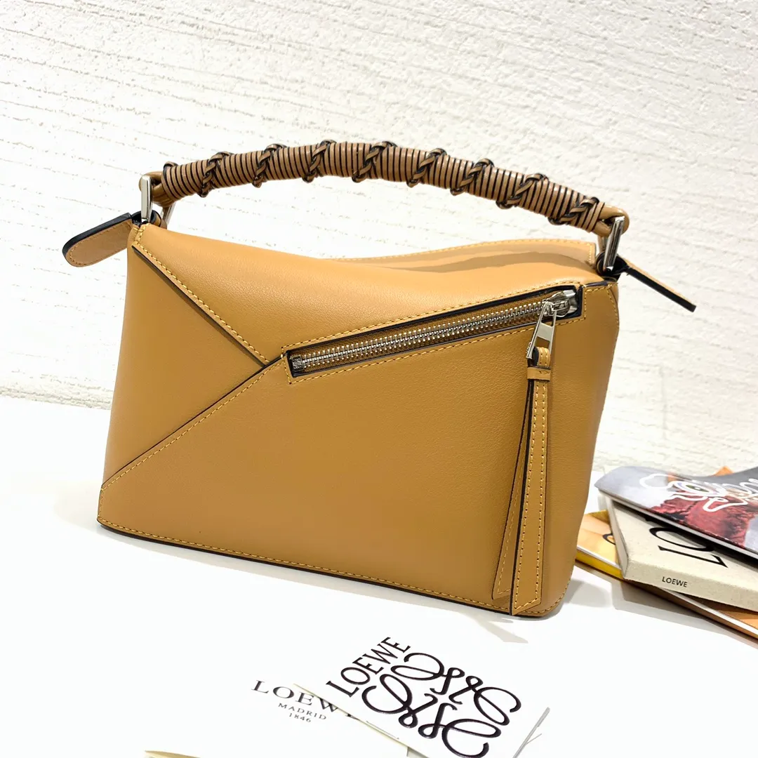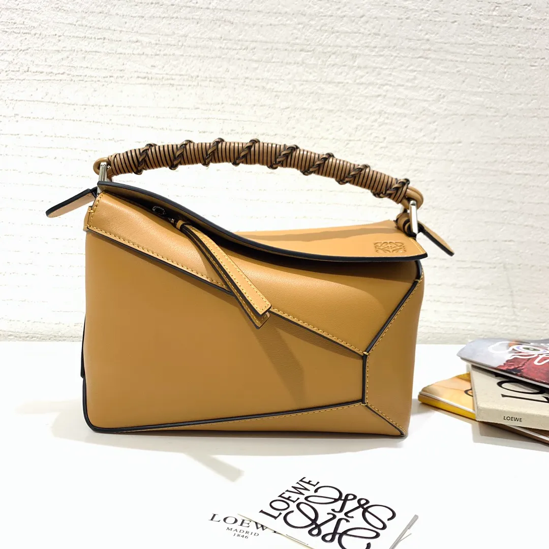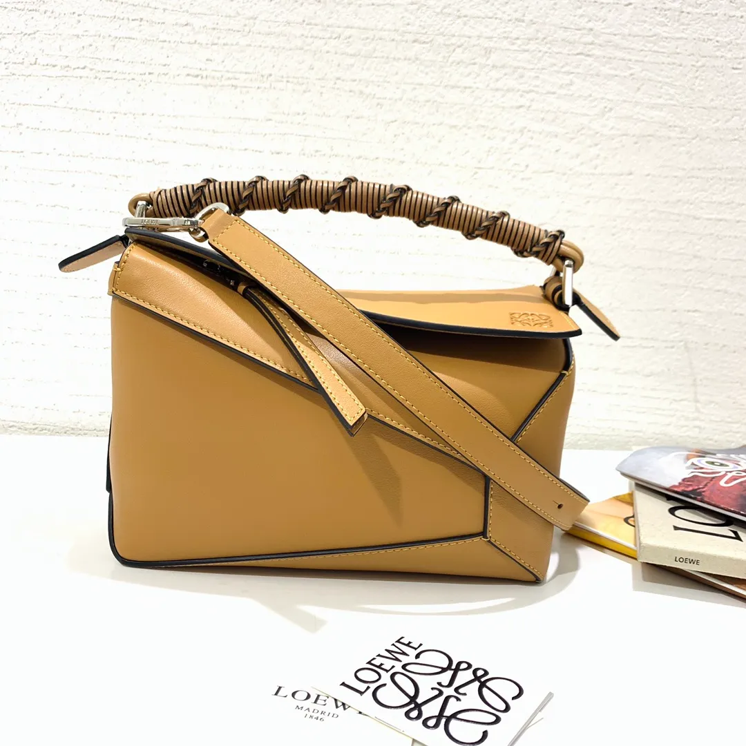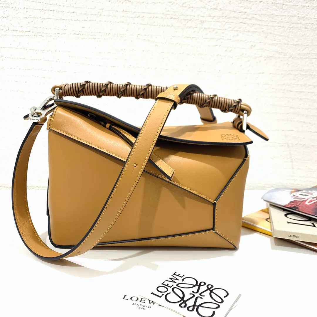 The Puzzle bag is the debut bag for LOEWE by Creative Director Jonathan Anderson. A cuboid shape and precise cutting technique create Puzzles distinctive geometric lines. This small version is crafted in nappa calfskin, has overstitched edges and a hand-woven top handle.