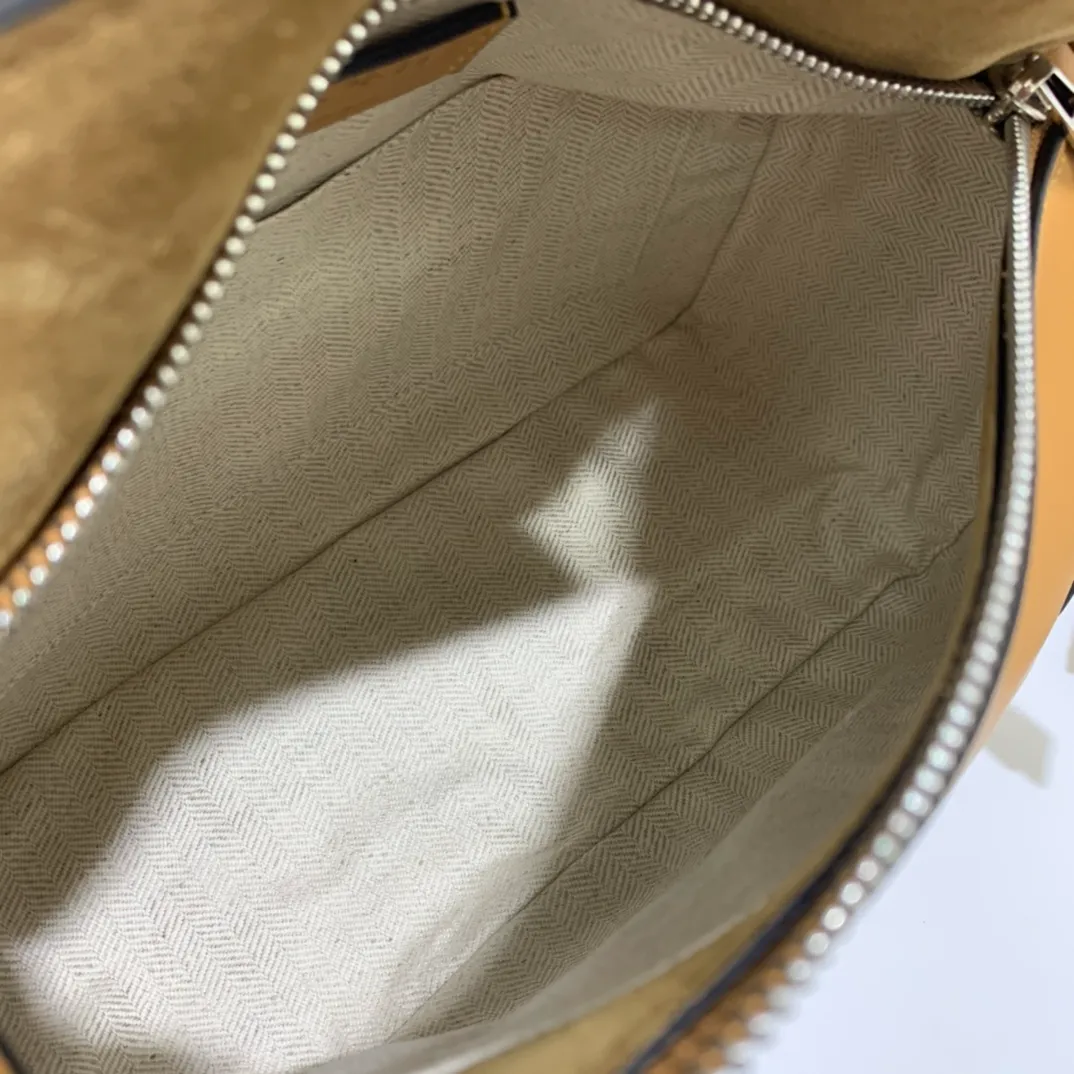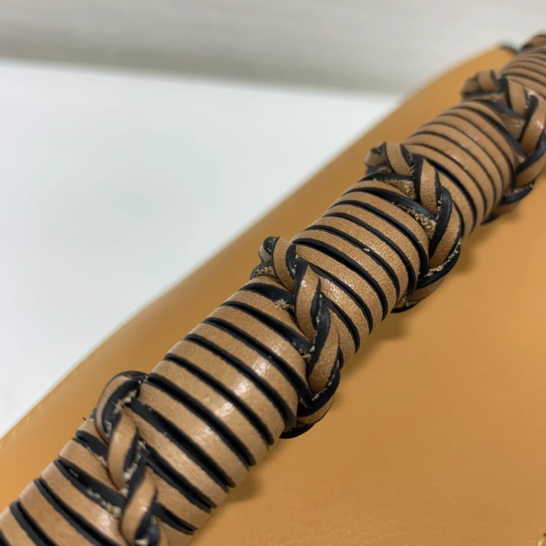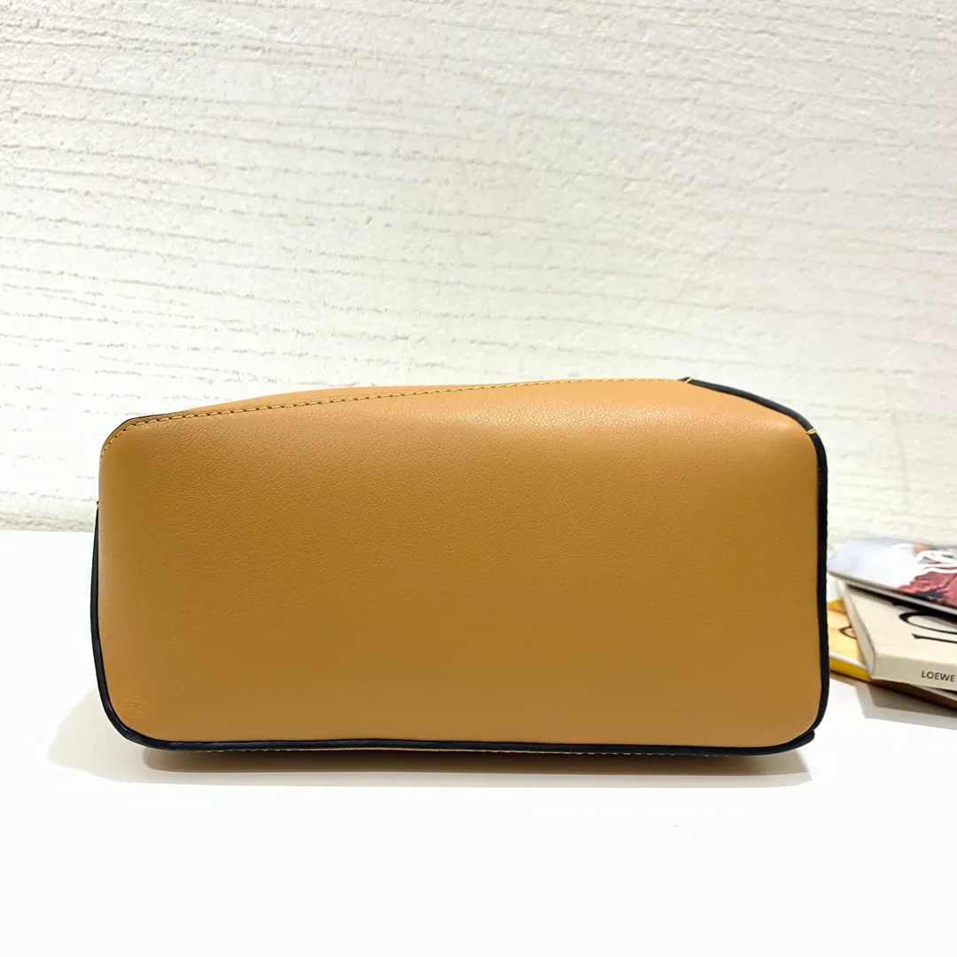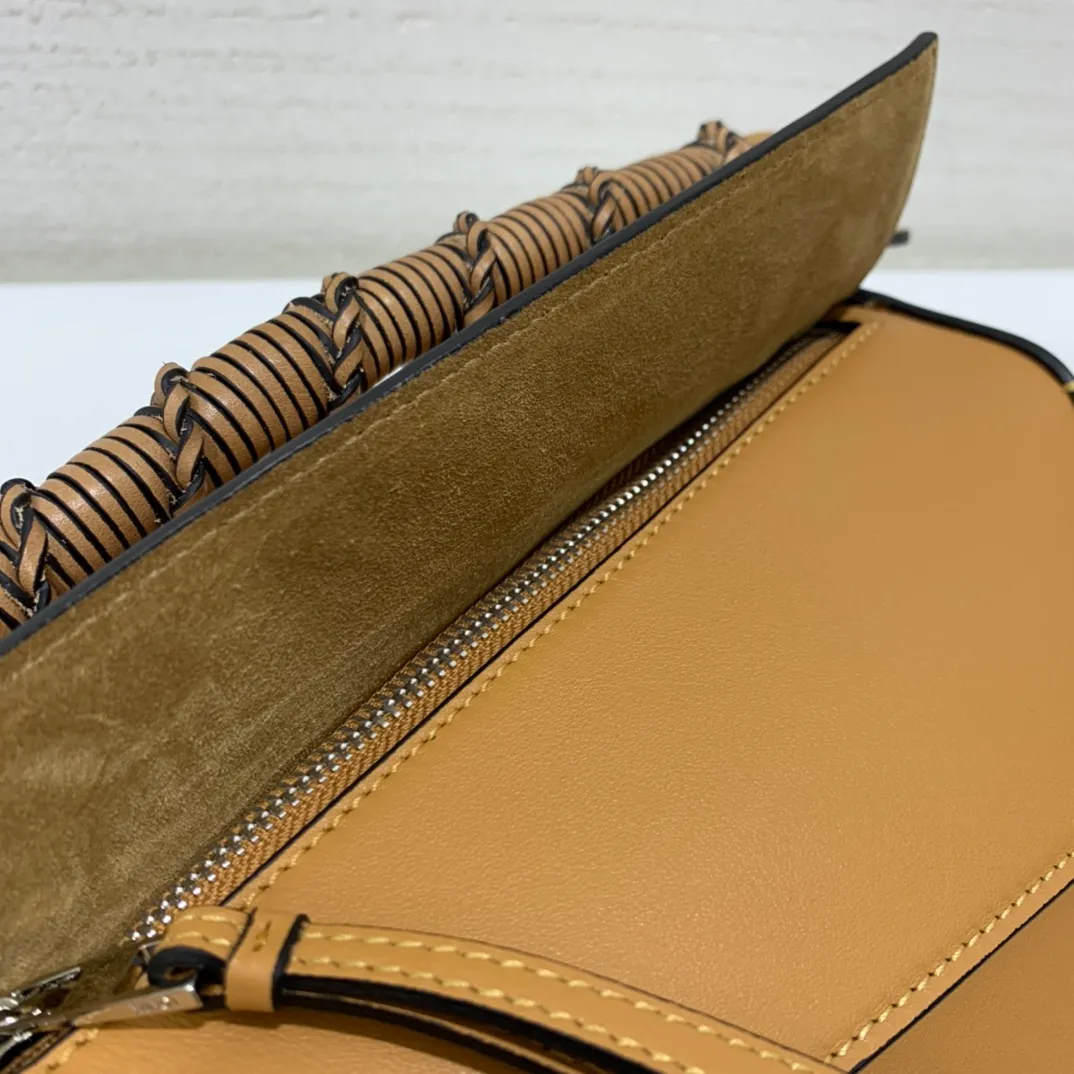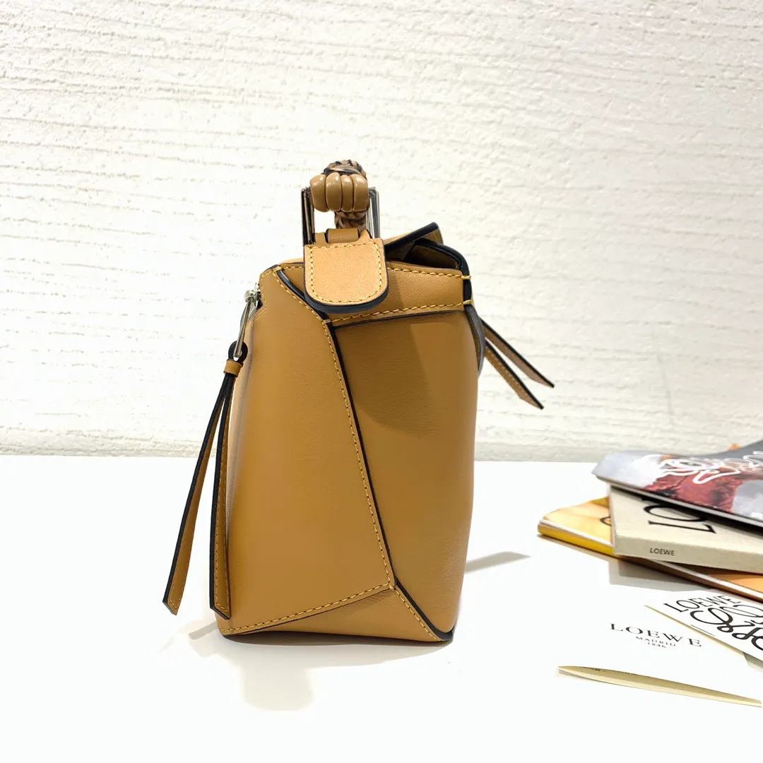 The Puzzle bag is the debut bag for LOEWE by Creative Director Jonathan Anderson. A cuboid shape and precise cutting technique create Puzzles distinctive geometric lines. This small version is crafted in nappa calfskin, has overstitched edges and a hand-woven top handle.