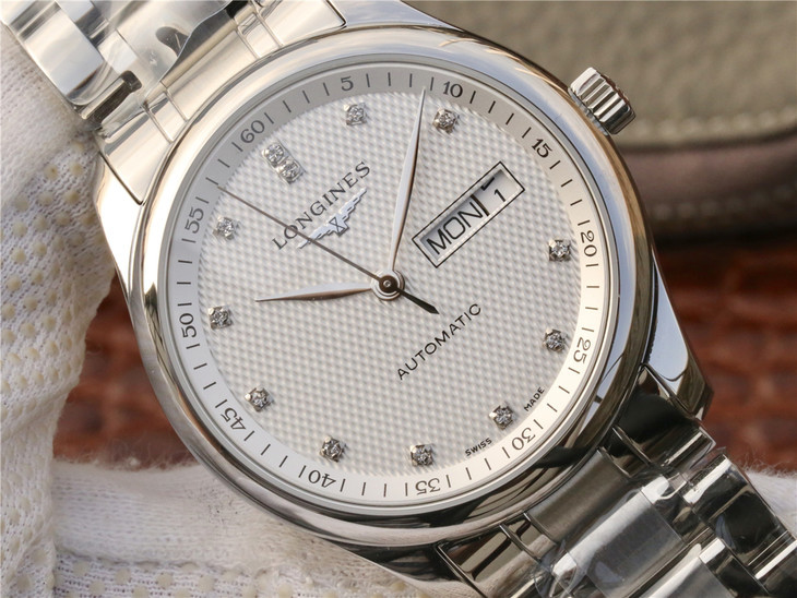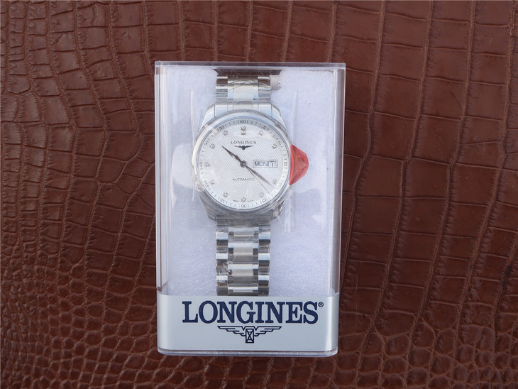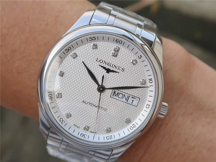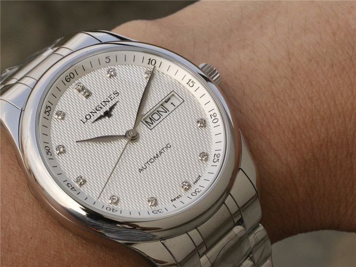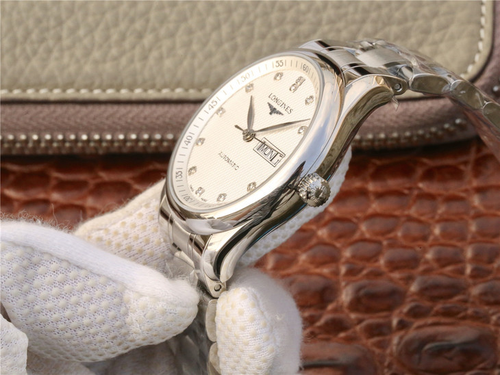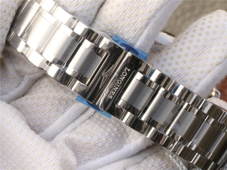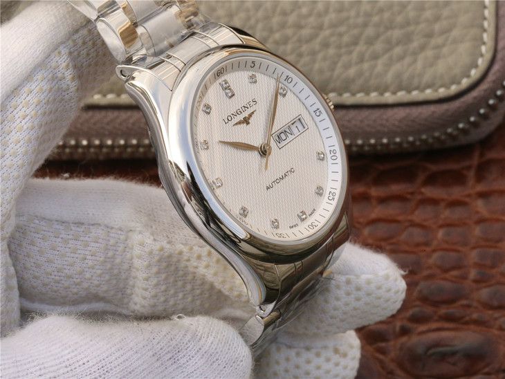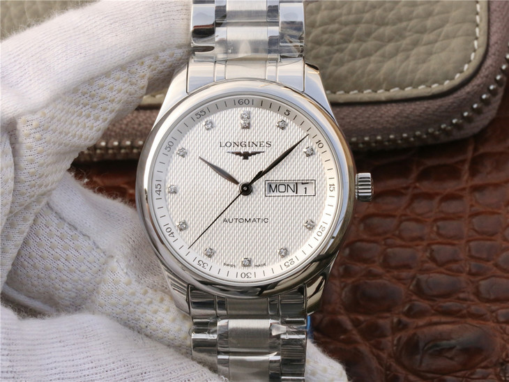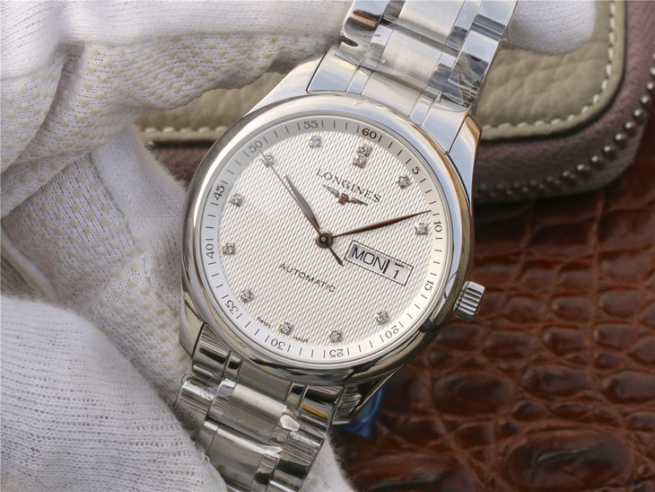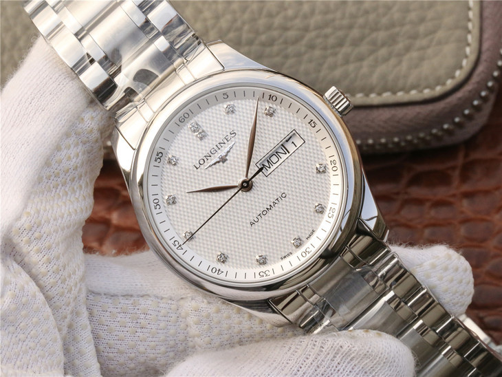 Reference L2.910.4.77.6 has a stainless steel case of 40mm and a silver ‘Barleycorn’ dial with diamond indexes. It is fitted with a stainless steel bracelet.