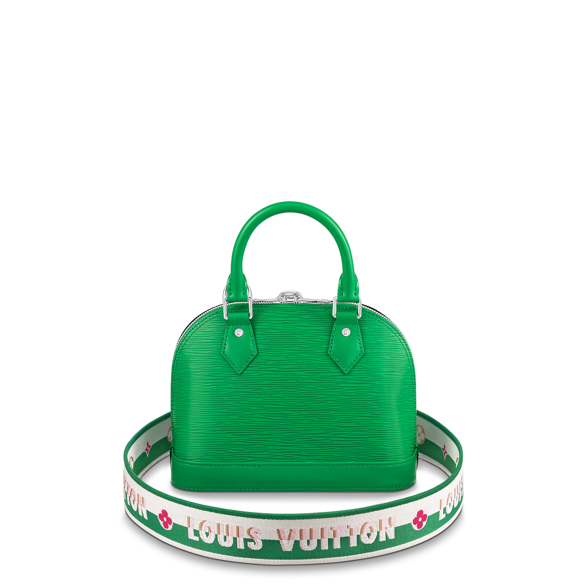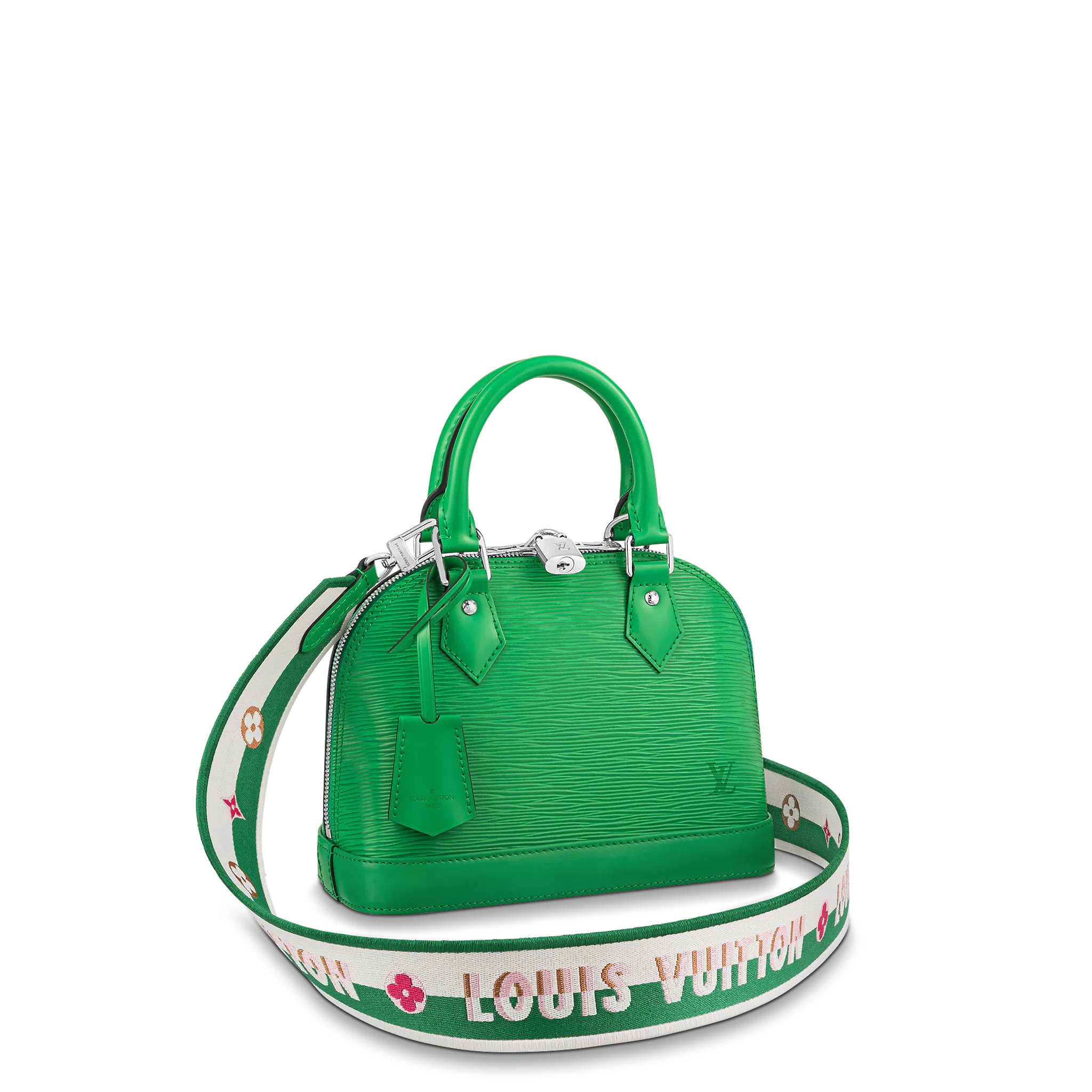 One of the House’s most recognizable bags, the adorable Alma BB gets a sporty makeover thanks to a new Jacquard strap. The fashionably wide strap is embroidered with Louis Vuitton on one side and Monogram Blossoms on the other, and features delicate stitching along its edges. Made from colorful Epi leather, this bag will definitely turn heads.