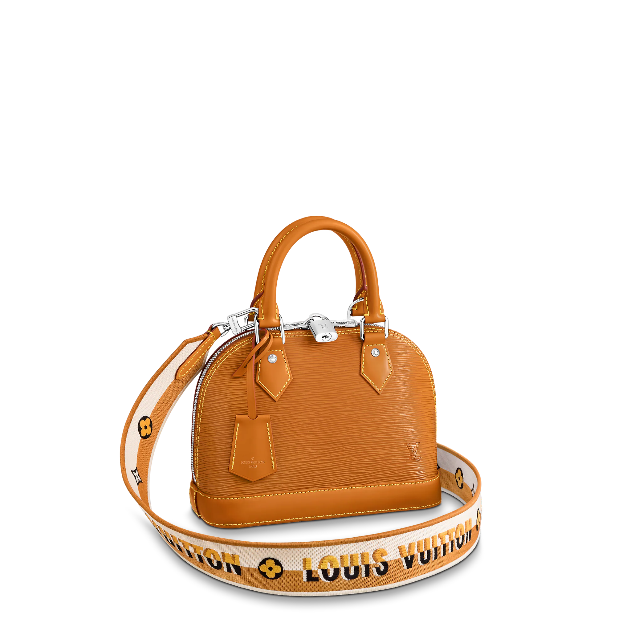 One of the House’s most recognizable bags, the adorable Alma BB handbag gets a sporty makeover thanks to a new Jacquard strap. The fashionably wide strap is embroidered with Louis Vuitton on one side and Monogram Blossoms on the other, and features delicate stitching along its edges. Made from colorful Epi leather, this bag will definitely turn heads.