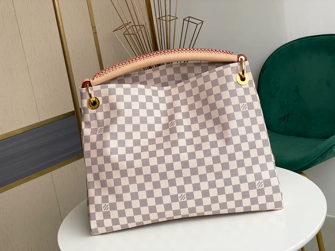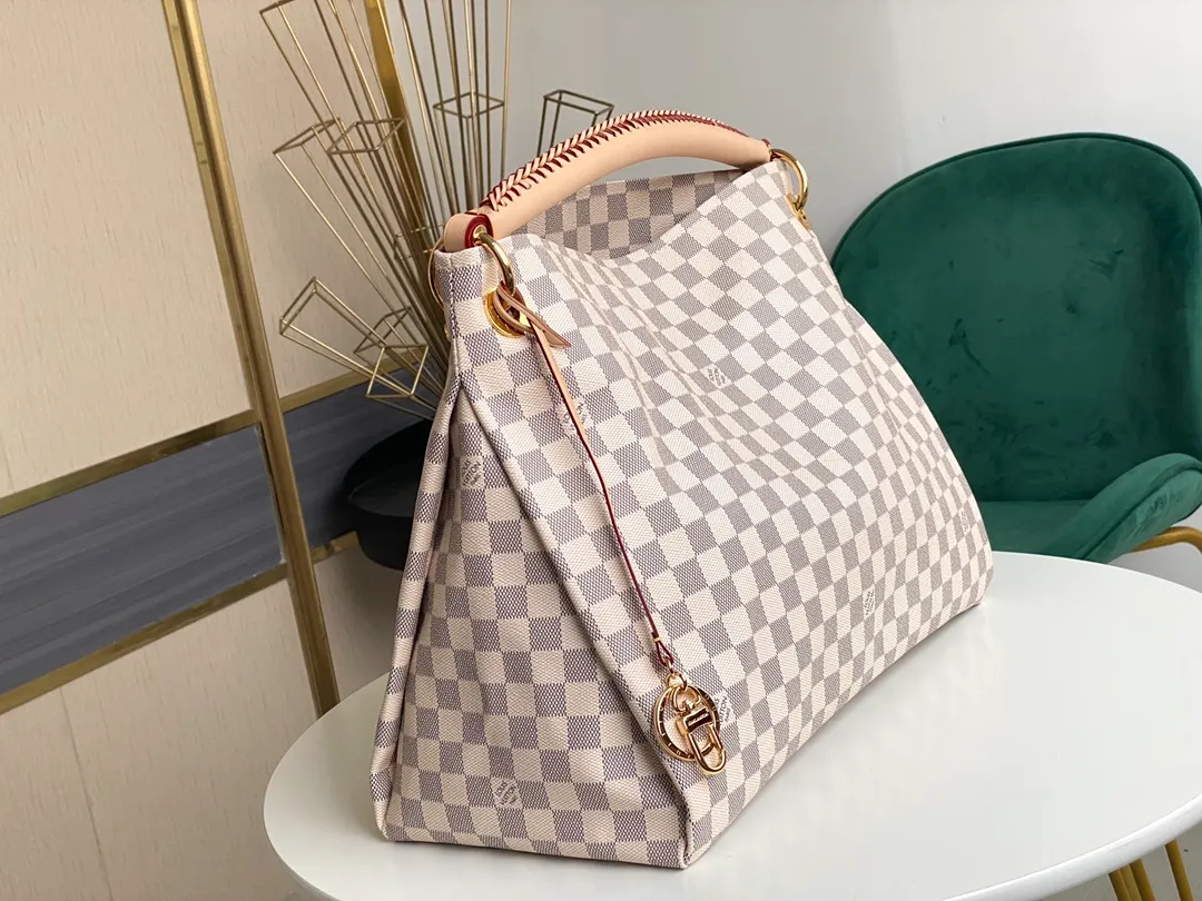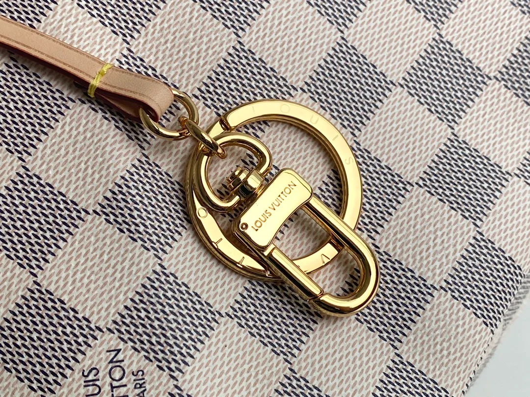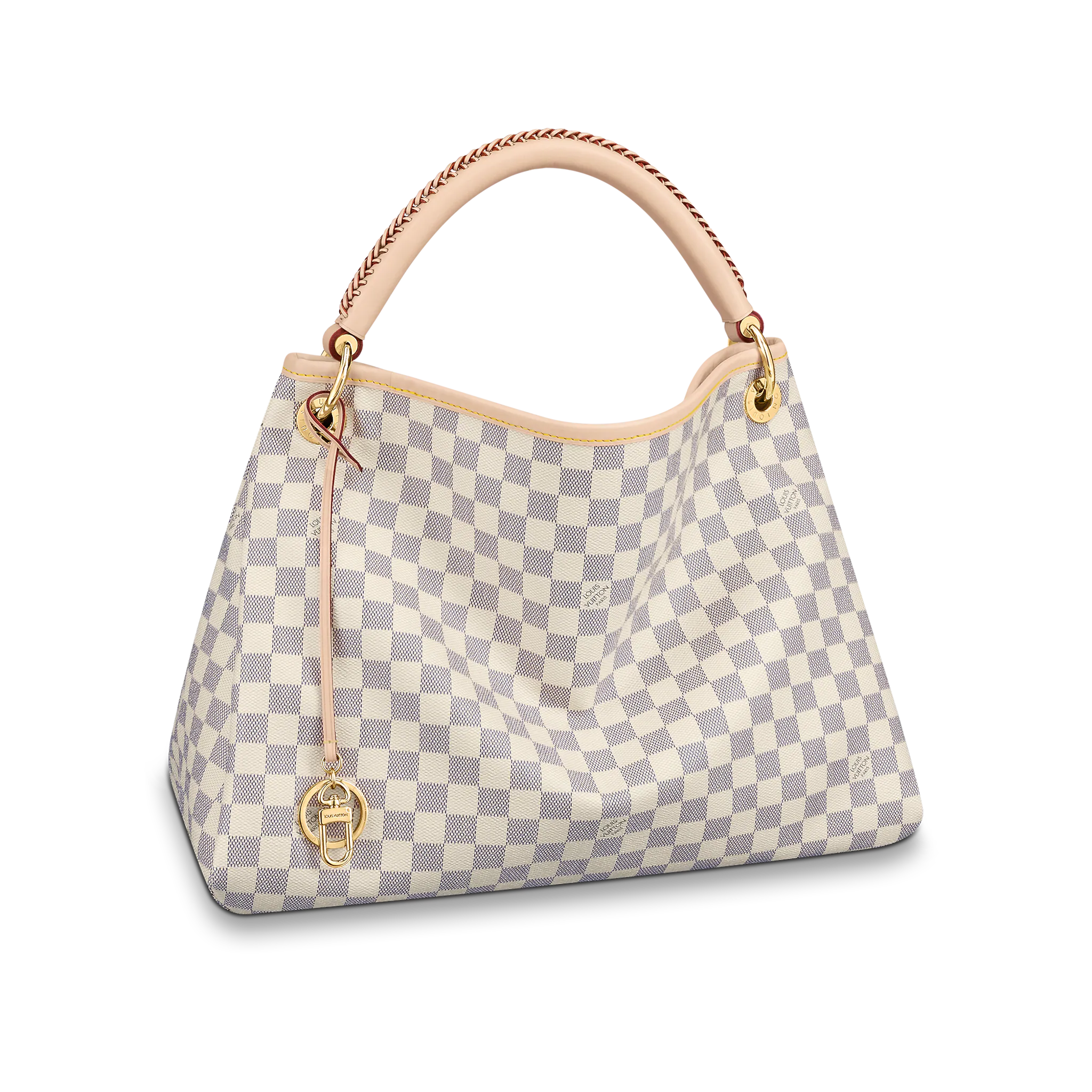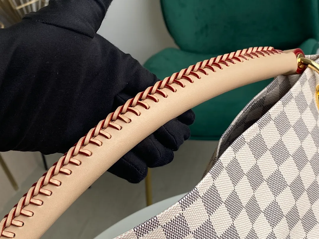The Artsy MM looks fresh and feminine in supple Damier Azur canvas. Adorned with shiny golden brass and a chic bag charm, its exquisite handcrafted leather handle adds a luxurious crowning touch.