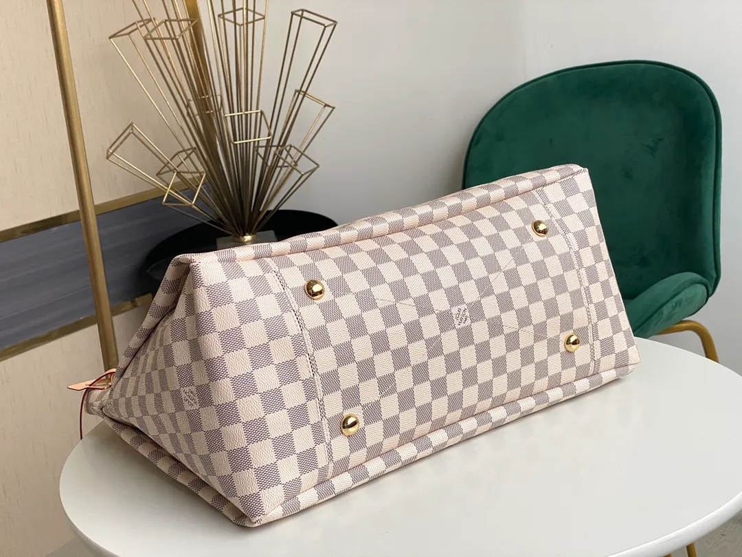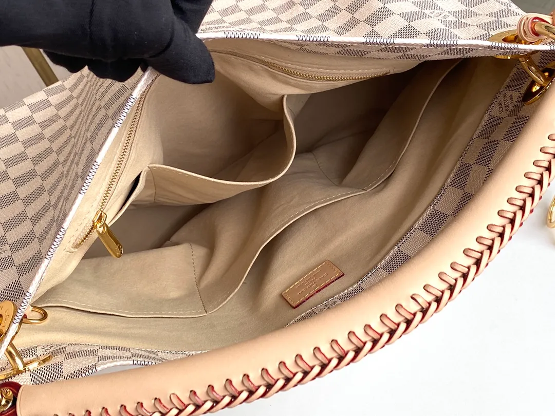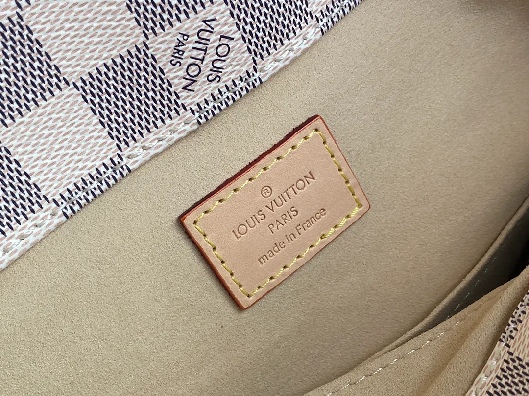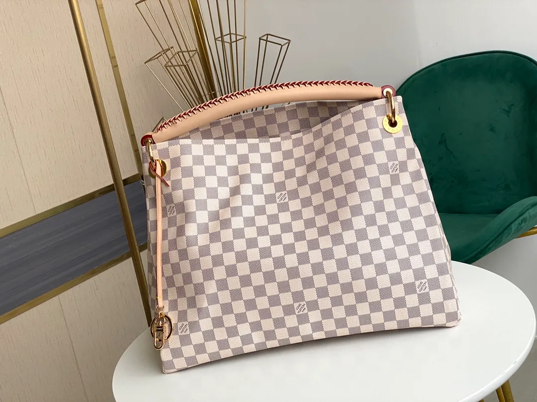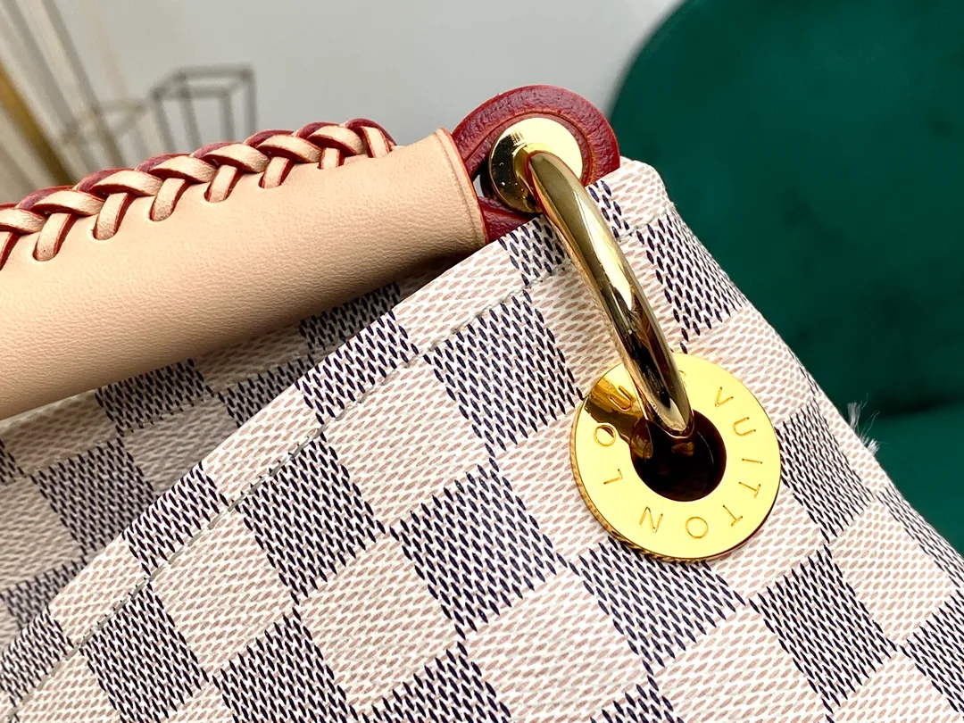 The Artsy MM looks fresh and feminine in supple Damier Azur canvas. Adorned with shiny golden brass and a chic bag charm, its exquisite handcrafted leather handle adds a luxurious crowning touch.