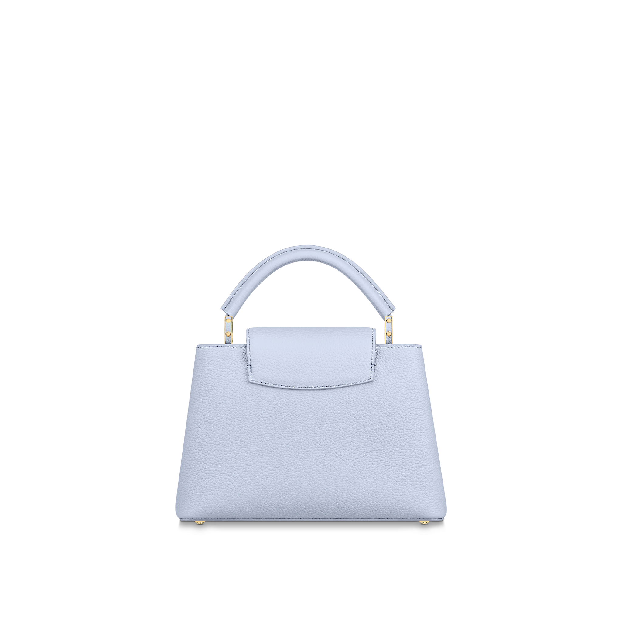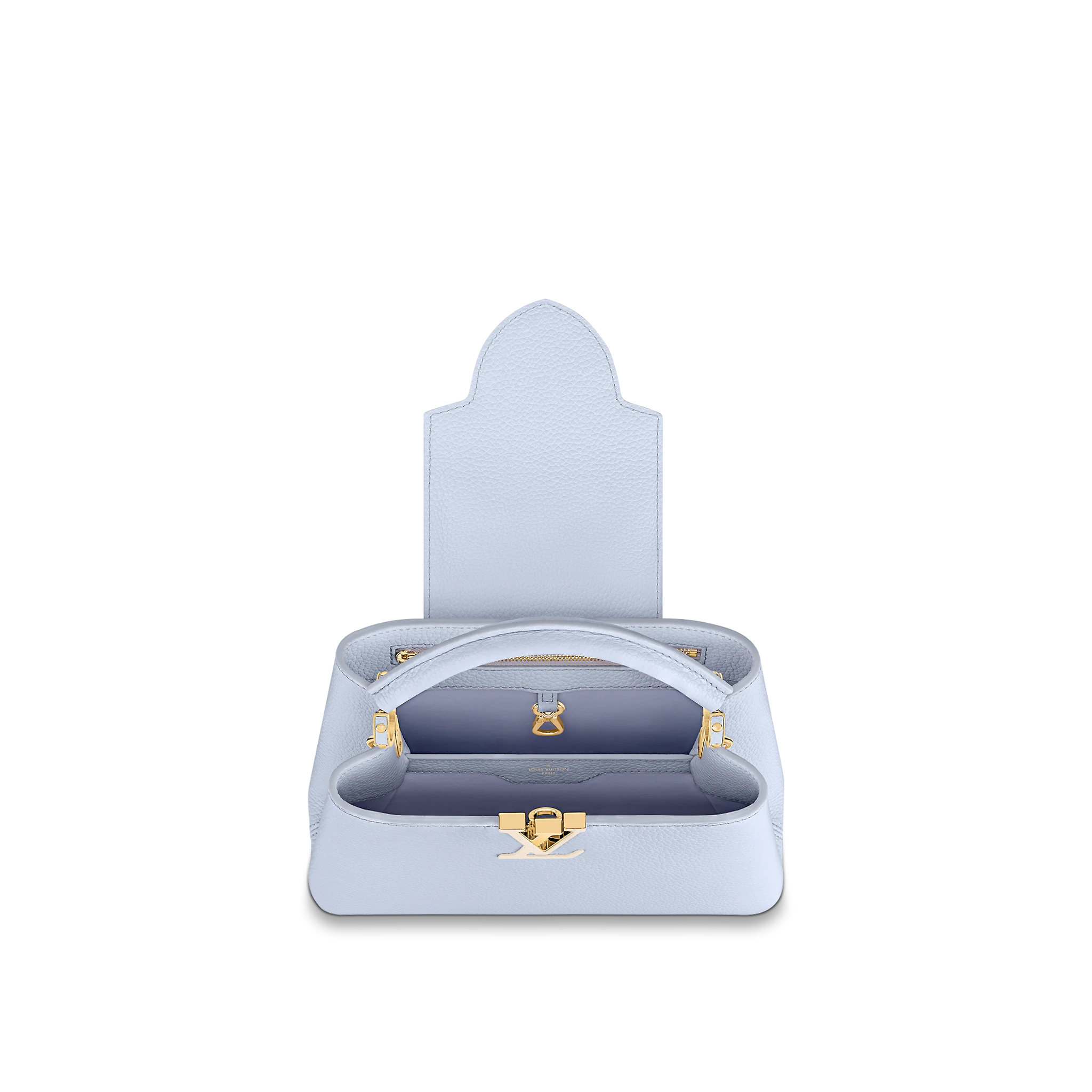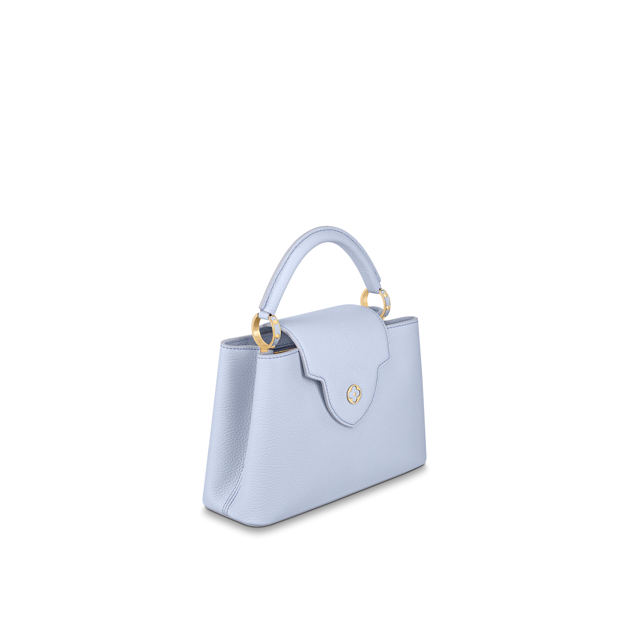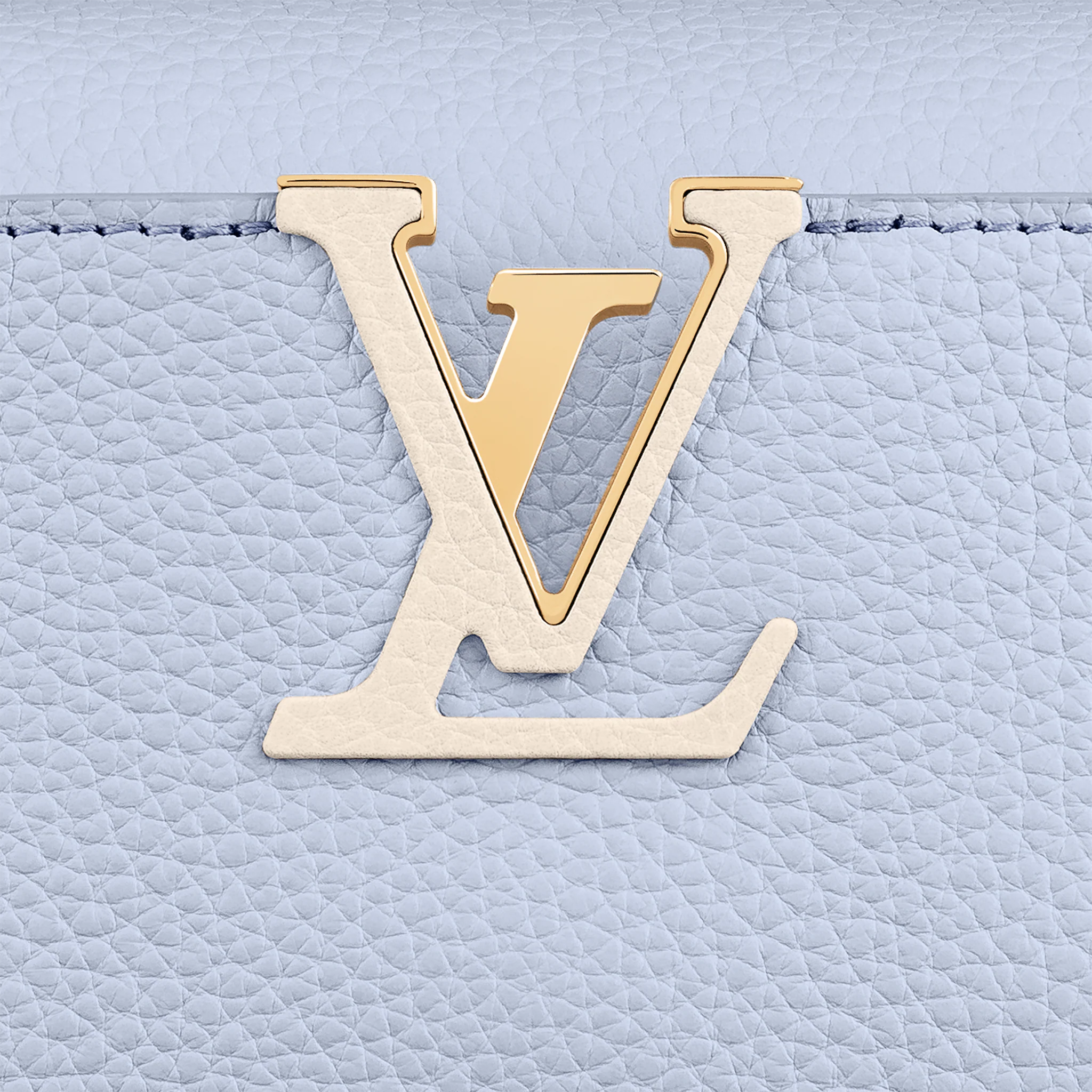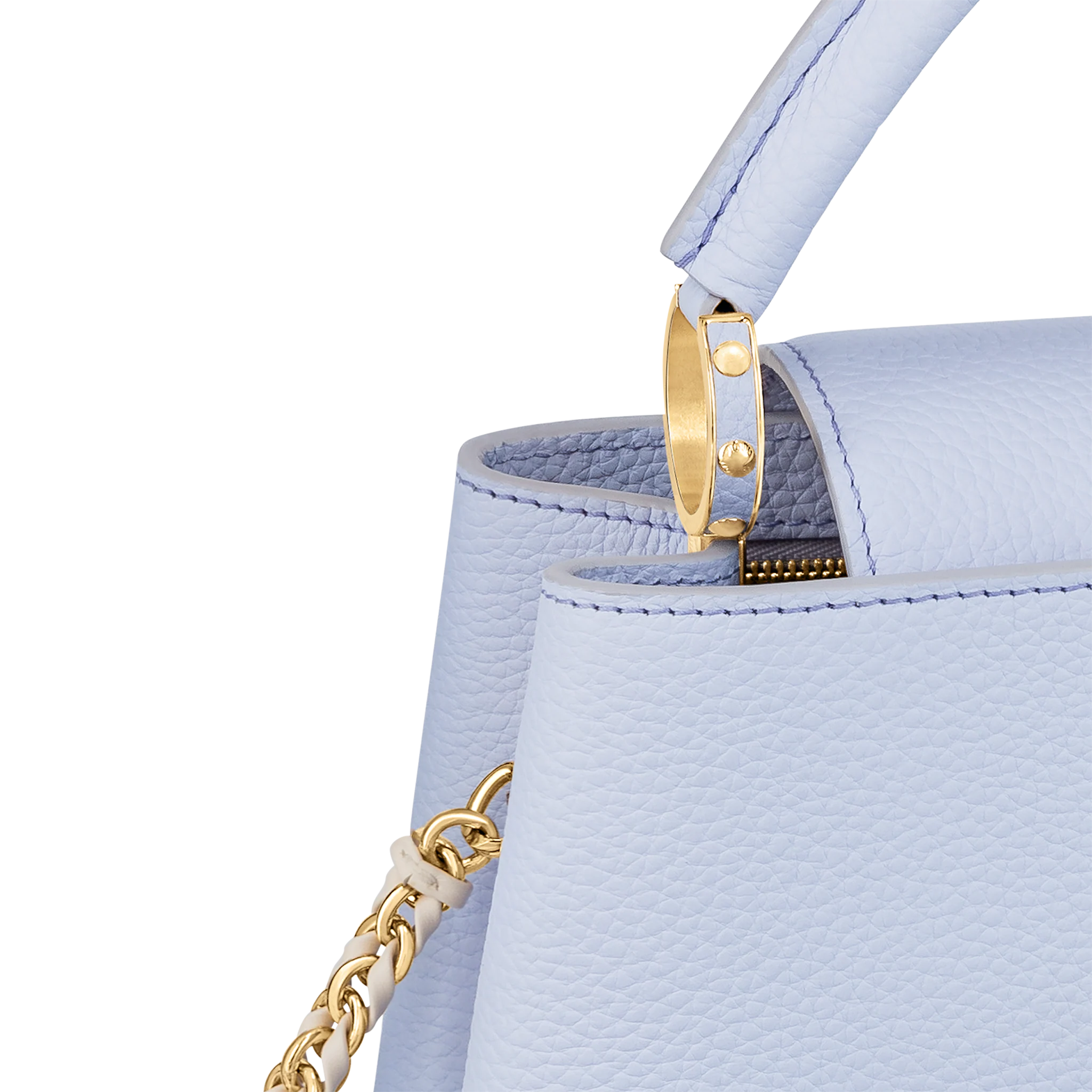 The stylishly Capucines BB handbag looks stunning in Taurillon leather with a crafted gold-color chain braided with leather. The chain is part of a detachable and adjustable strap which allows the bag to be carried on the shoulder or cross-body. The Capucines can be worn with its flap out or tucked inside the bag to feature the iconic LV Initials.