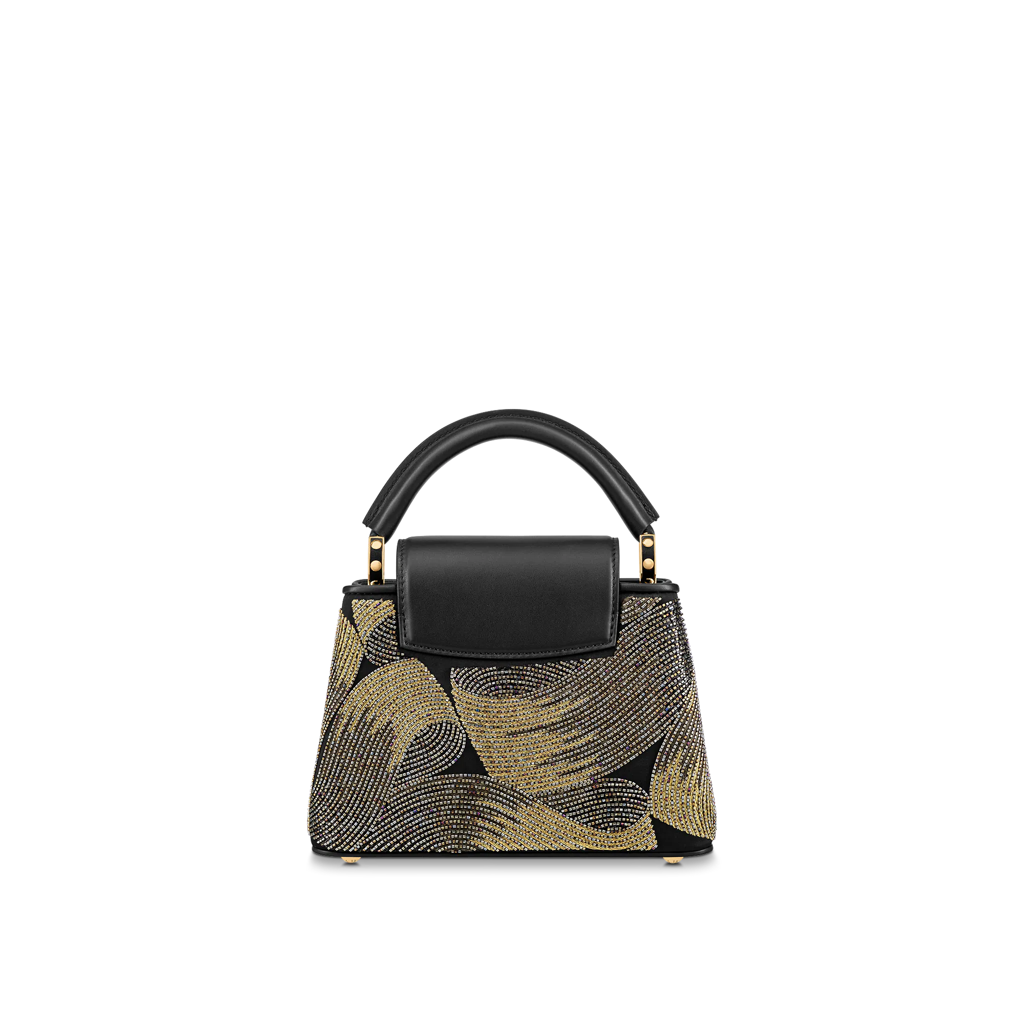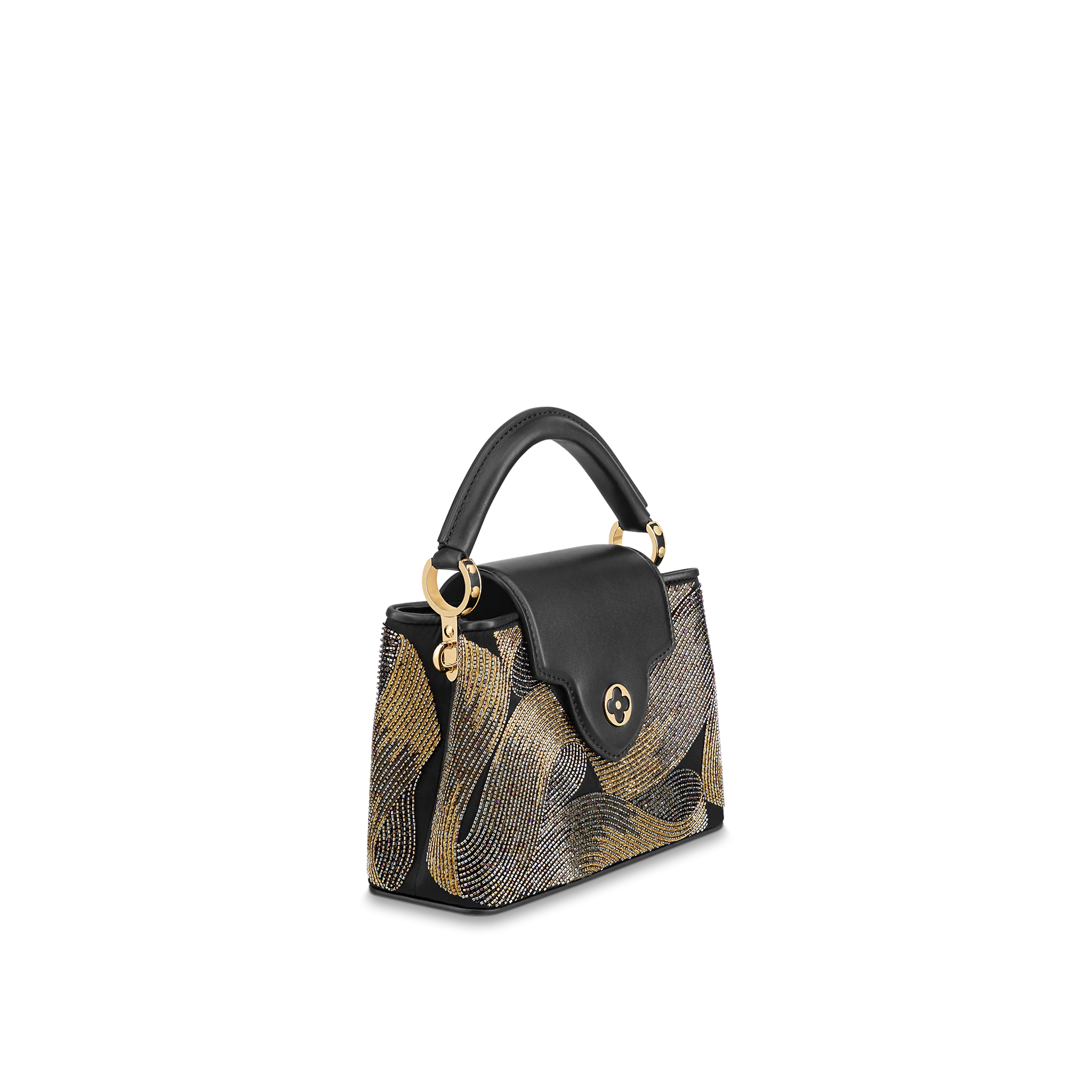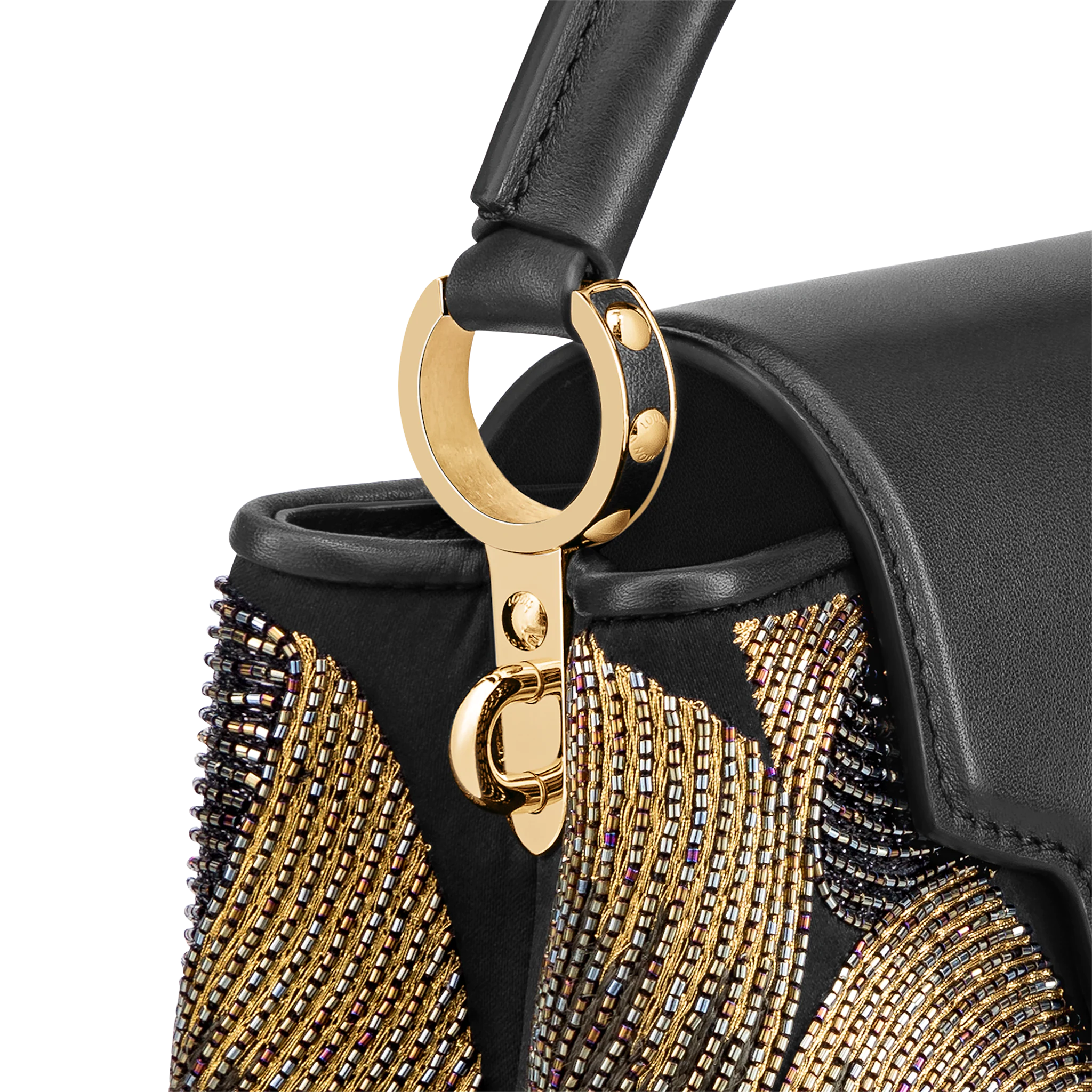 This Capucines Mini handbag is a masterpiece of craftsmanship. Black iridescent pearls are embroidered by hand with different colors of metallic thread, creating a 3D design resembling a brush stroke or golden wave. The engraved pattern on the gold-color LV Initials brings a final touch of luxurious style.