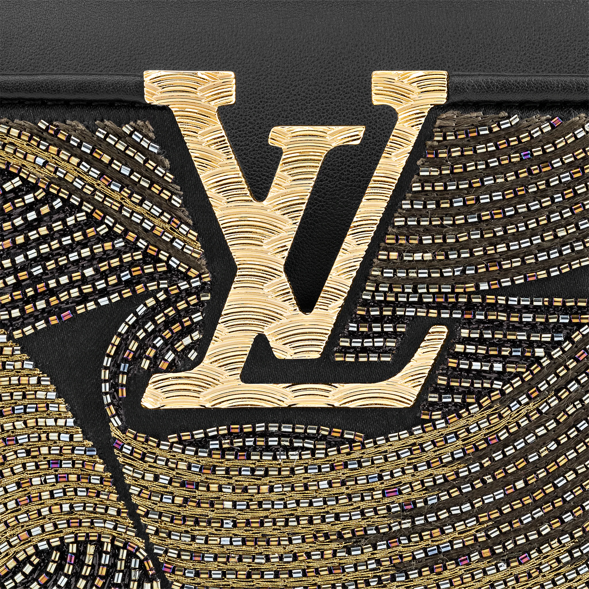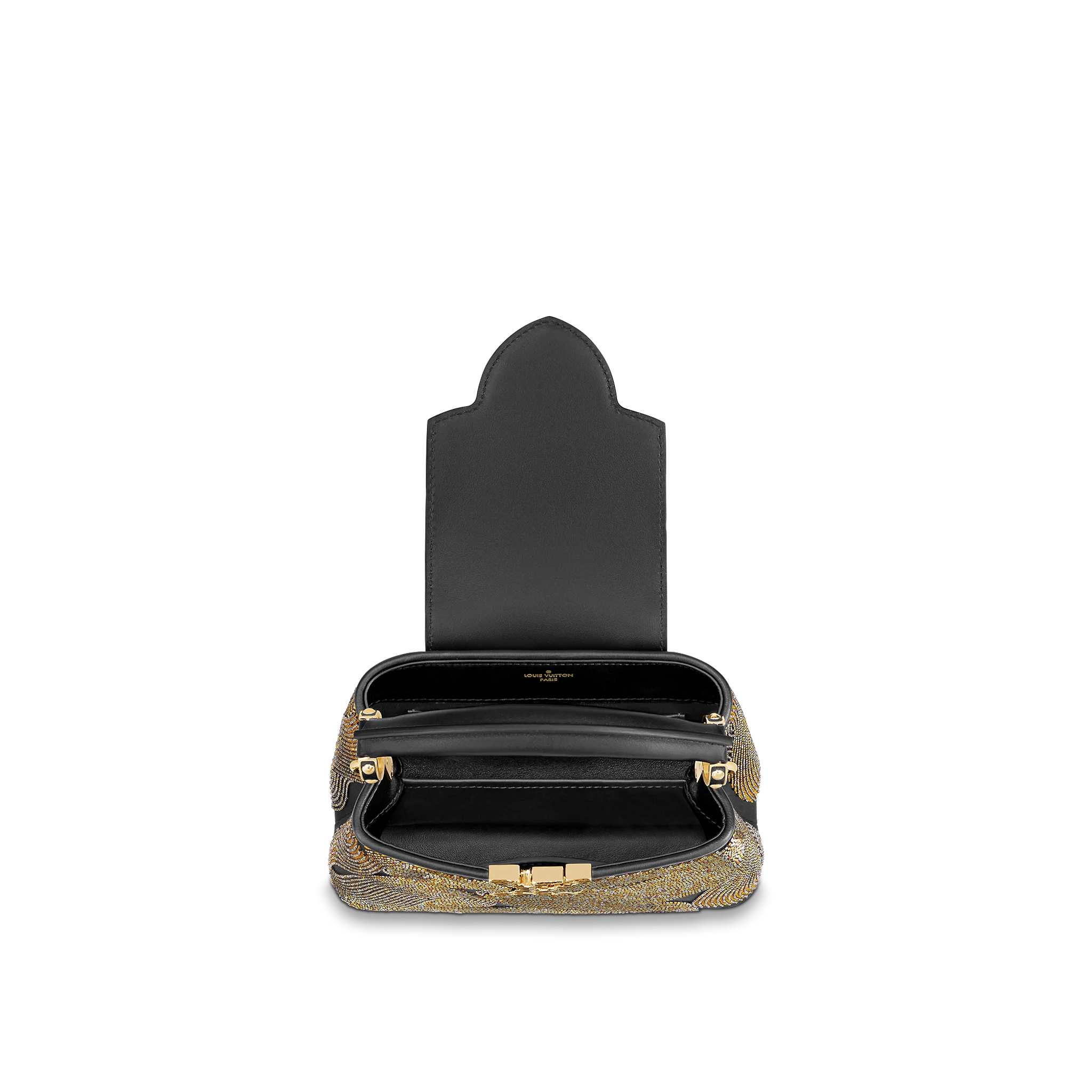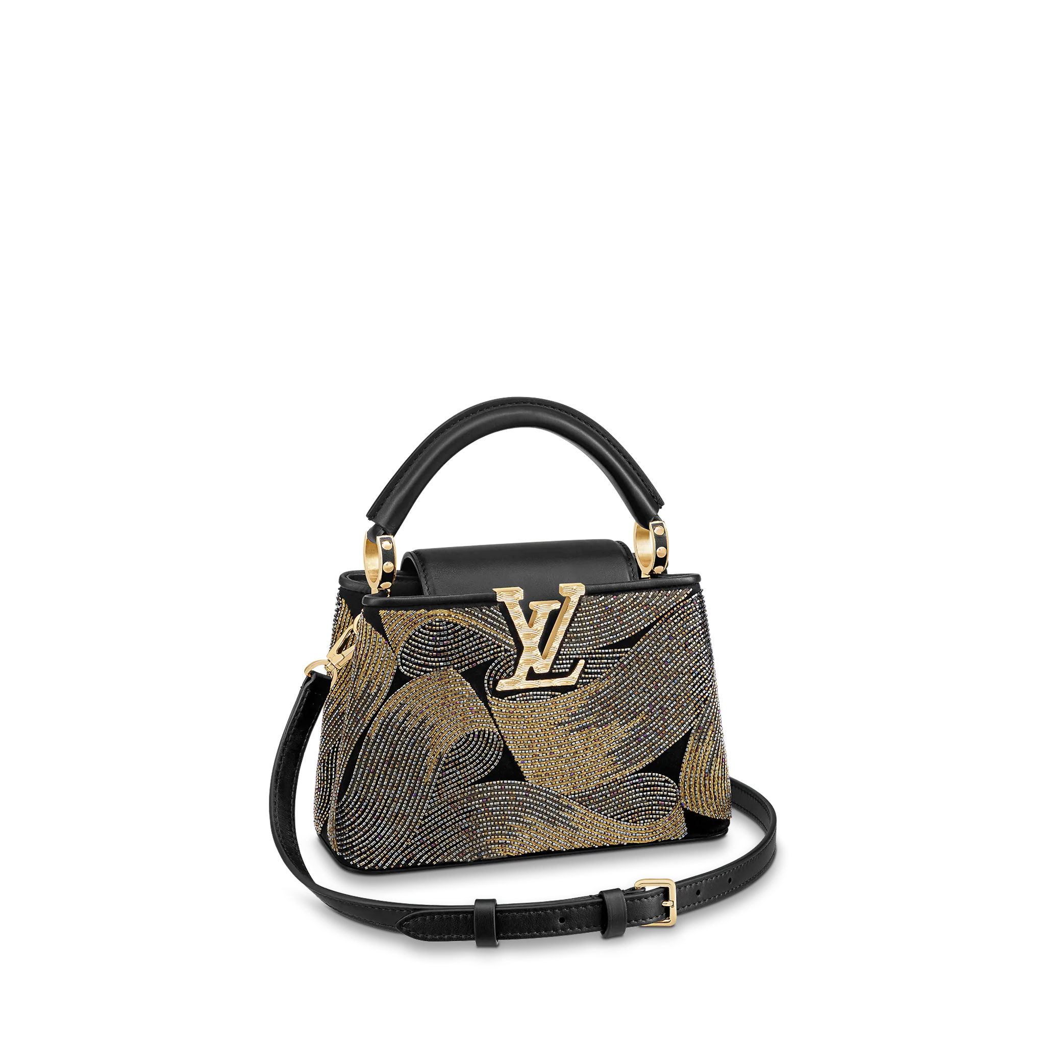 This Capucines Mini handbag is a masterpiece of craftsmanship. Black iridescent pearls are embroidered by hand with different colors of metallic thread, creating a 3D design resembling a brush stroke or golden wave. The engraved pattern on the gold-color LV Initials brings a final touch of luxurious style.