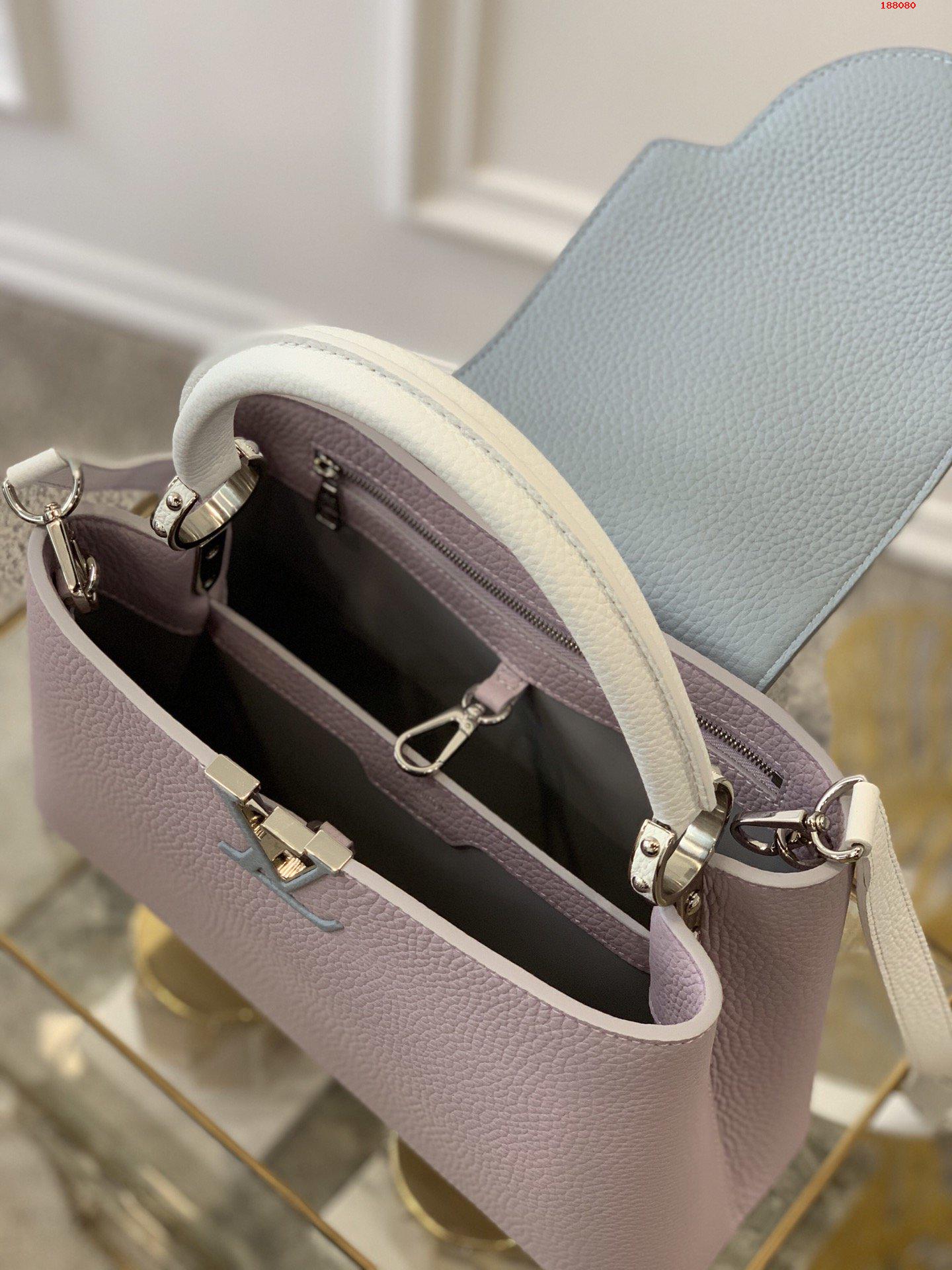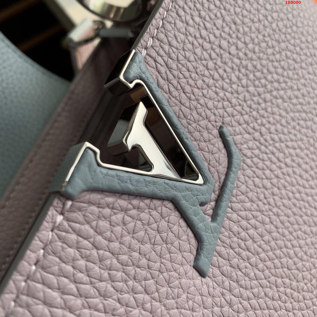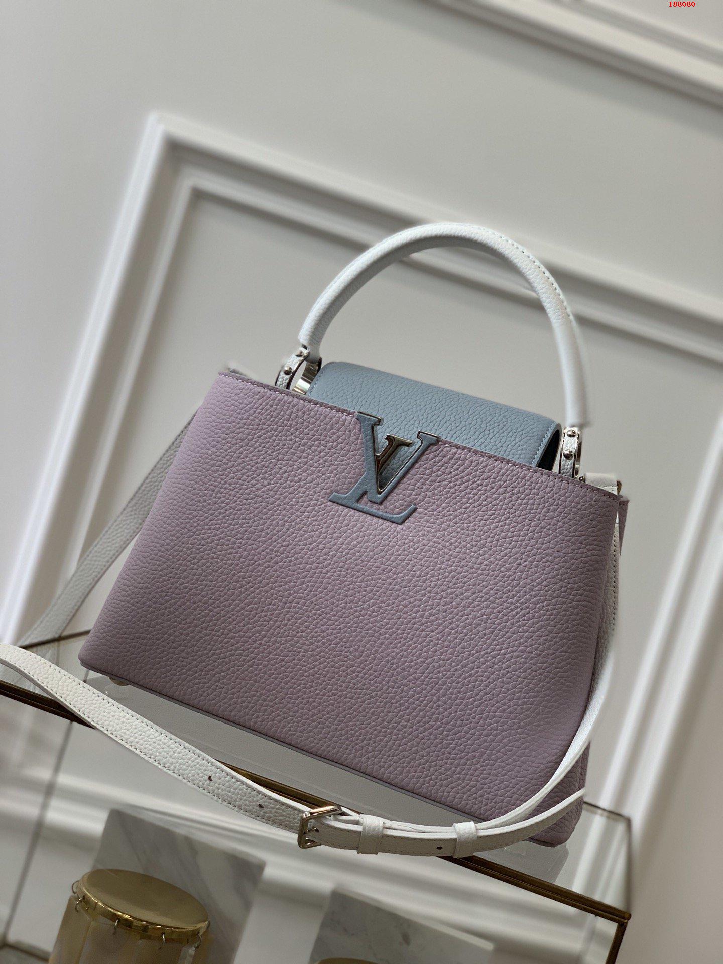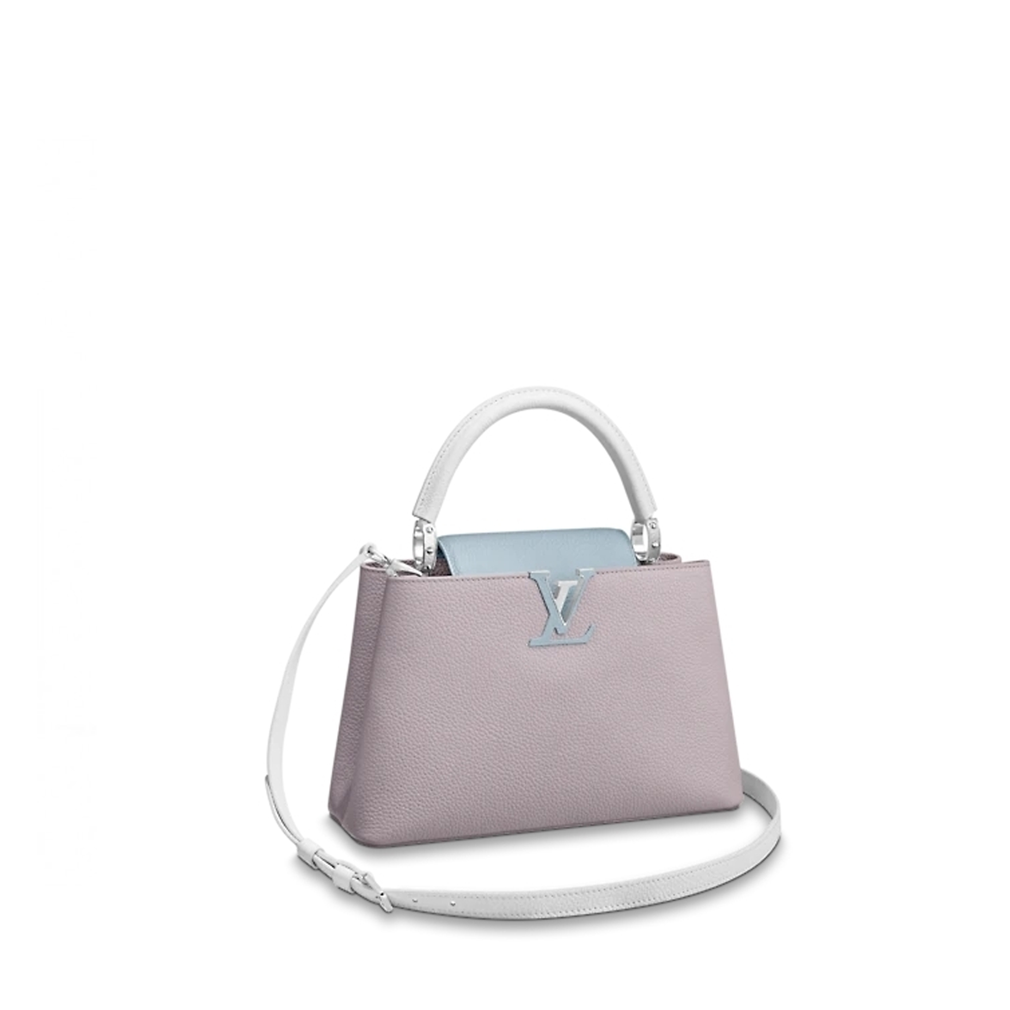 Fresh colorblock accents lend a pop of excitement to the timeless elegance of the Capucines MM handbag. Crafted from full-grain Taurillon leather, this edition features a detachable strap for hand carry. As with all Capucines, the flap can be worn inside the bag to feature the LV Initials signature or outside for a more discreet look.