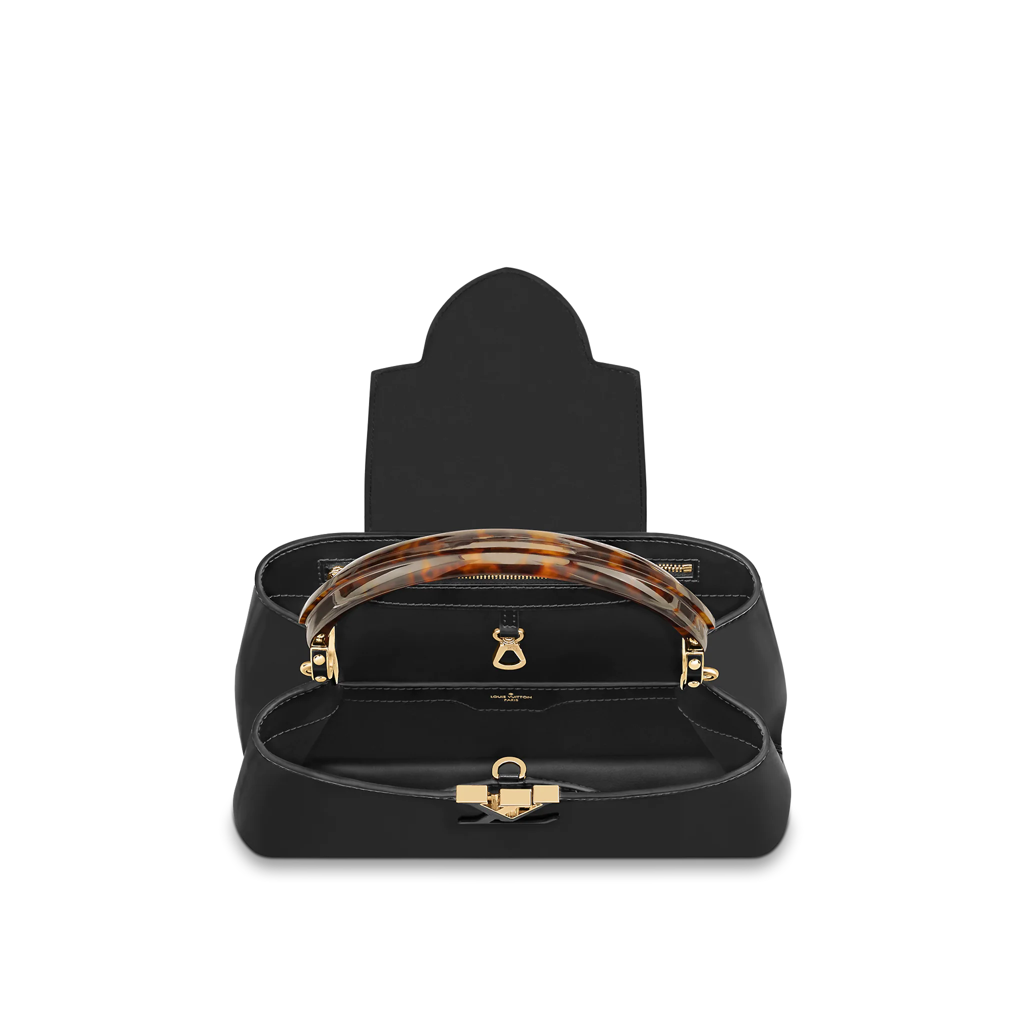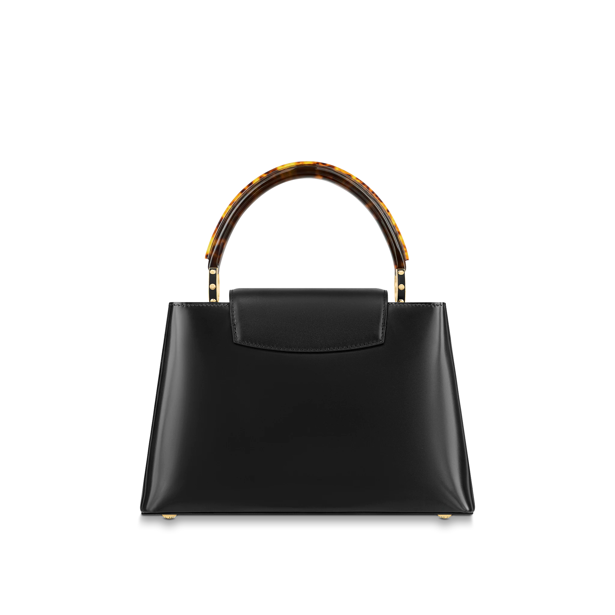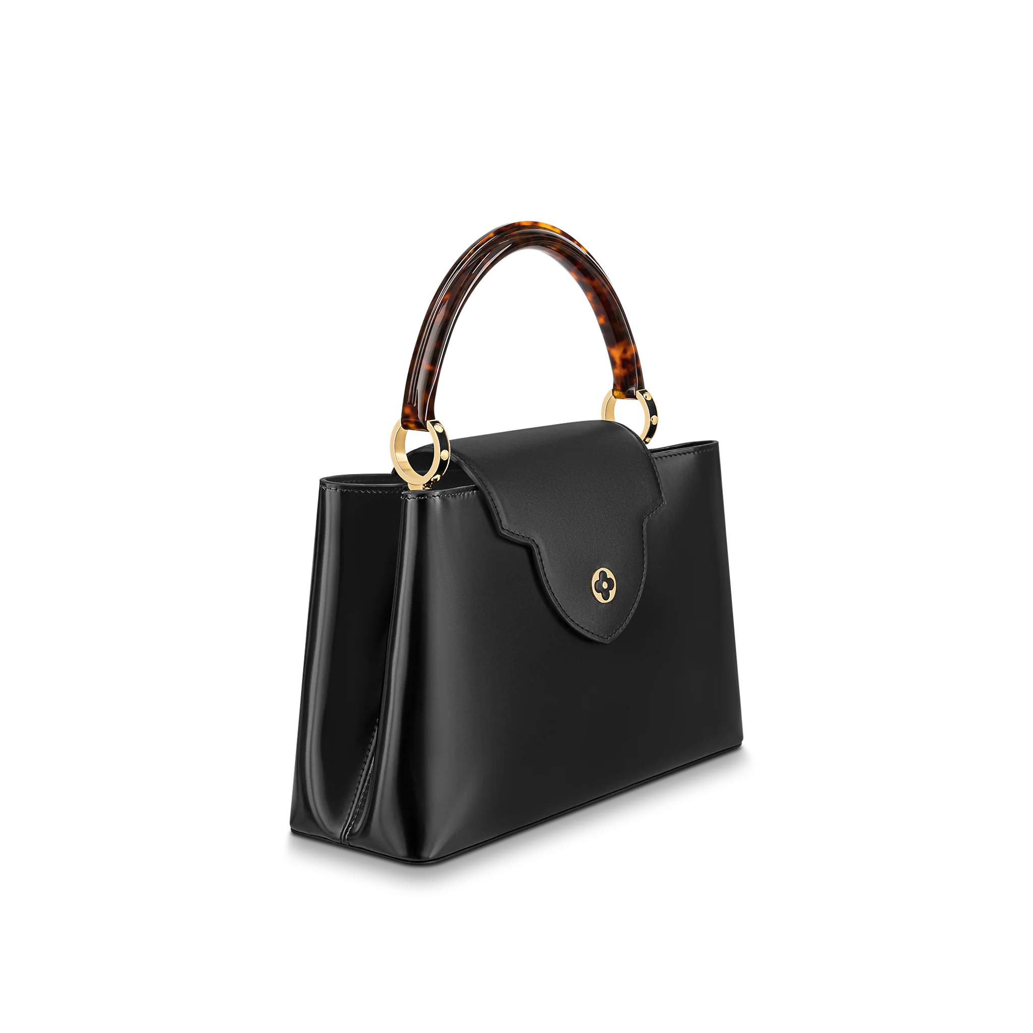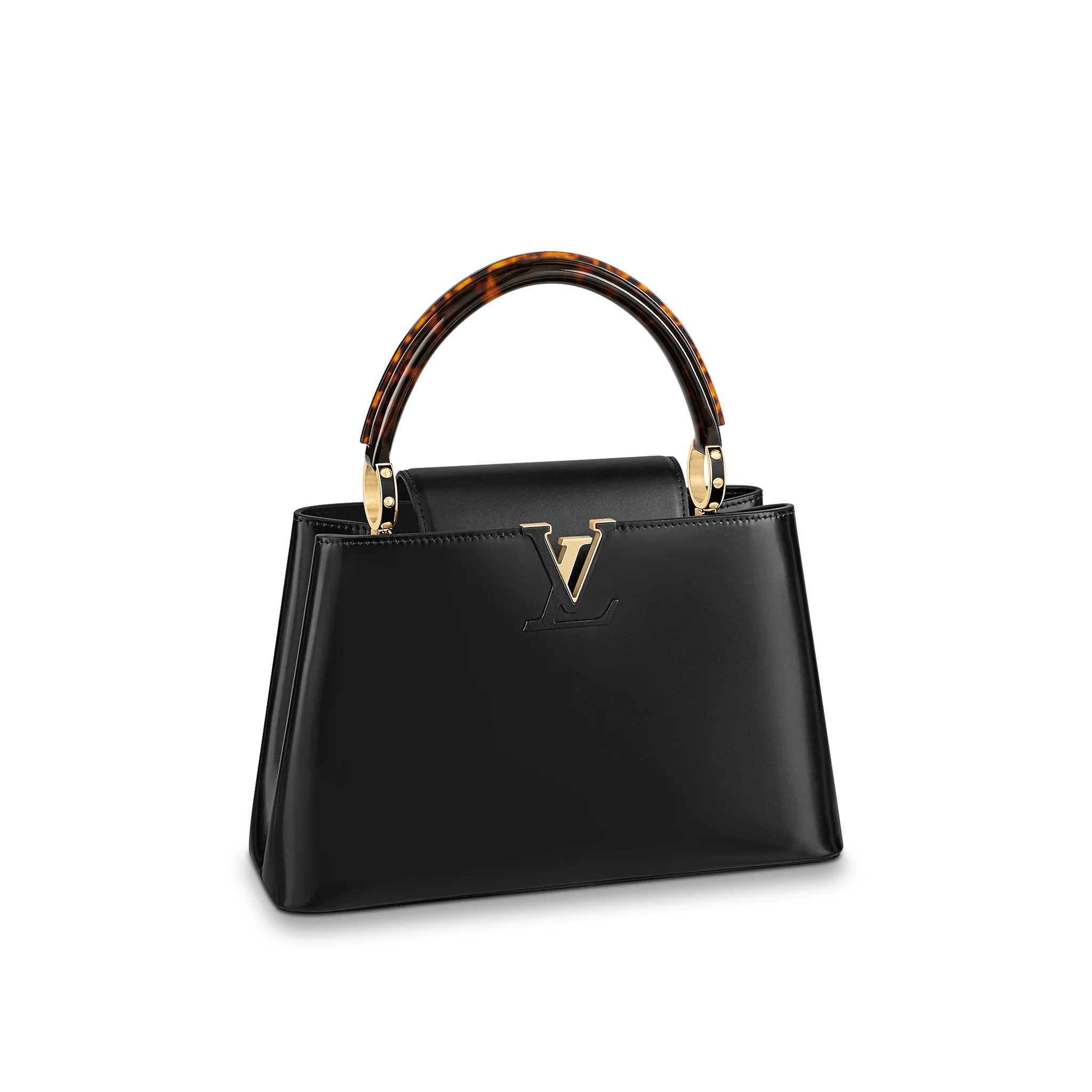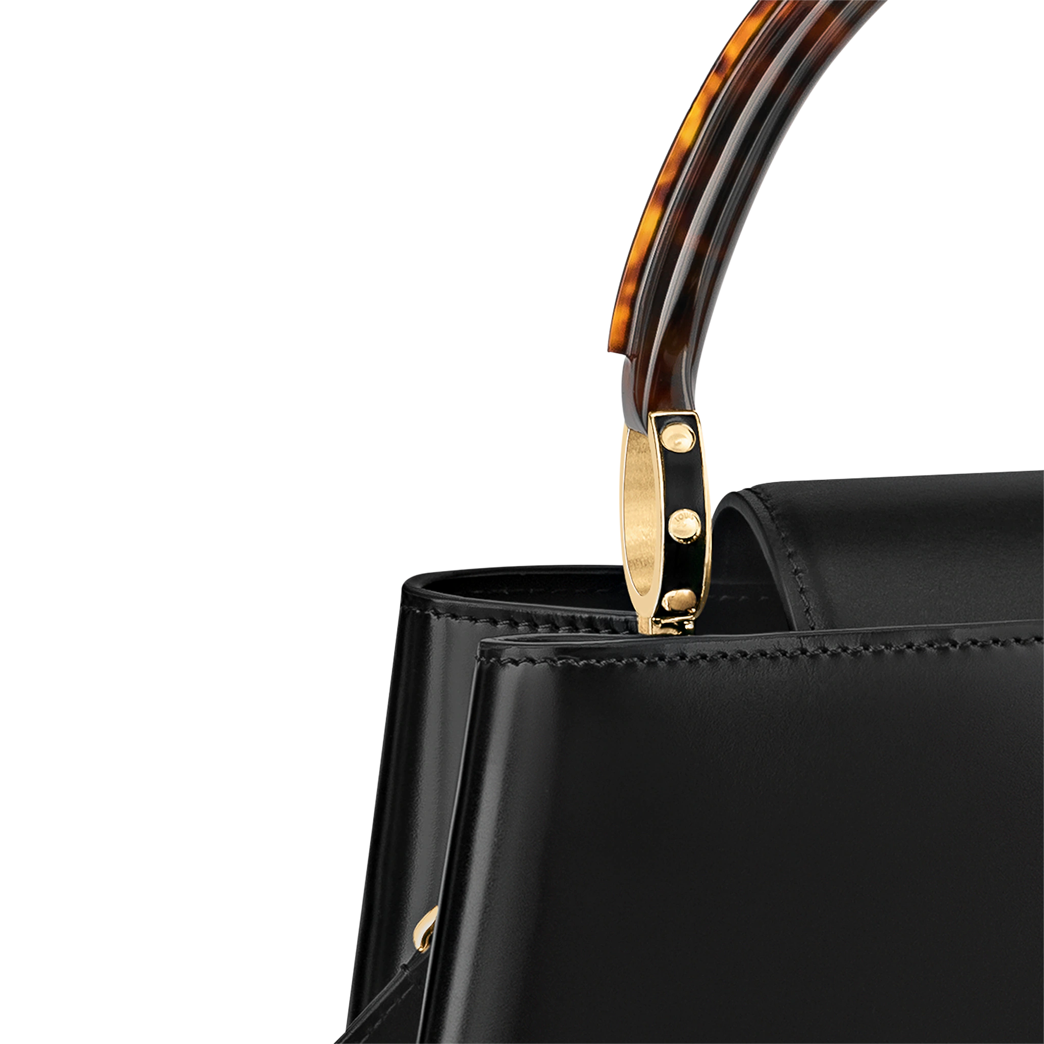 Introducing the Sleek version of the Capucines MM handbag. Fashioned from smooth calfskin leather with a varnished appearance due to its slightly shiny finish, its proportions are perfectly set off by the turtle effect top handle. A removable and adjustable strap gives shoulder options in addition to hand and elbow carry.