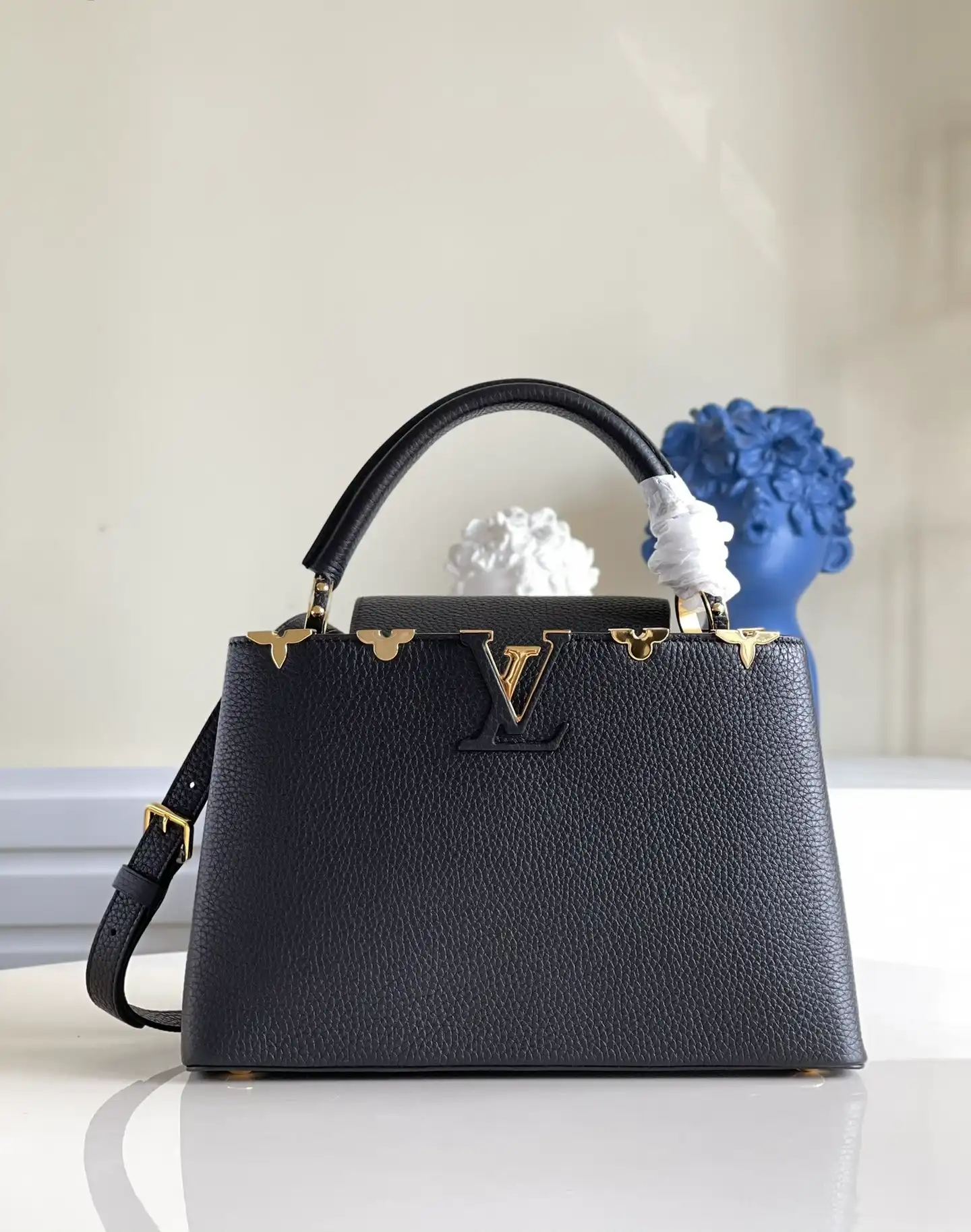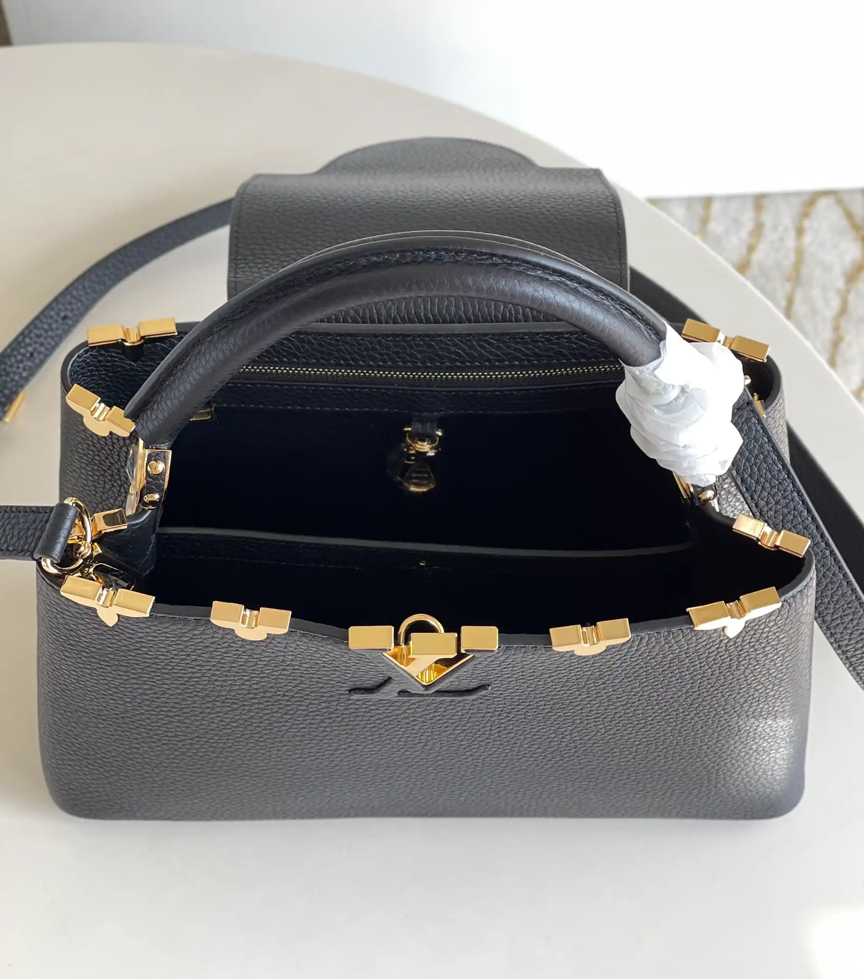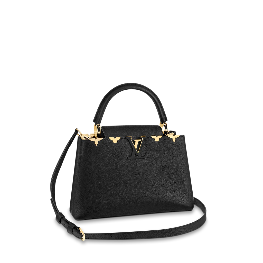 This season the House tells a new Capucines story. Embellished with a delicate frieze of metallic Monogram flowers, the emblematic bag is more feminine than ever. The MM model, in refined Noir with a crown of gold-toned blooms, is both elegant and practical.
